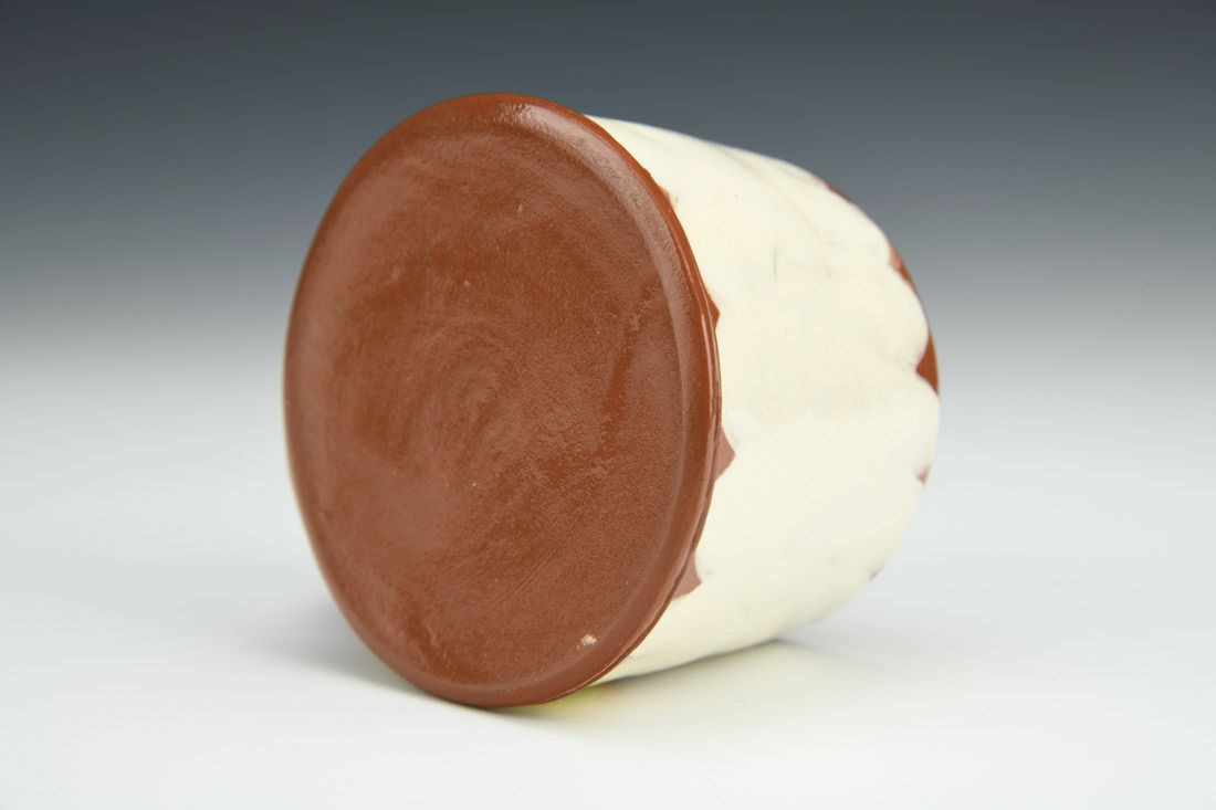 Red earthenware, wheel thrown and altered, slip, underglaze, glaze, cone 04 electric fired, 2.25 x 4 x 2.75 inches.