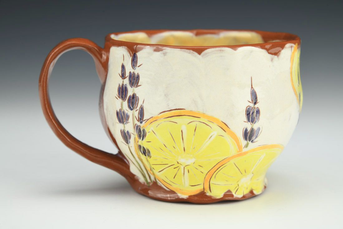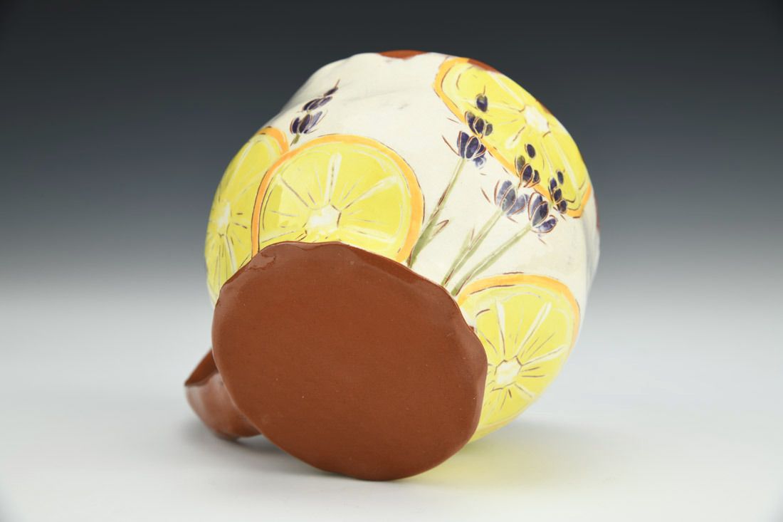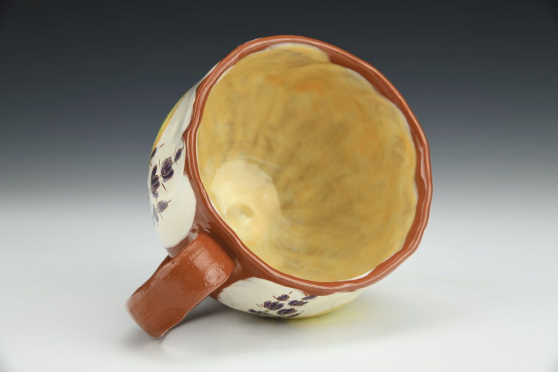 Red earthenware, wheel thrown and altered, slip, underglaze, glaze, cone 04 electric fired, 3 x 5 x 4 inches.