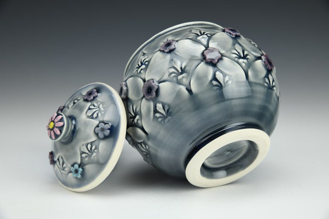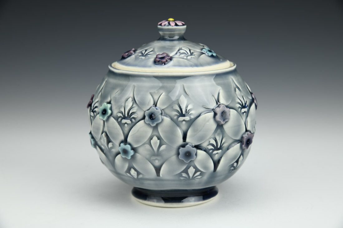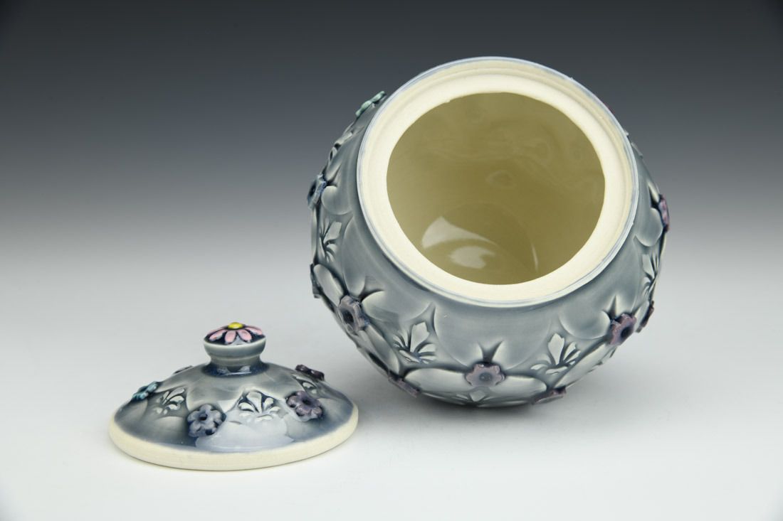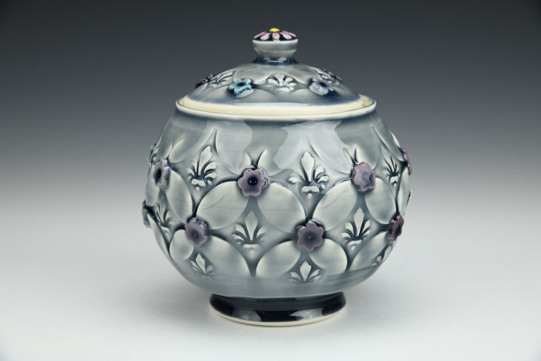 Porcelain, wheel thrown and altered, stained porcelain sprigs, oxidation fired, 4.75 x 4.5 x 4.5 inches.