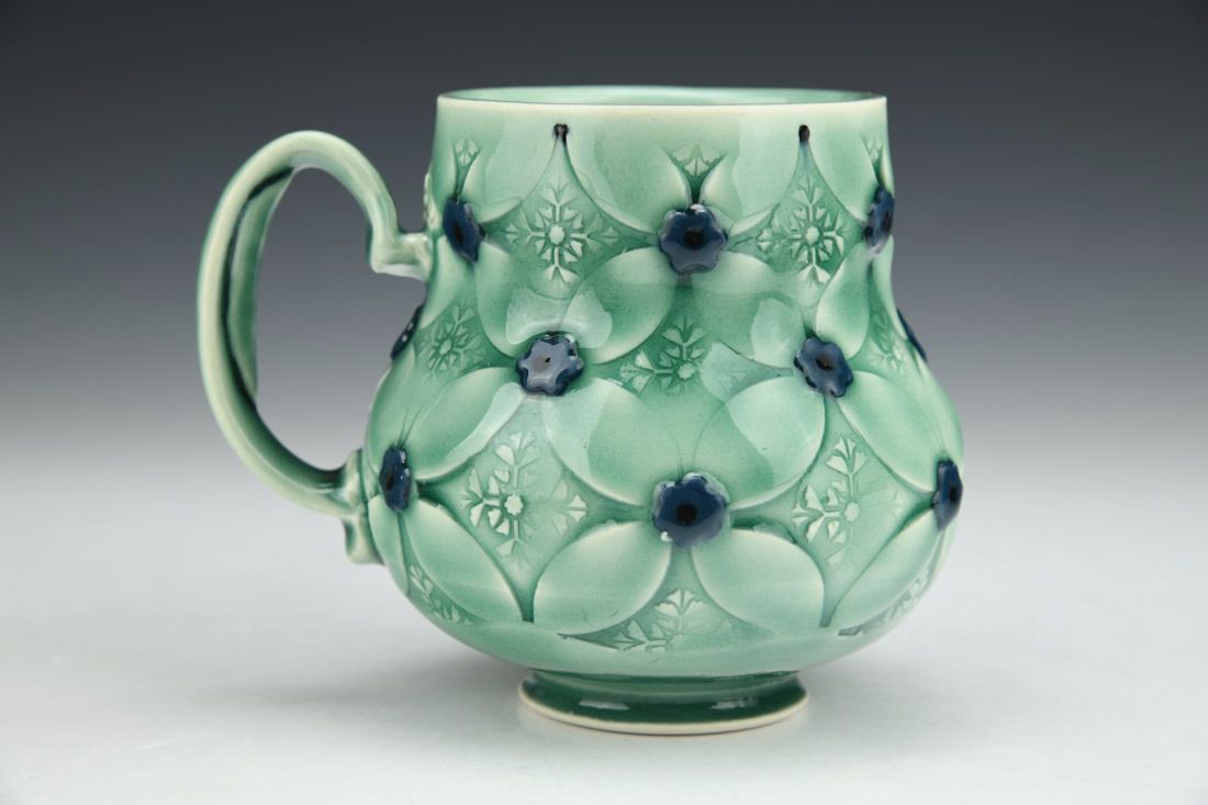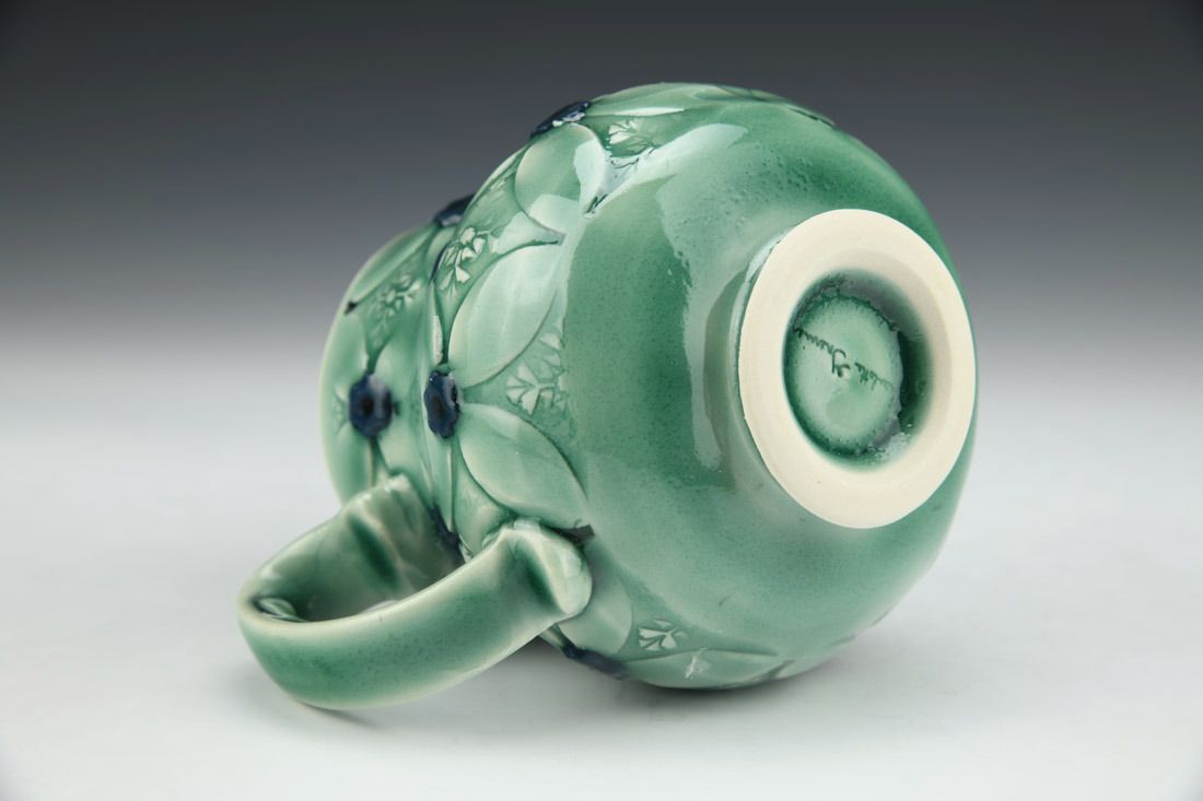 Porcelain, wheel thrown and altered, stained porcelain sprigs, oxidation fired, 4.25 x 5.25 x 4.25 inches.