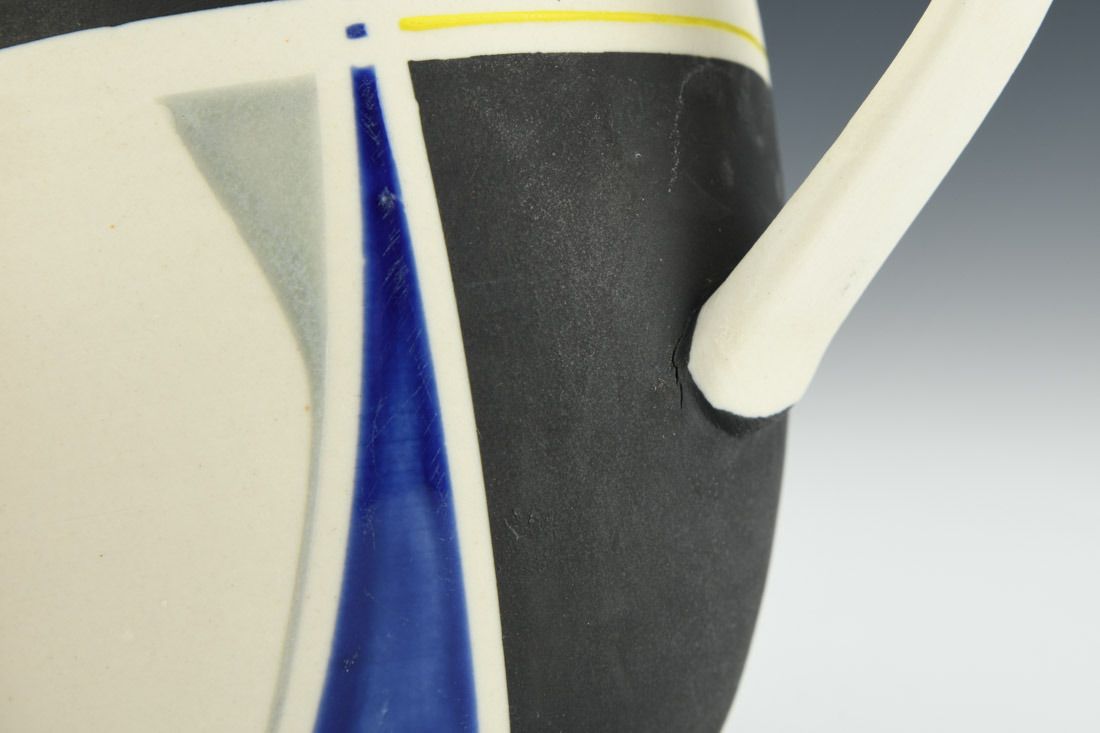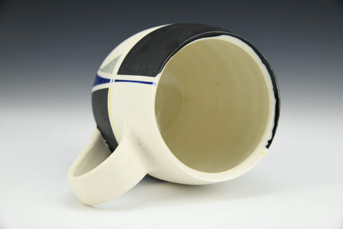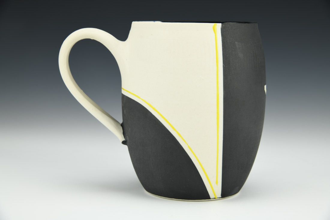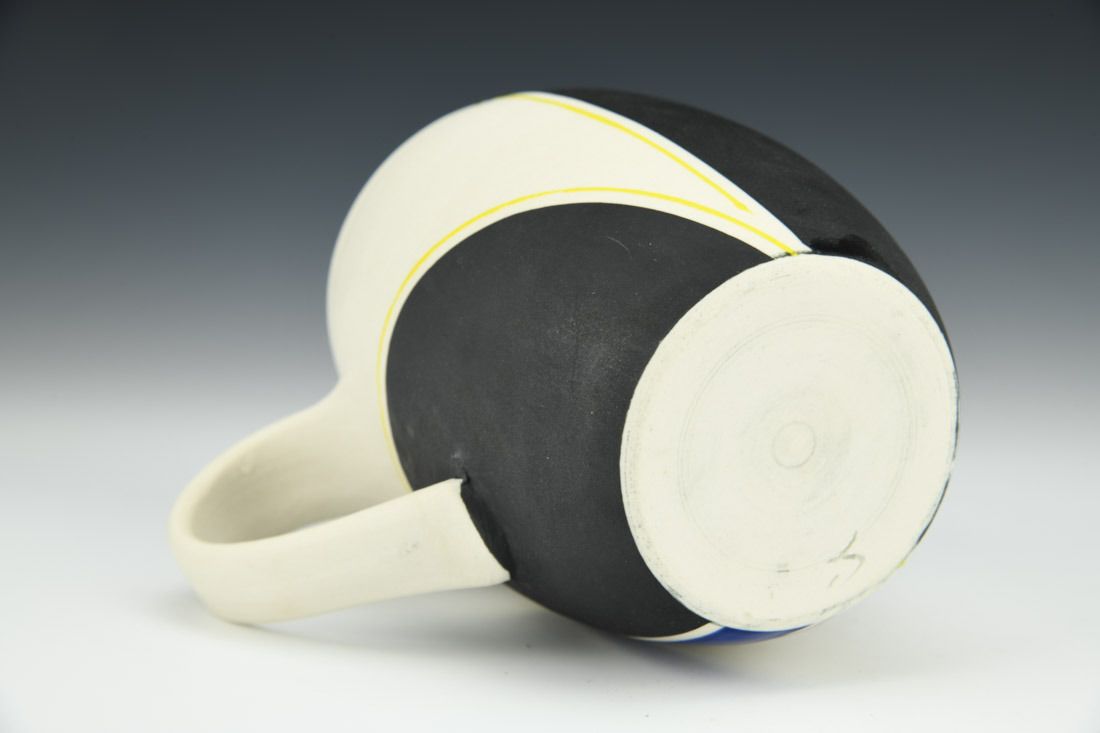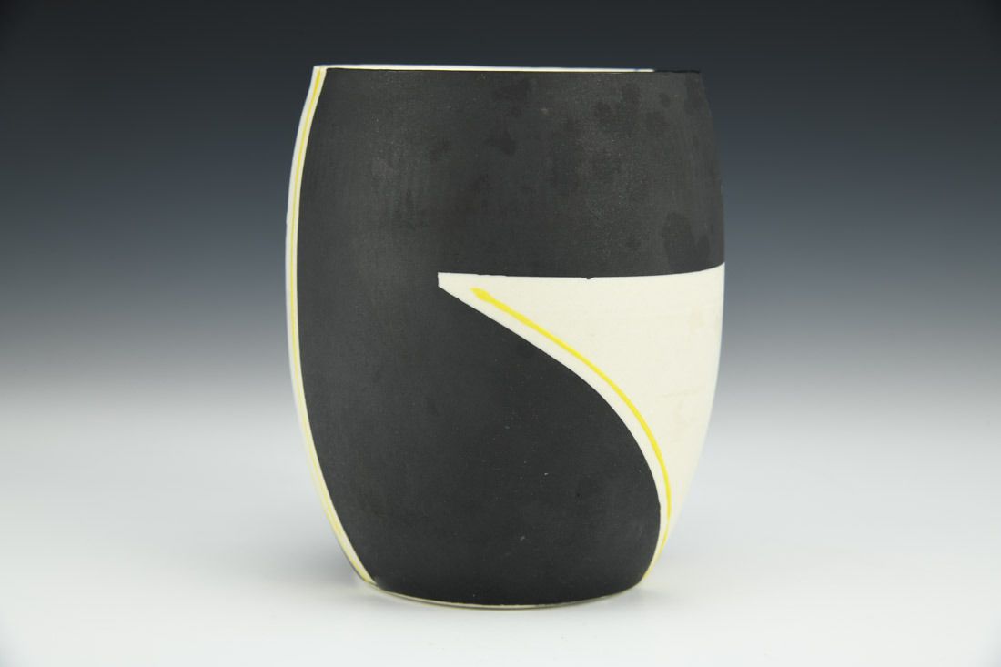 Porcelain, wheel thrown, tape resist, oxidation fired, 4.25 x 5.25 x 3.5 inches.