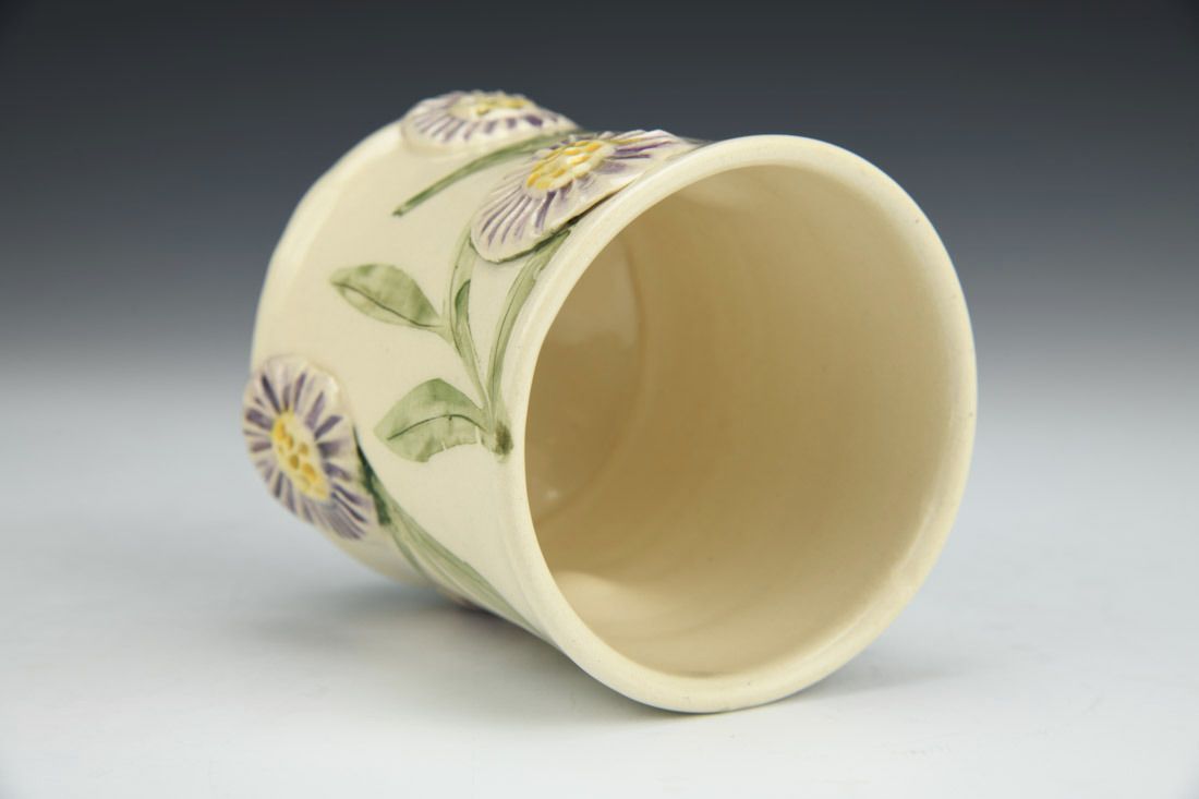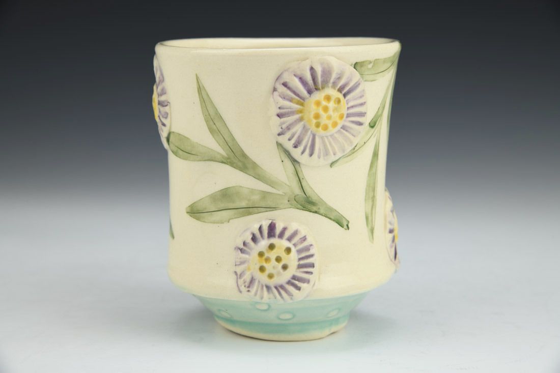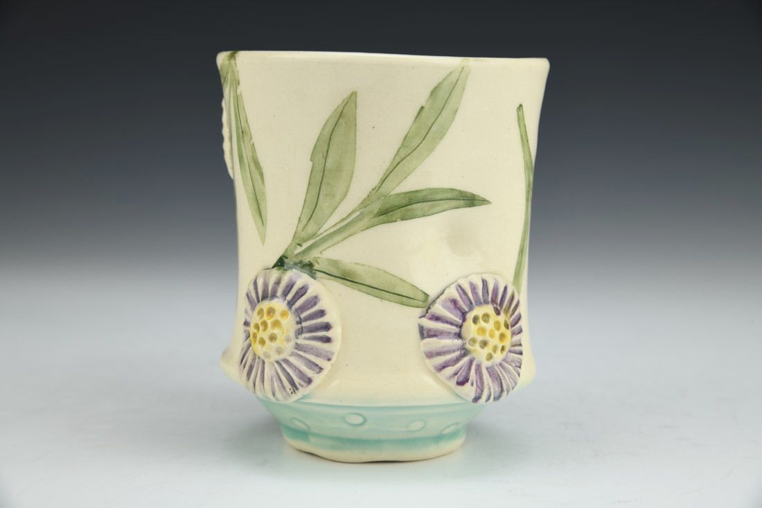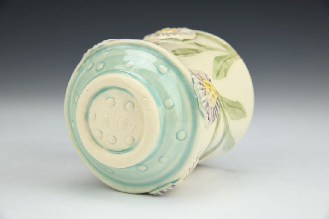 Stoneware, wheel thrown and hand built, sprigs, slip, underglaze, glaze, cone 6 fired, 4 x 3.5 x 3.5 inches.
