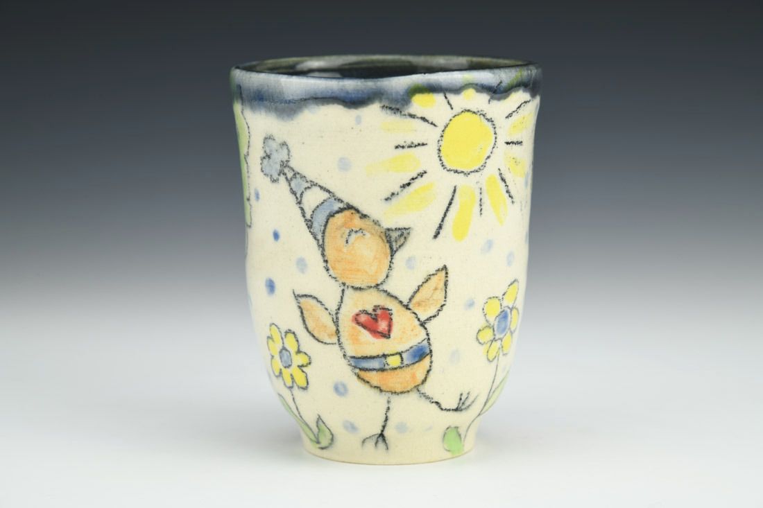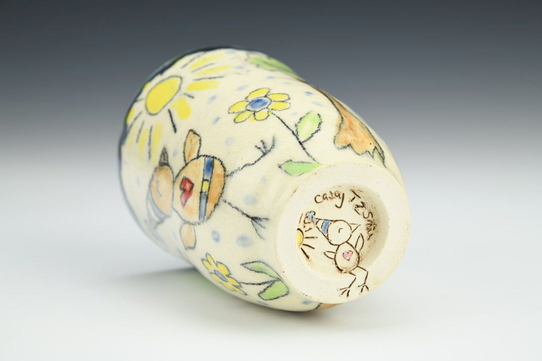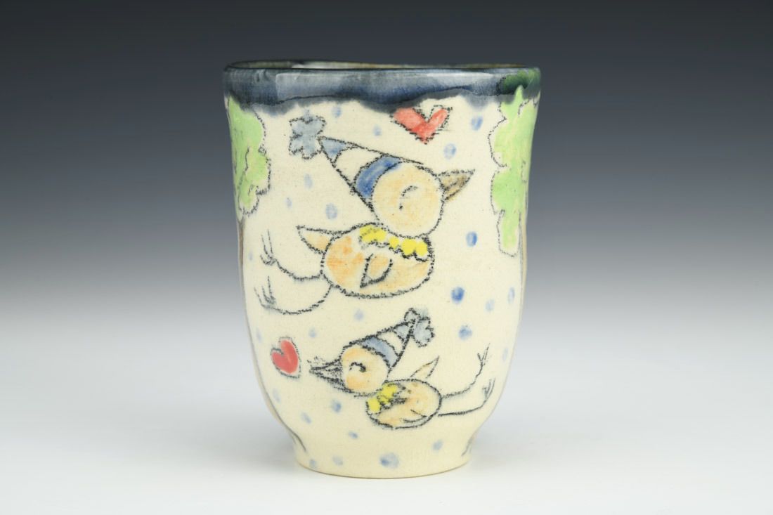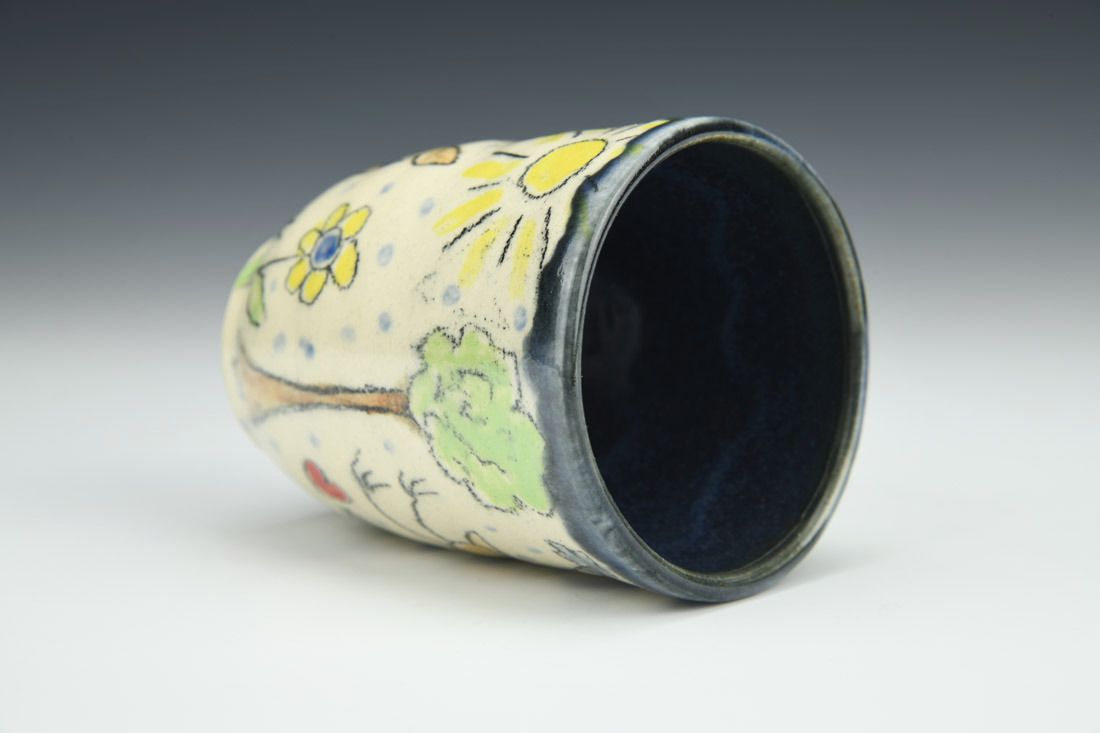 White stoneware, wheel thrown, underglaze, blue interior glaze, crackle exterior glaze, electric fired, 4 x 3 x 3 inches.