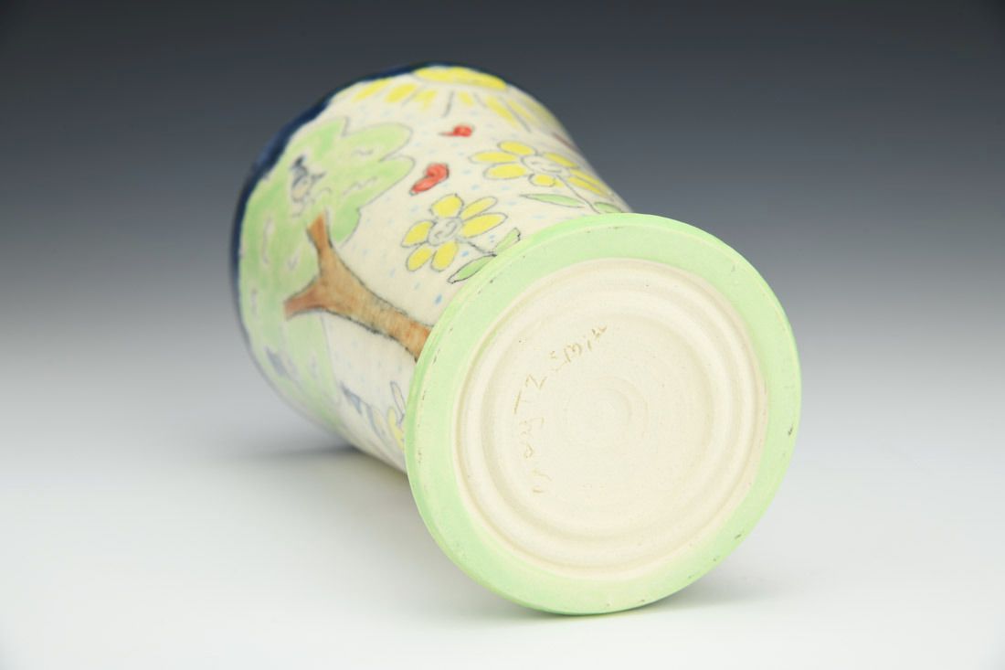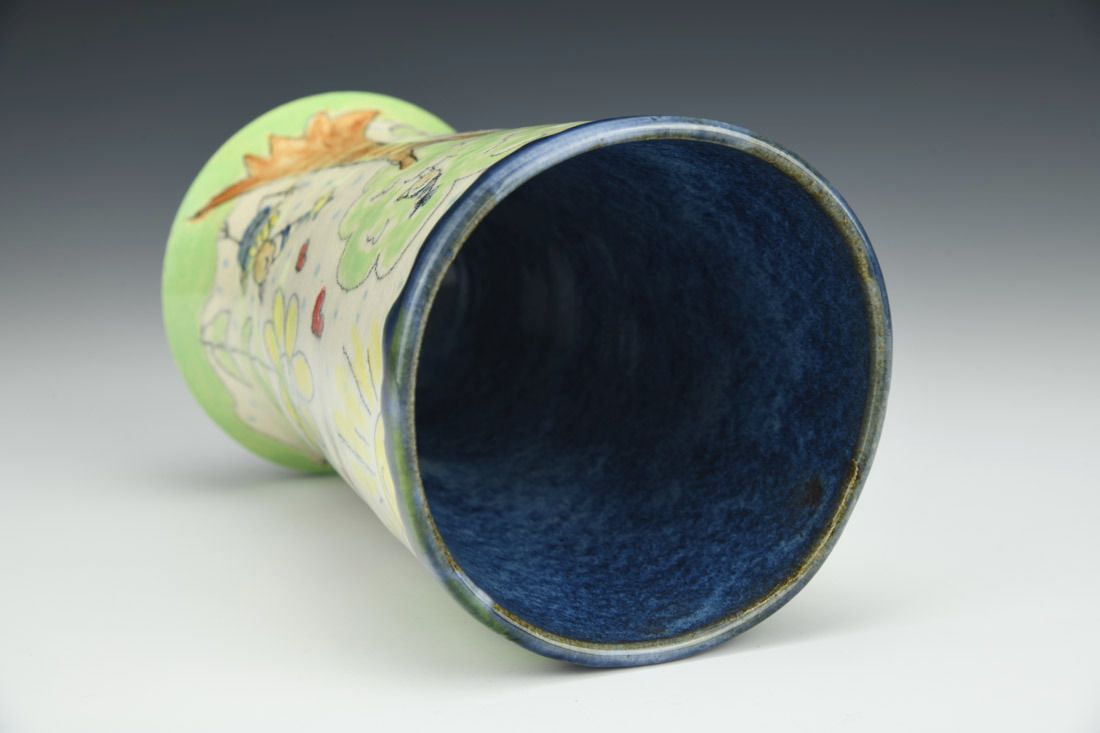 White stoneware, wheel thrown, underglaze, blue interior glaze, crackle exterior glaze, electric fired, 6 x 4.25 x 4.25 inches.