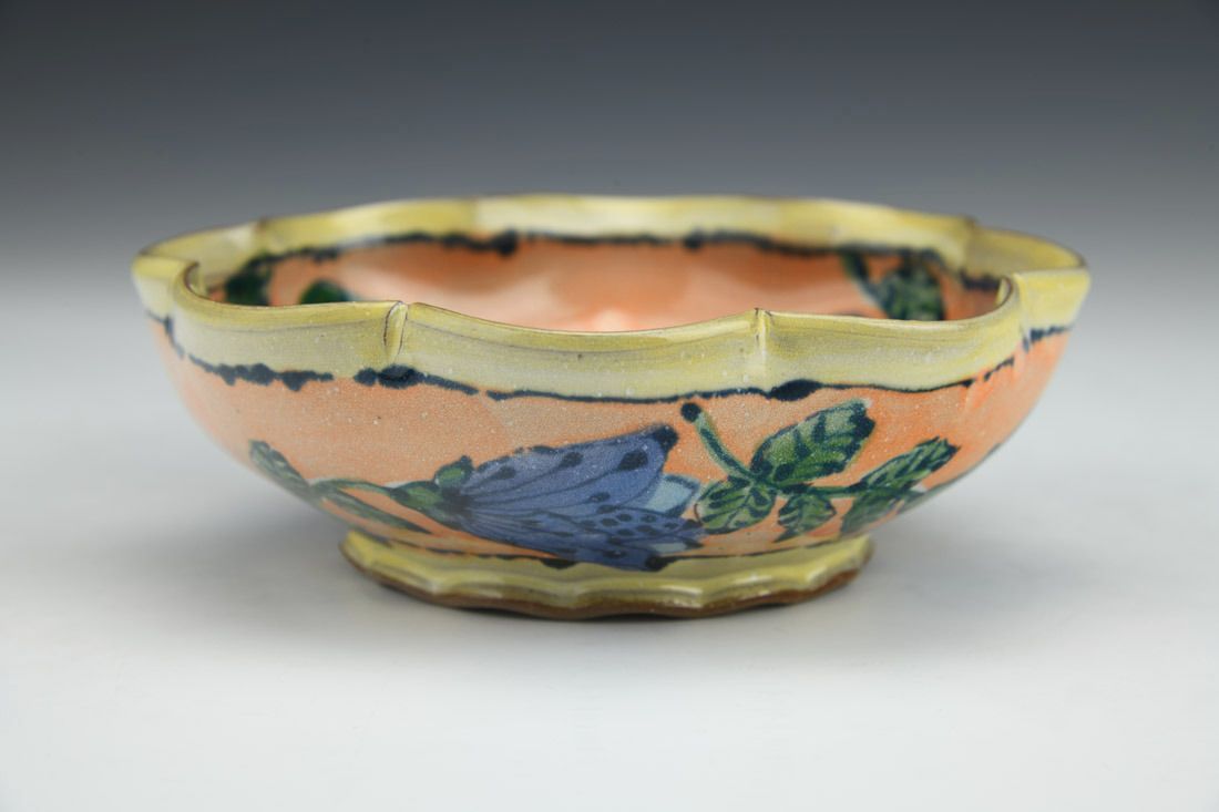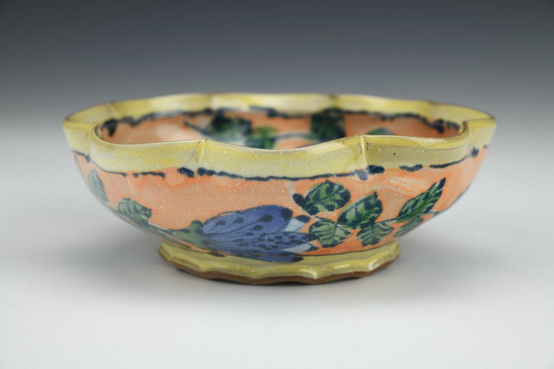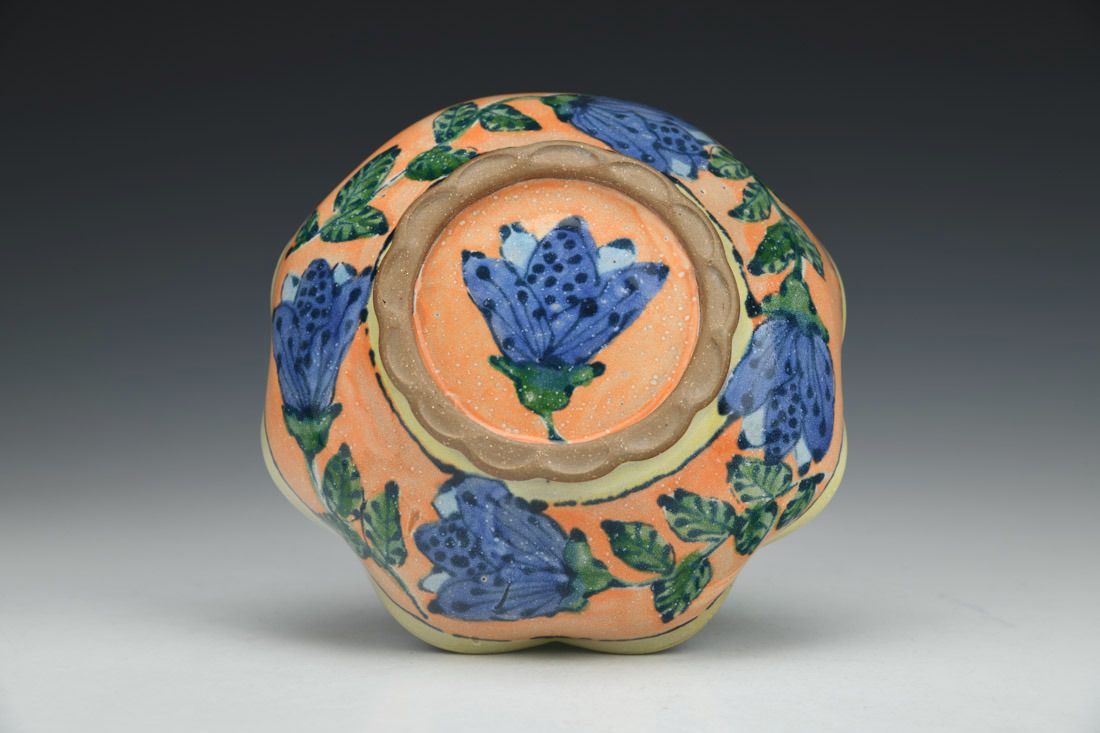 Red clay, wheel thrown, hand decorated, glazes, cone 6 eletric fired, 2 x 5.5 x 5.5 inches.