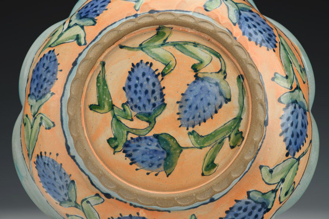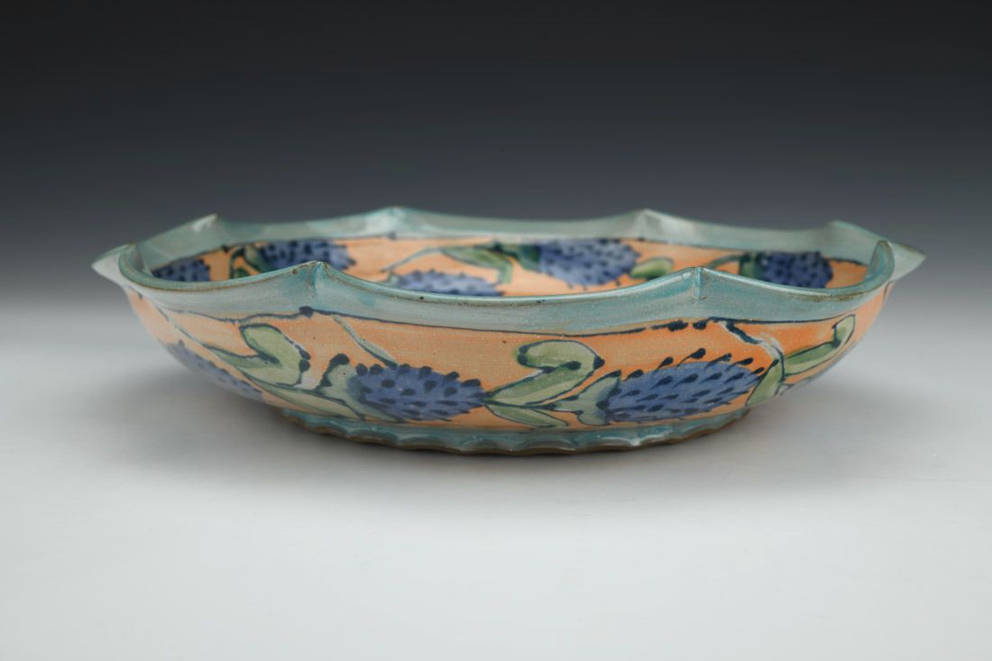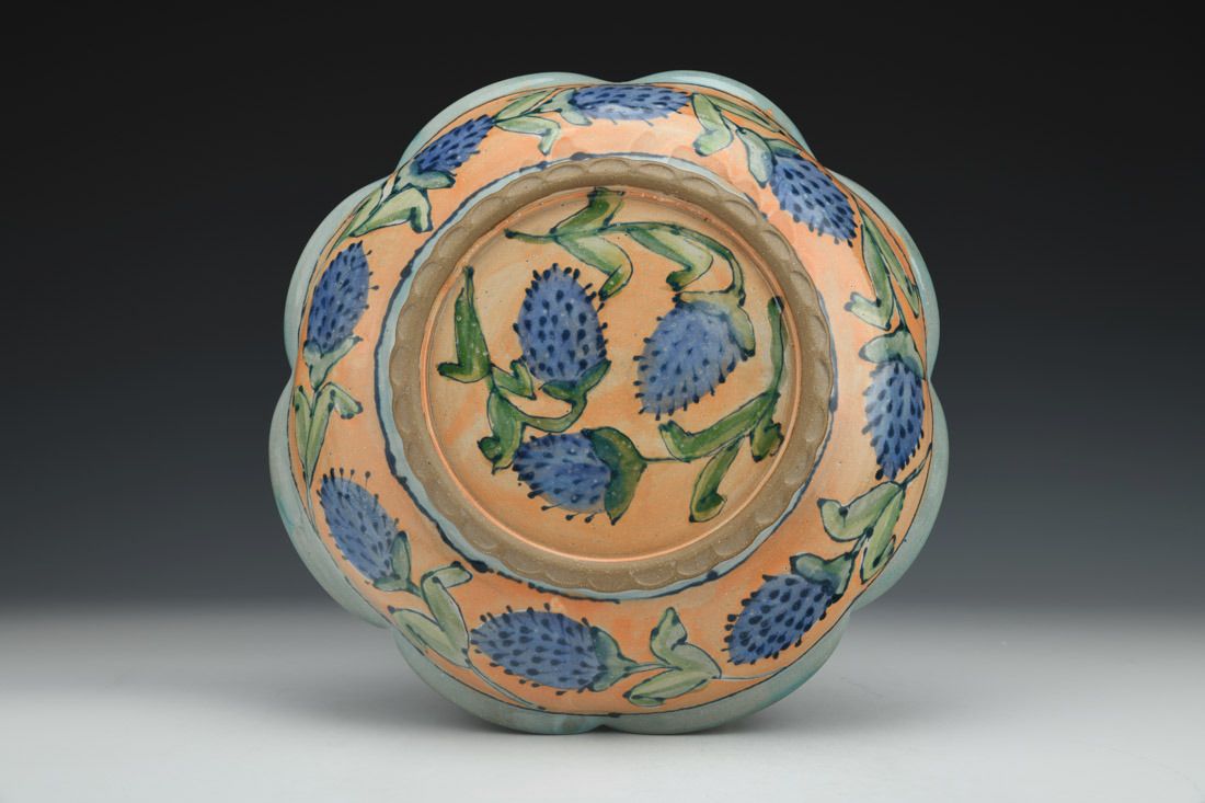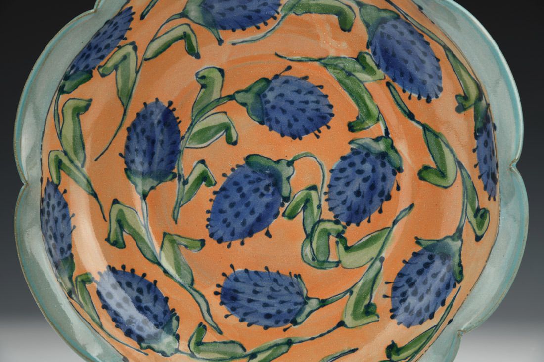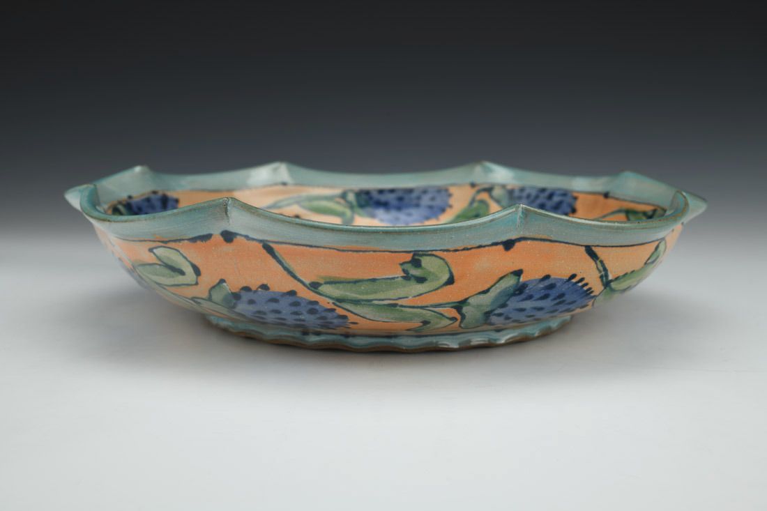 Red clay, wheel thrown, hand decorated, glazes, cone 6 eletric fired, 2.5 x 11 x 11 inches.