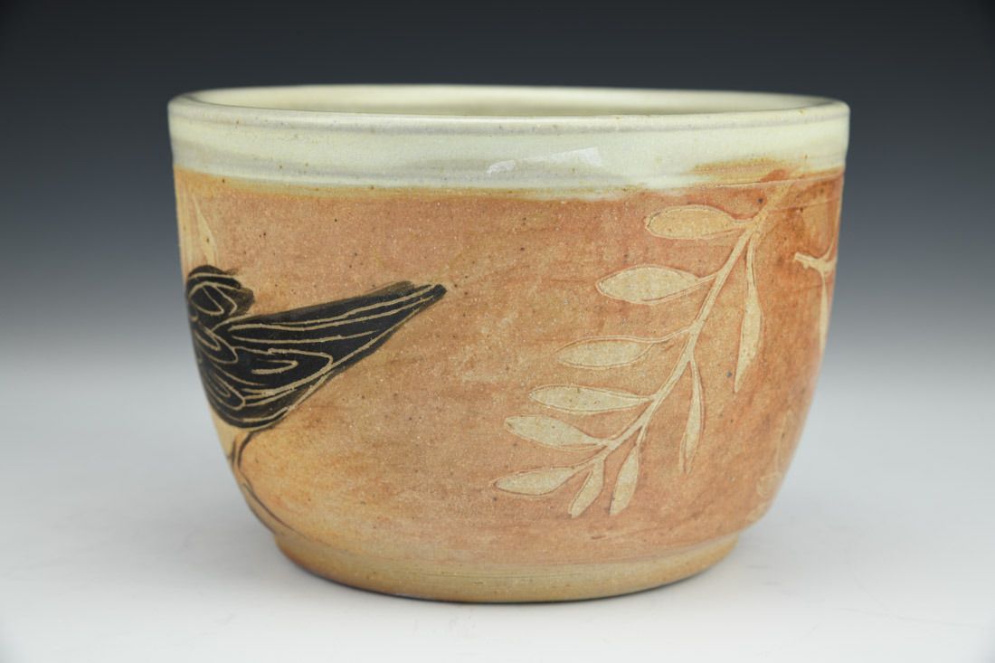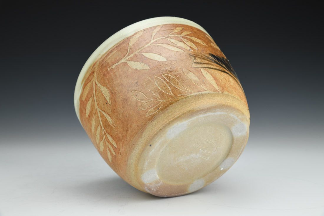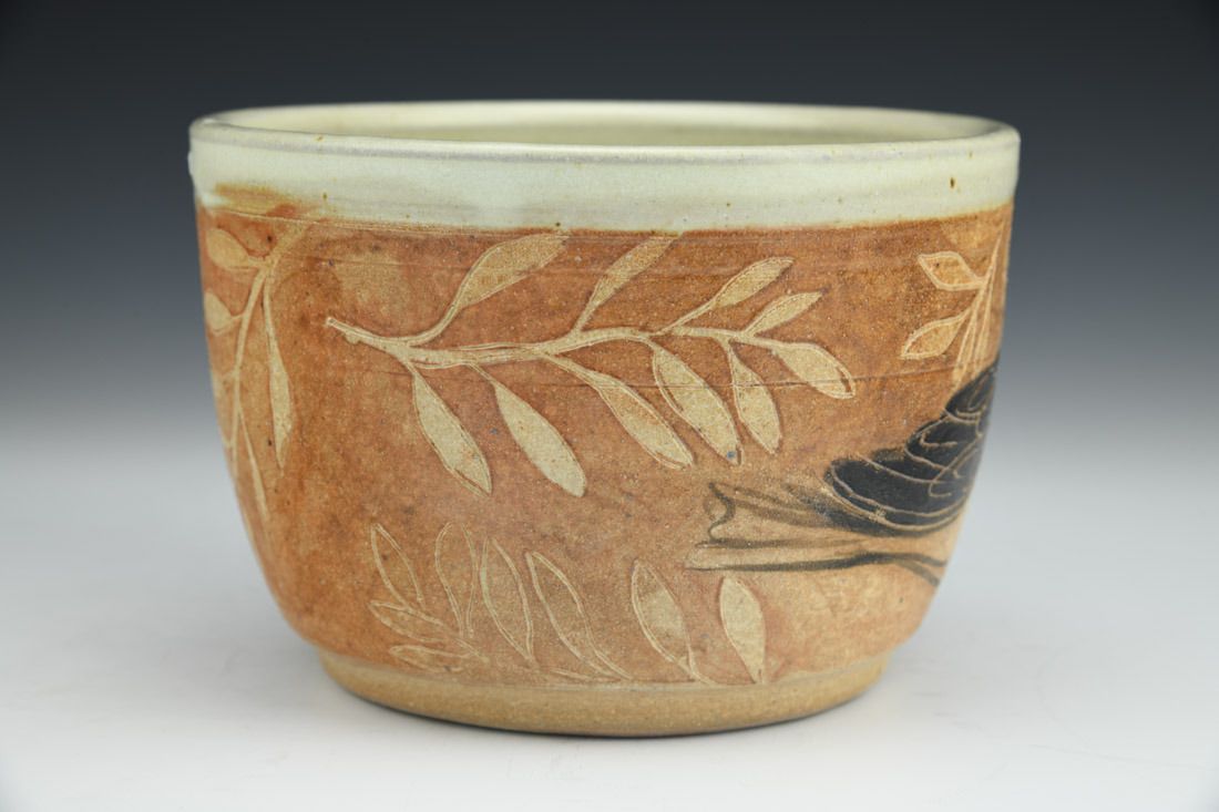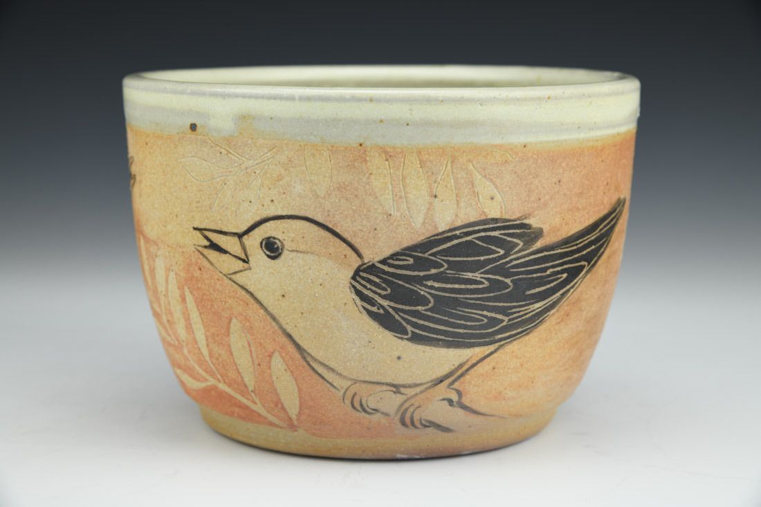 Wheel thrown, paper resist, soda fired, 4 x 5.75 x 5.75 inches.
