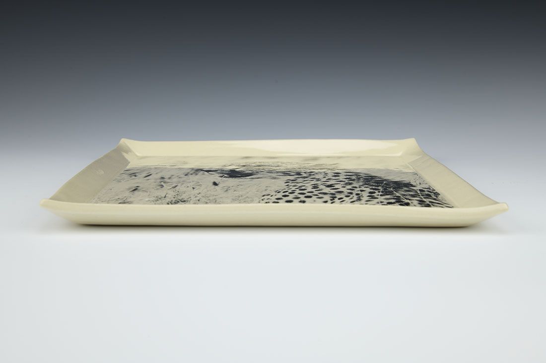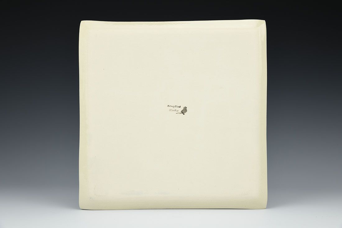 White stoneware, hand built with slabs, decal, cone 6 electric fired, 0.75 x 9.5 x 9.5 inches.