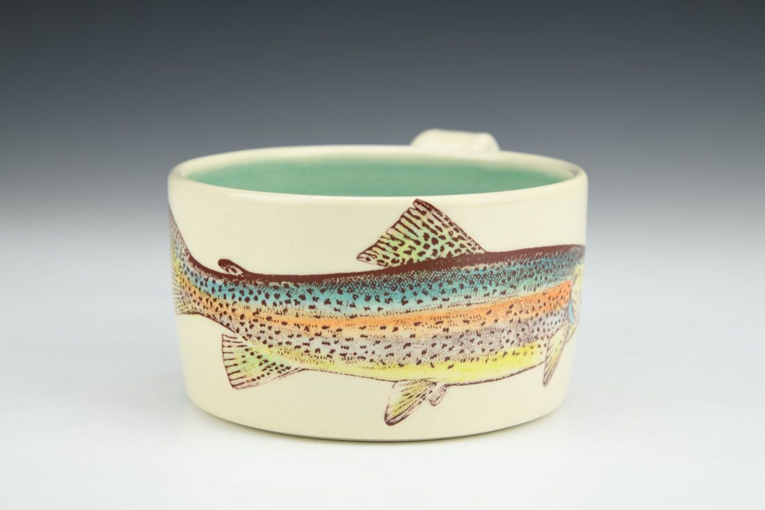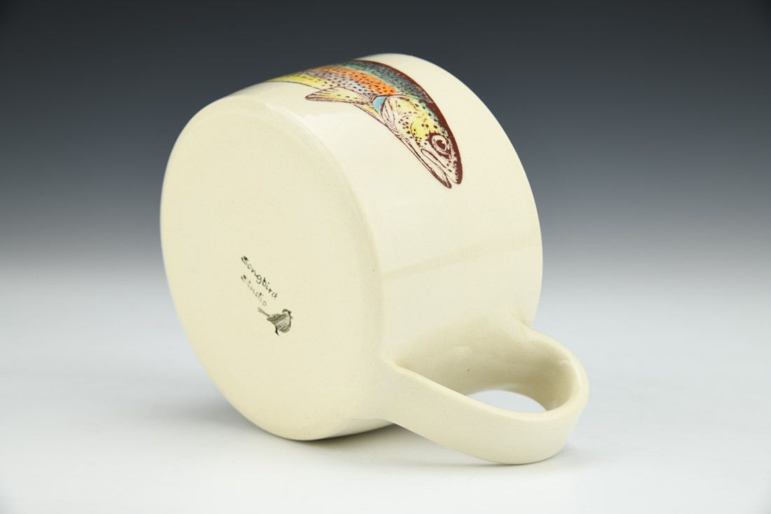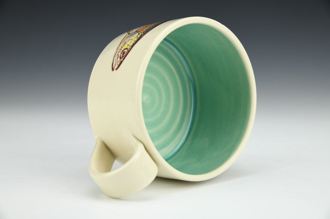 White stoneware, wheel thrown, decal, cone 6 electric fired, 2.25 x 5.25 x 4 inches.