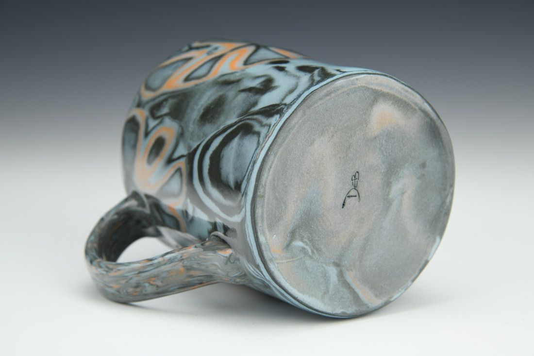 Black stained porcelain, laminated colored clay, hand built with slabs, glaze, cone 10 oxidation fired, 4 x 4.5 x 3.25 inches.