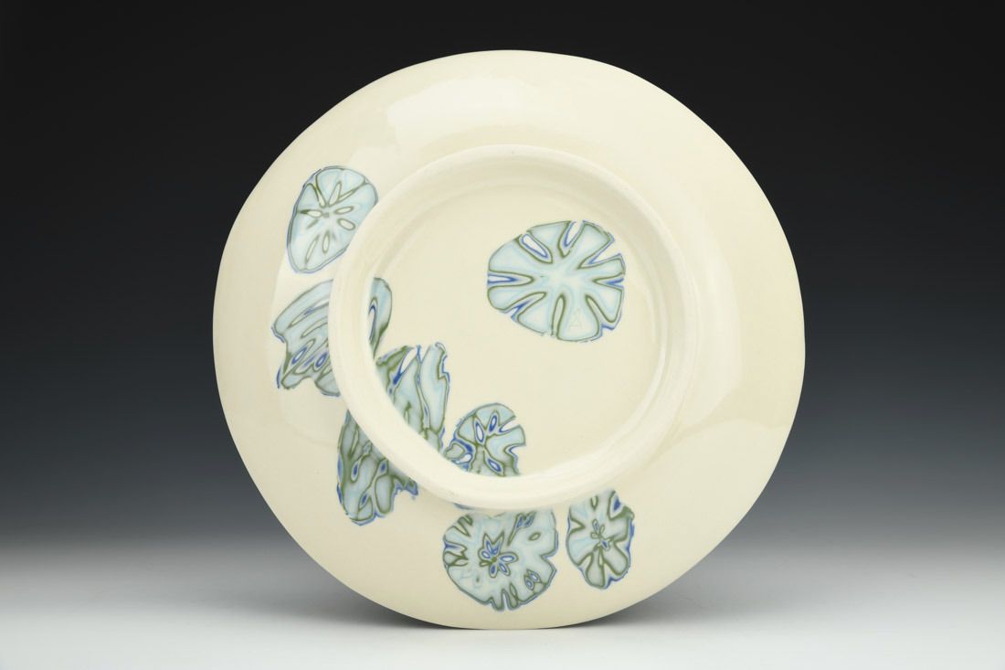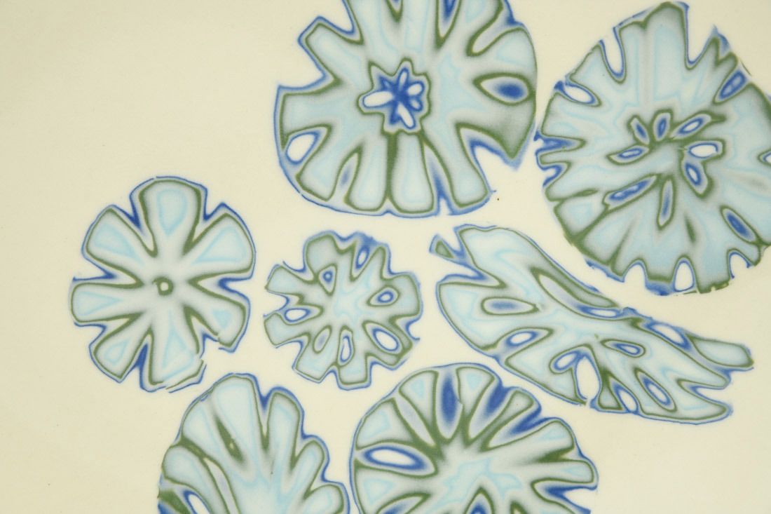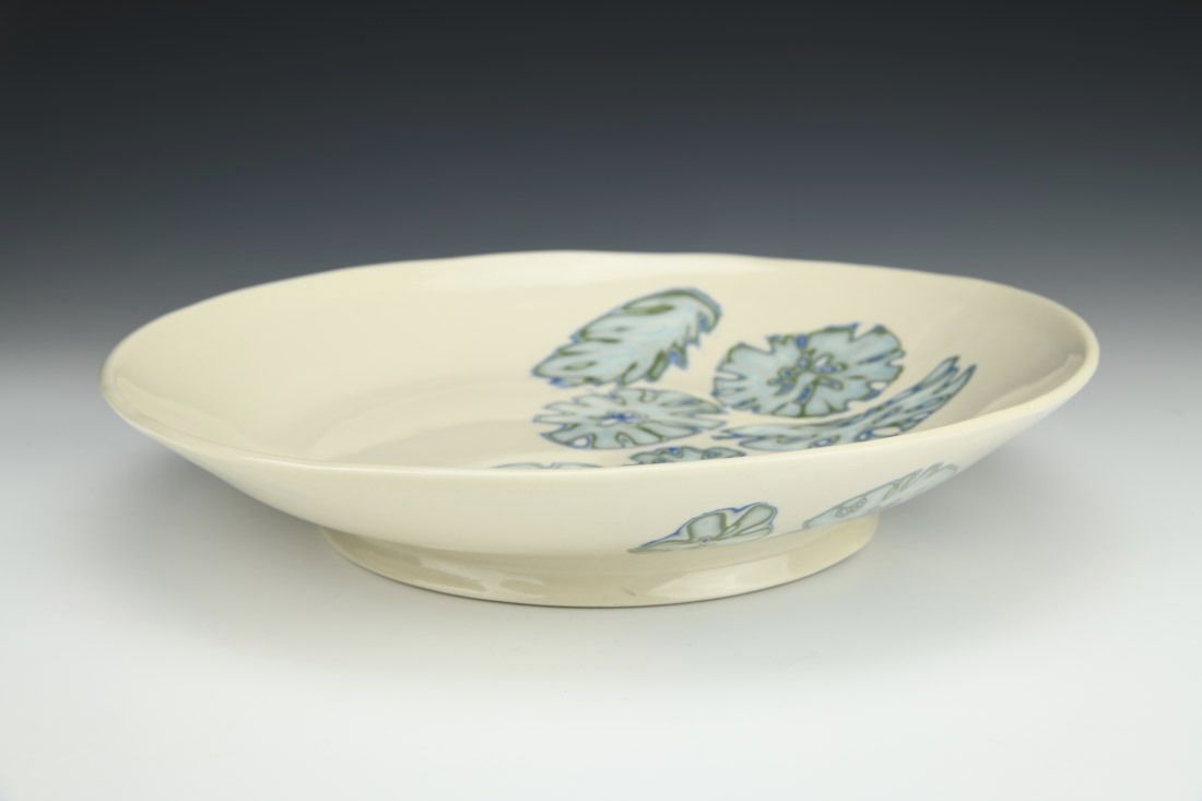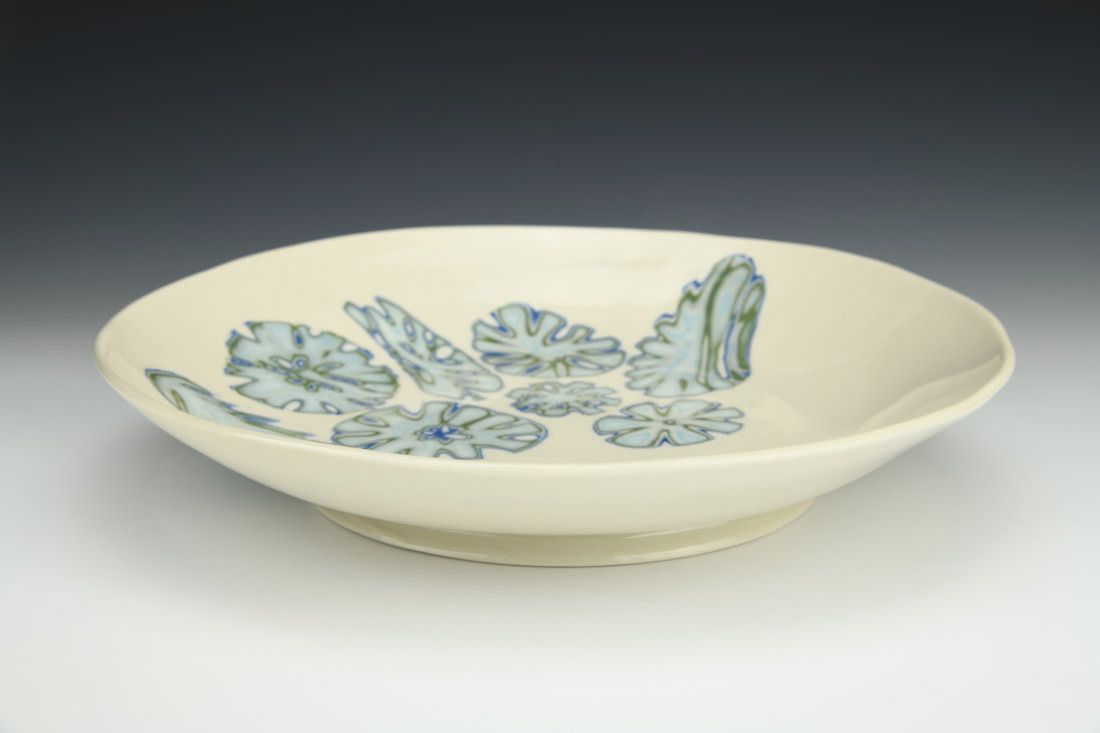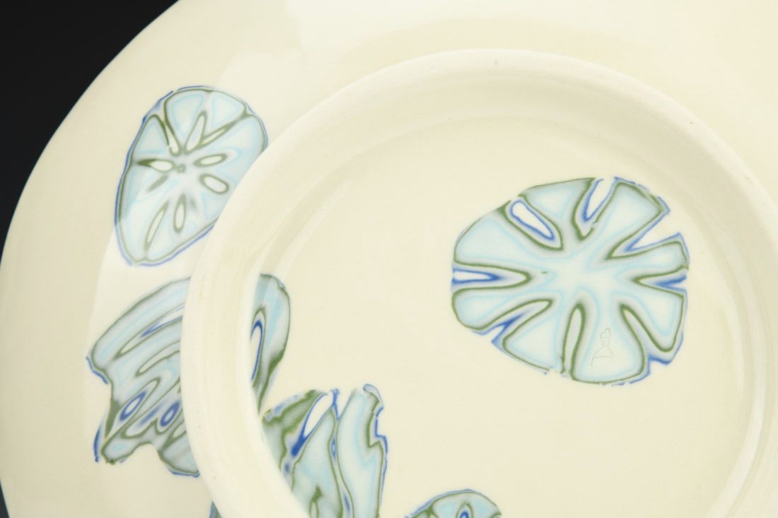 Porcelain, laminated colored clay, hand built with slabs, glaze,cone 6 oxidation fired, 2.5 x 12 x 12 inches.