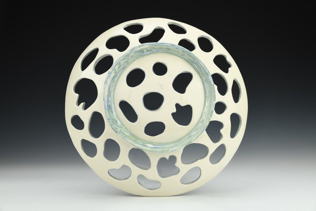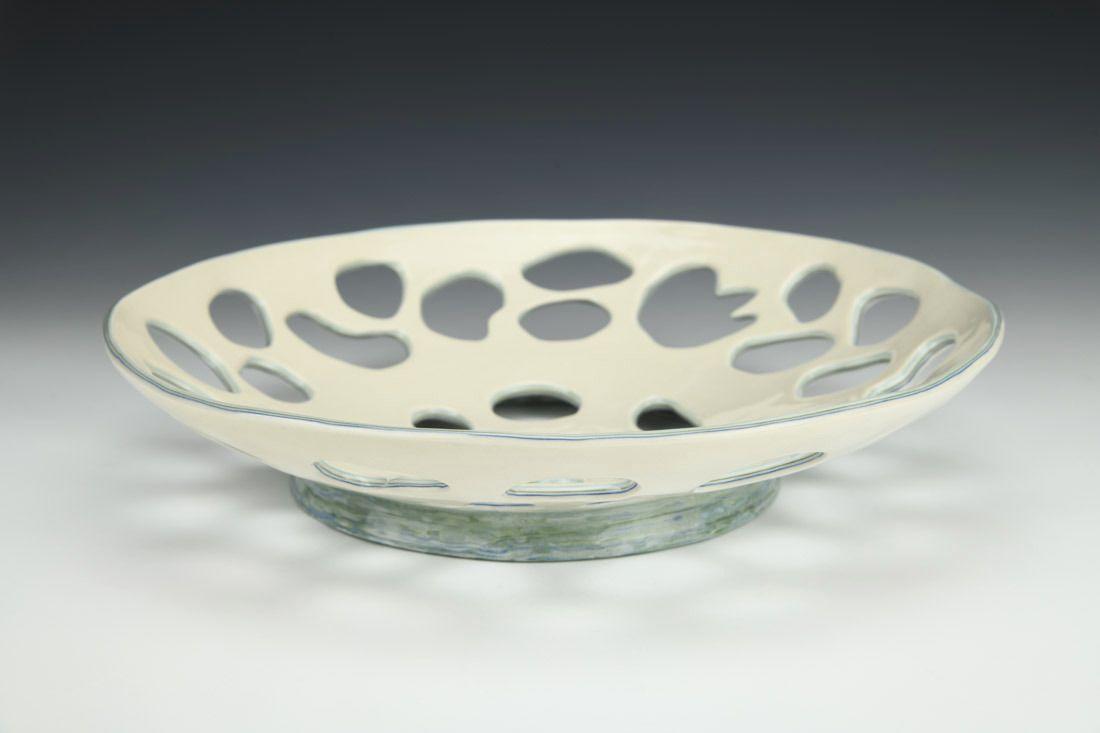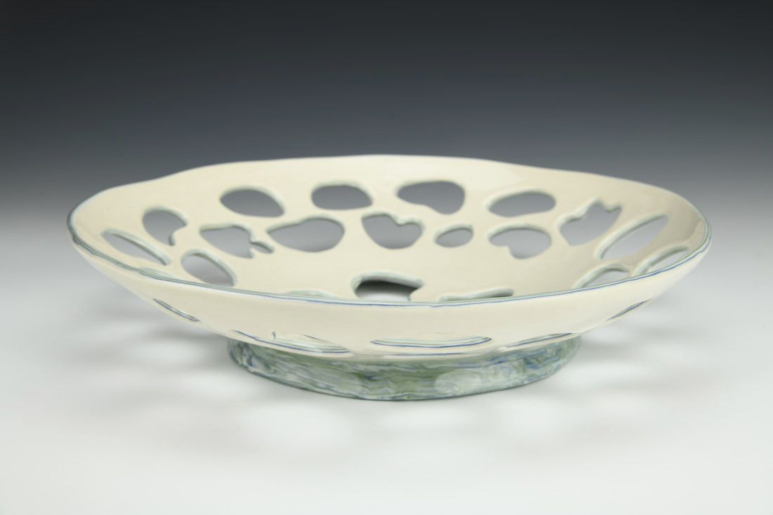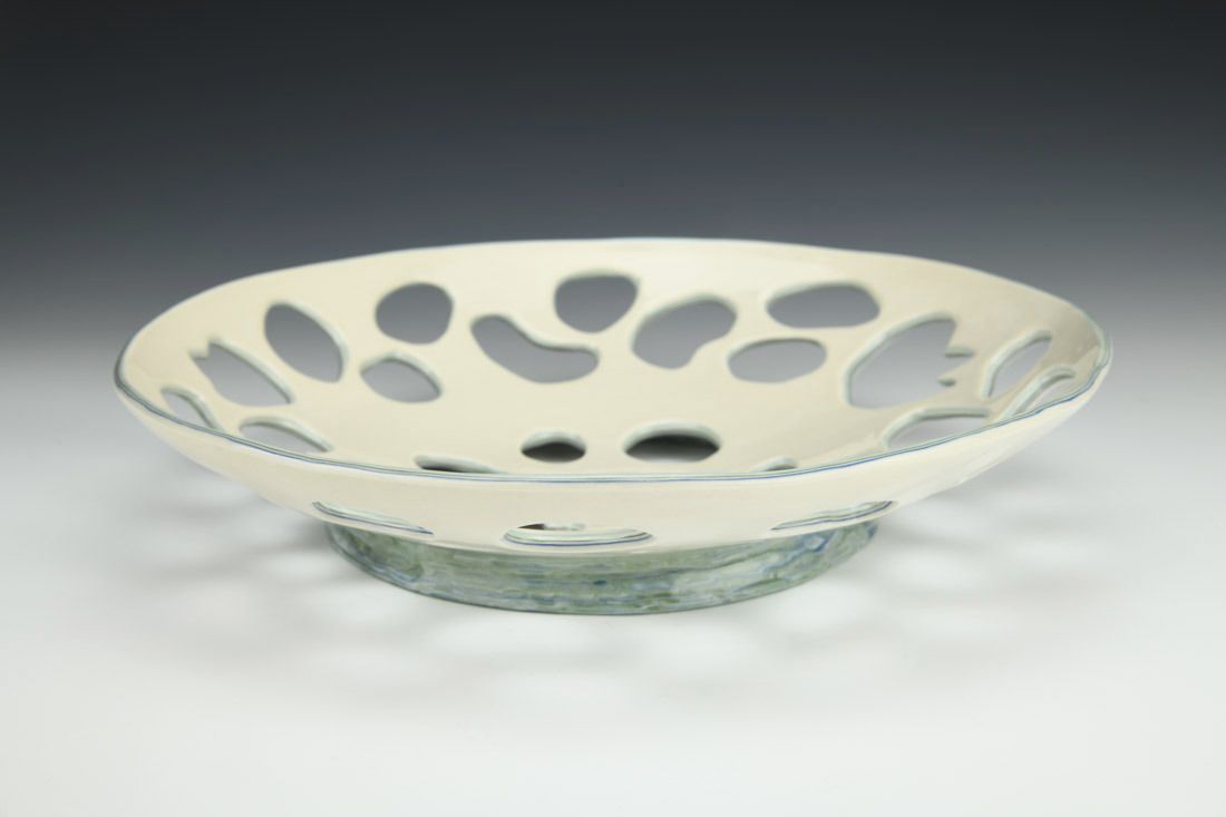 Porcelain, colored clay, hand built with slabs, carved, glaze,cone 6 oxidation fired, 2.5 x 12 x 12 inches.
