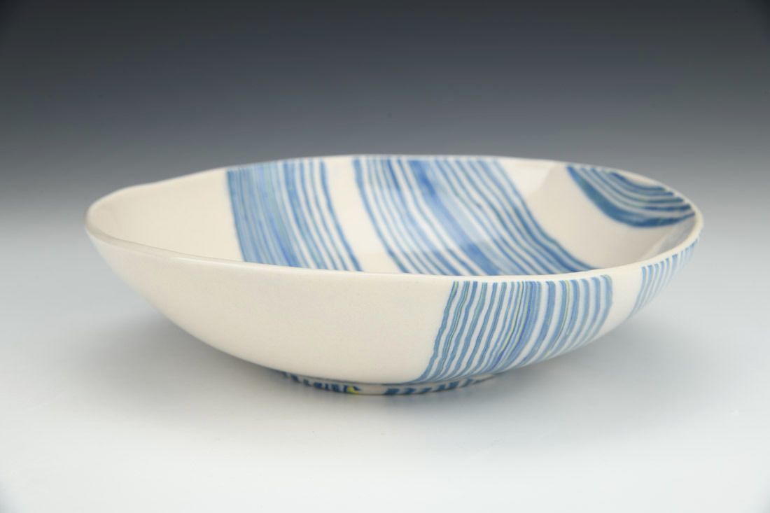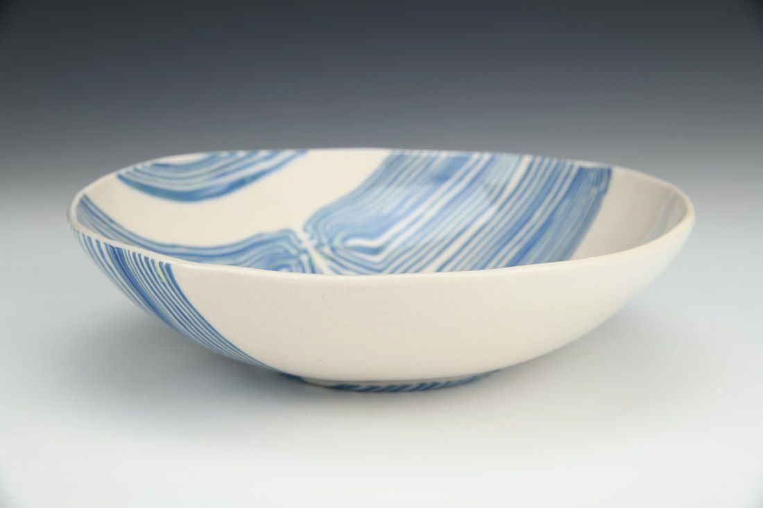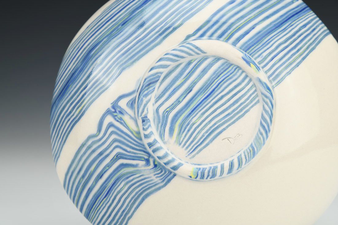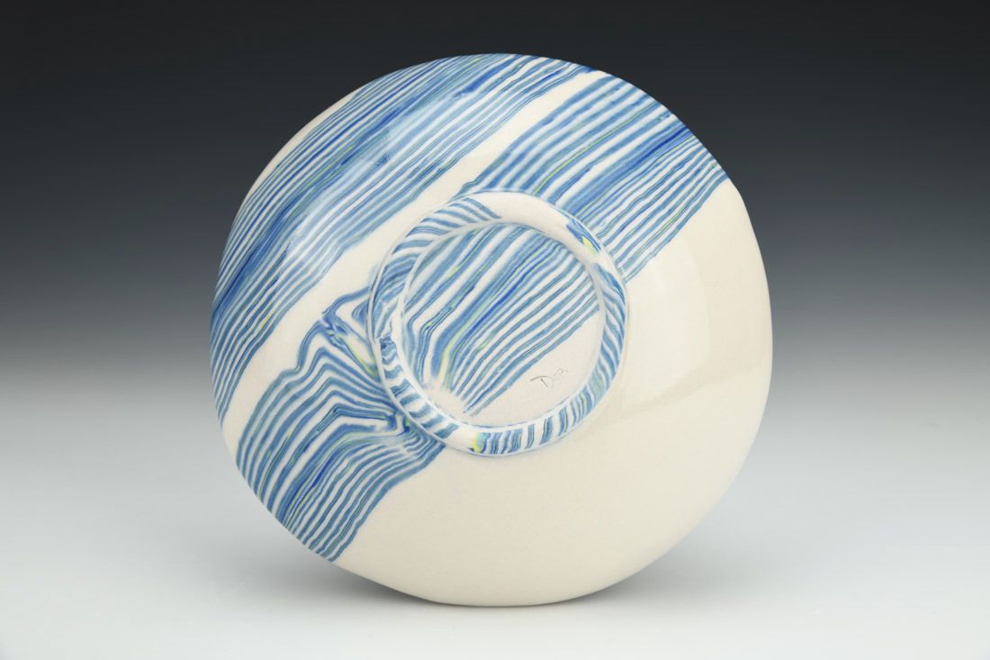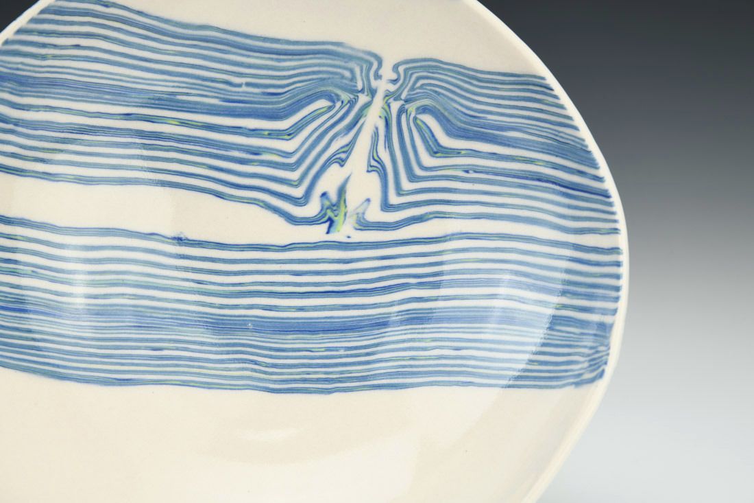 Porcelain, laminated colored clay, hand built with slabs, glaze, cone 6 oxidation fired, 2 x 7.5 x 7.5 inches.