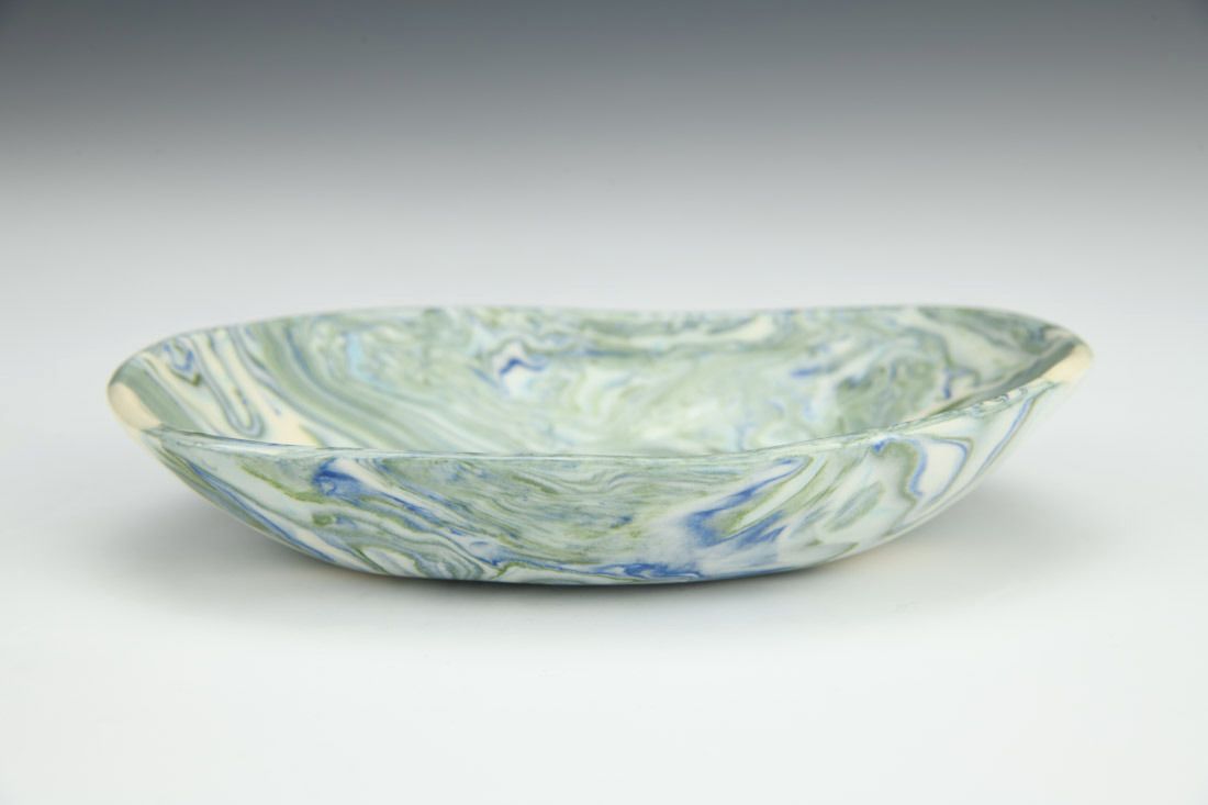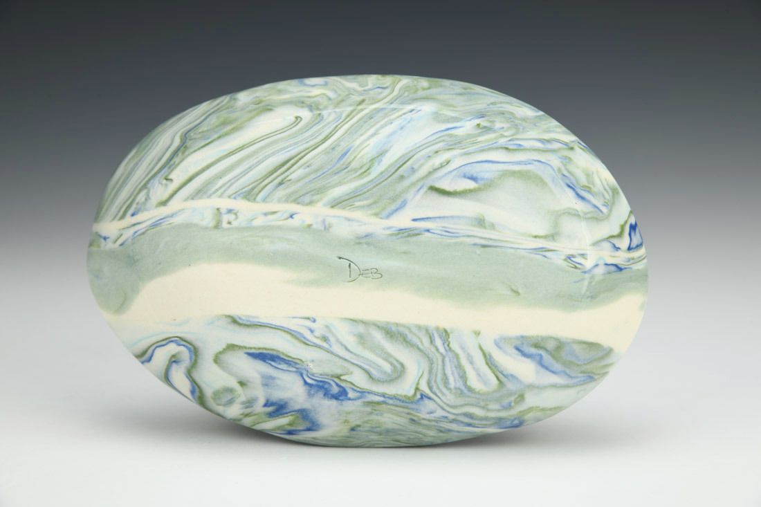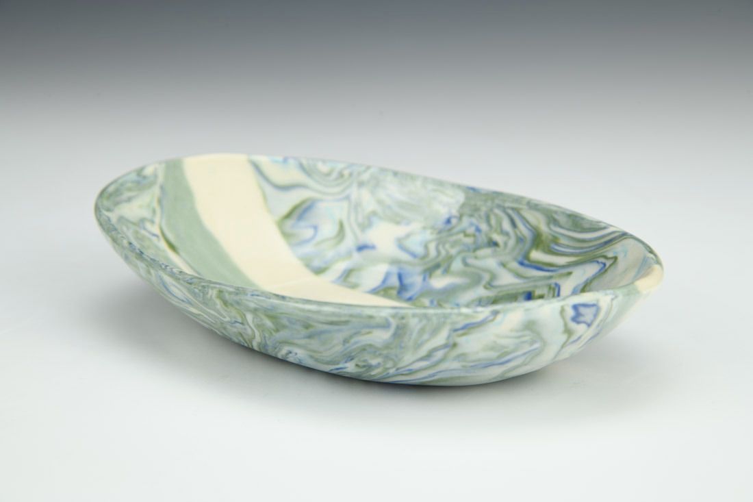 Porcelain, hand built with slabs, glaze, cone 6 oxidation fired, 1 x 5.5 x 4 inches.