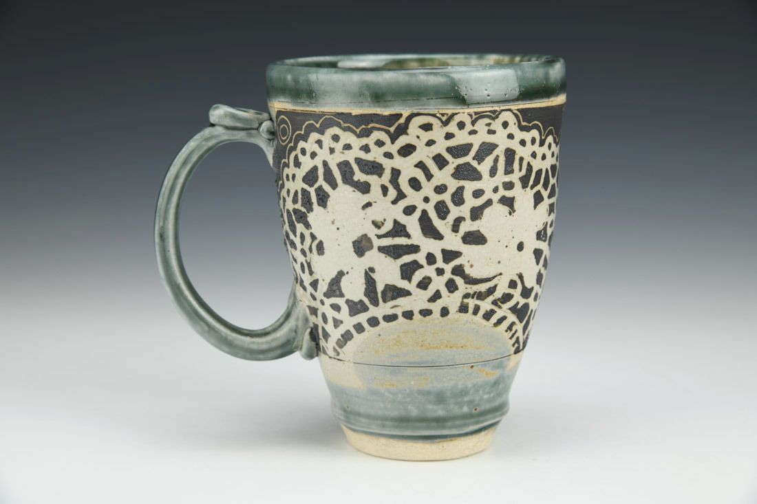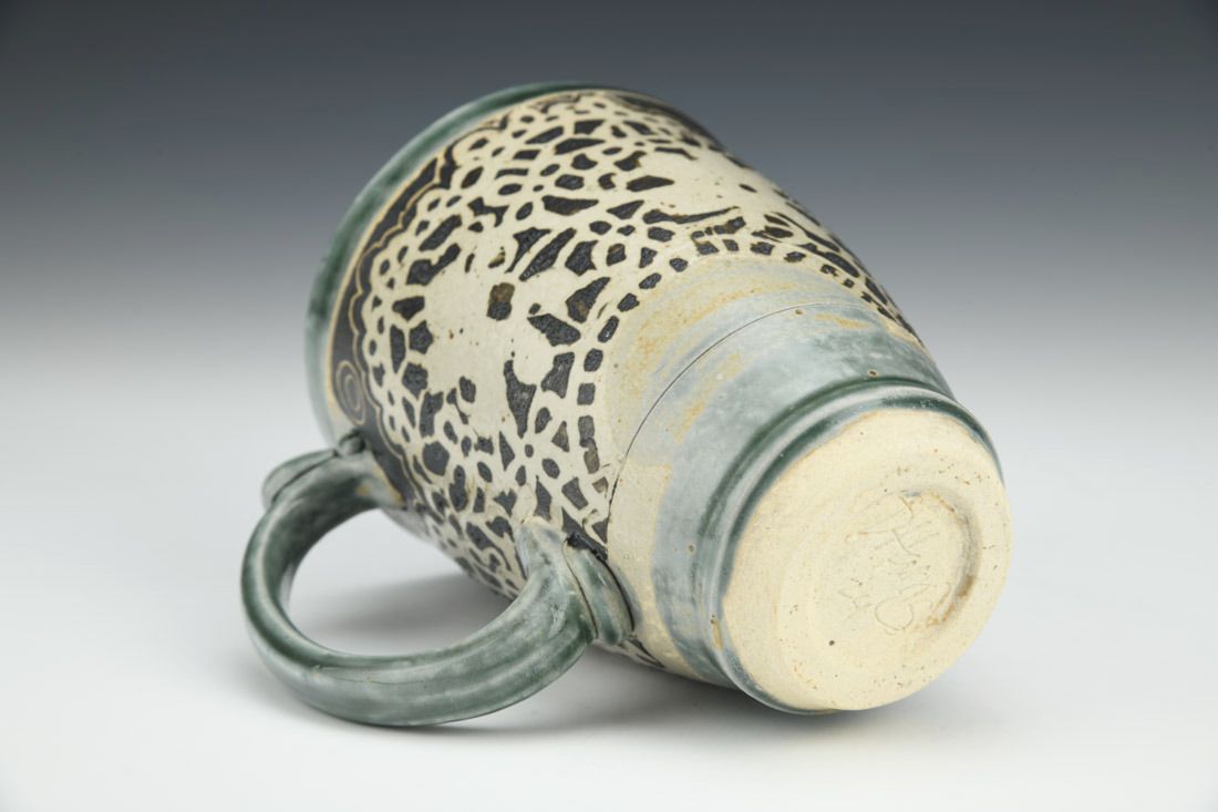 Stoneware, wheel thrown, black underglaze, glaze, cone 10/11 reduction fired, 4.75 x 5 x 3.5 inches.