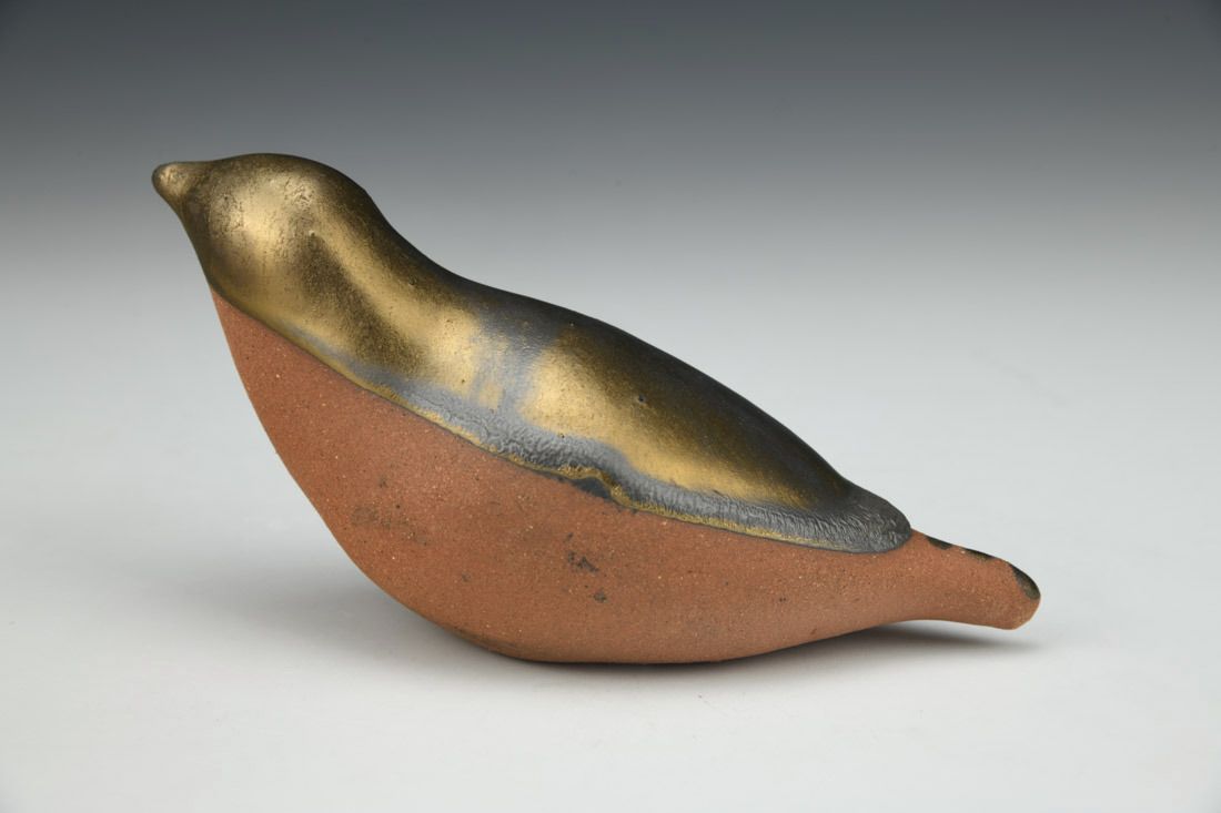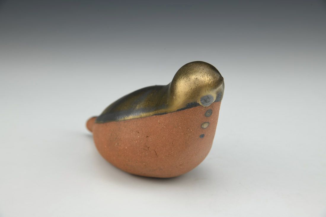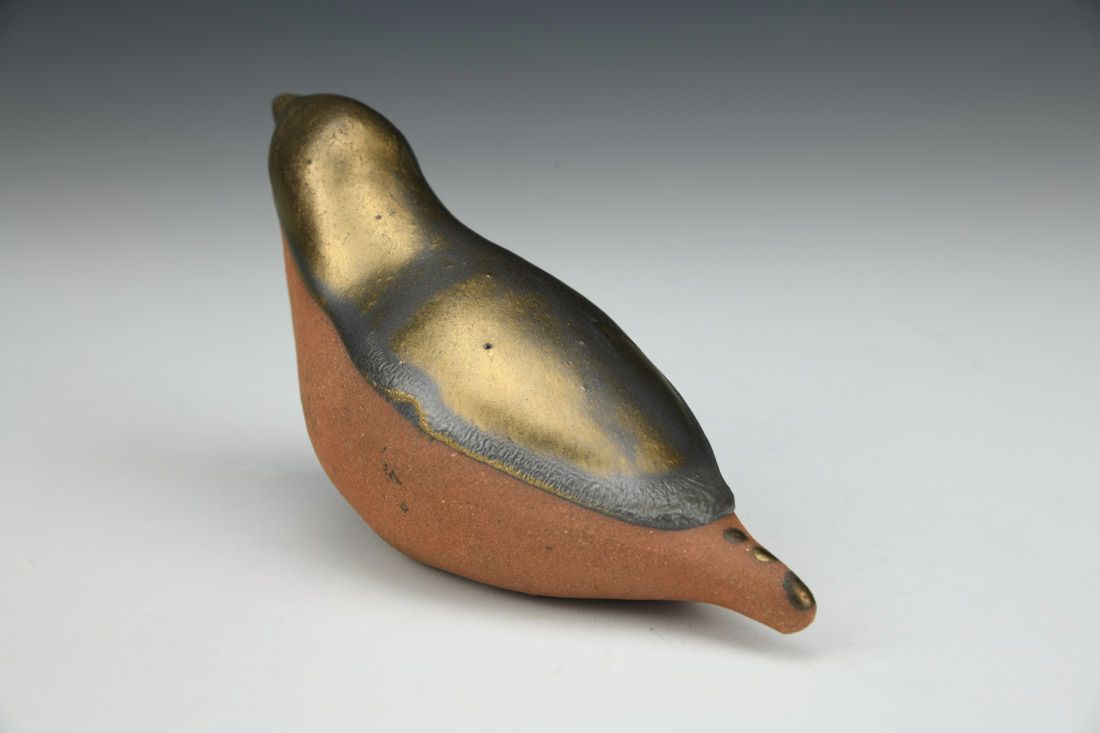 Stoneware, hand built and pinched, paddled, high manganese glaze, cone 6 electric fired, 3 x 5.75 x 2.5 inches.