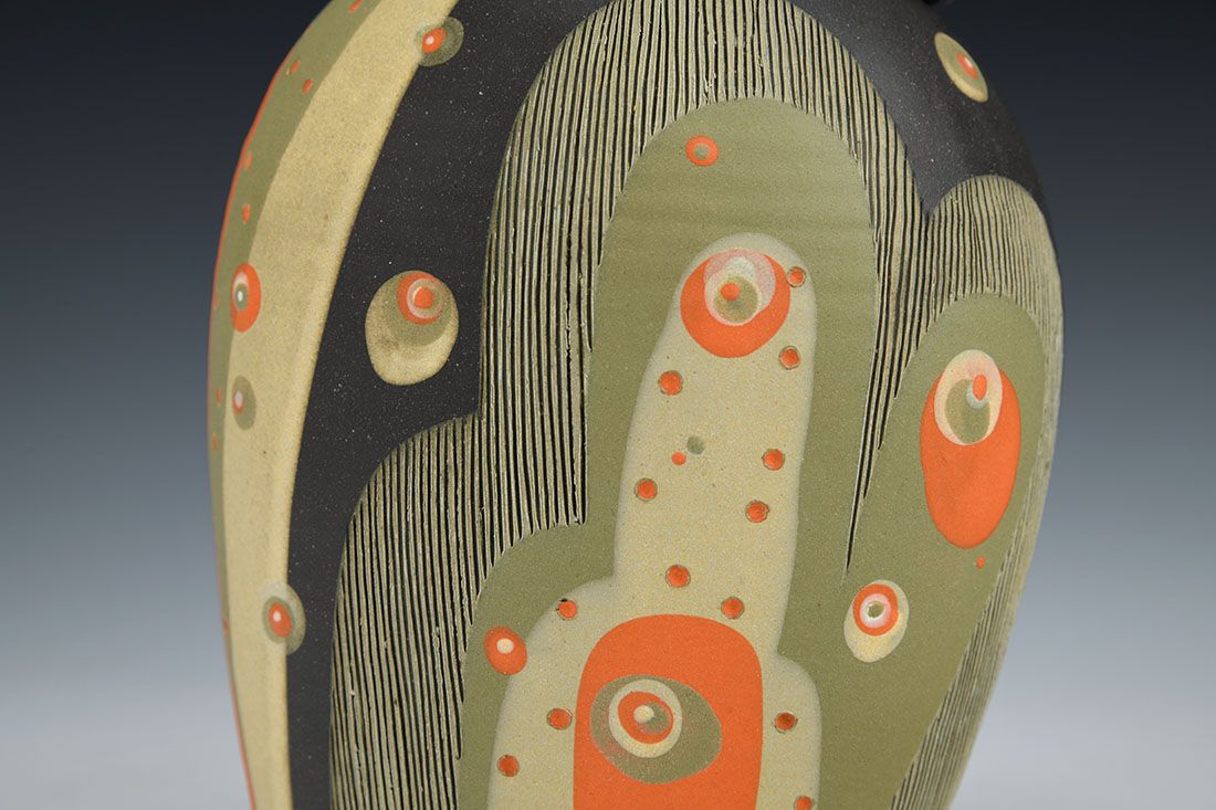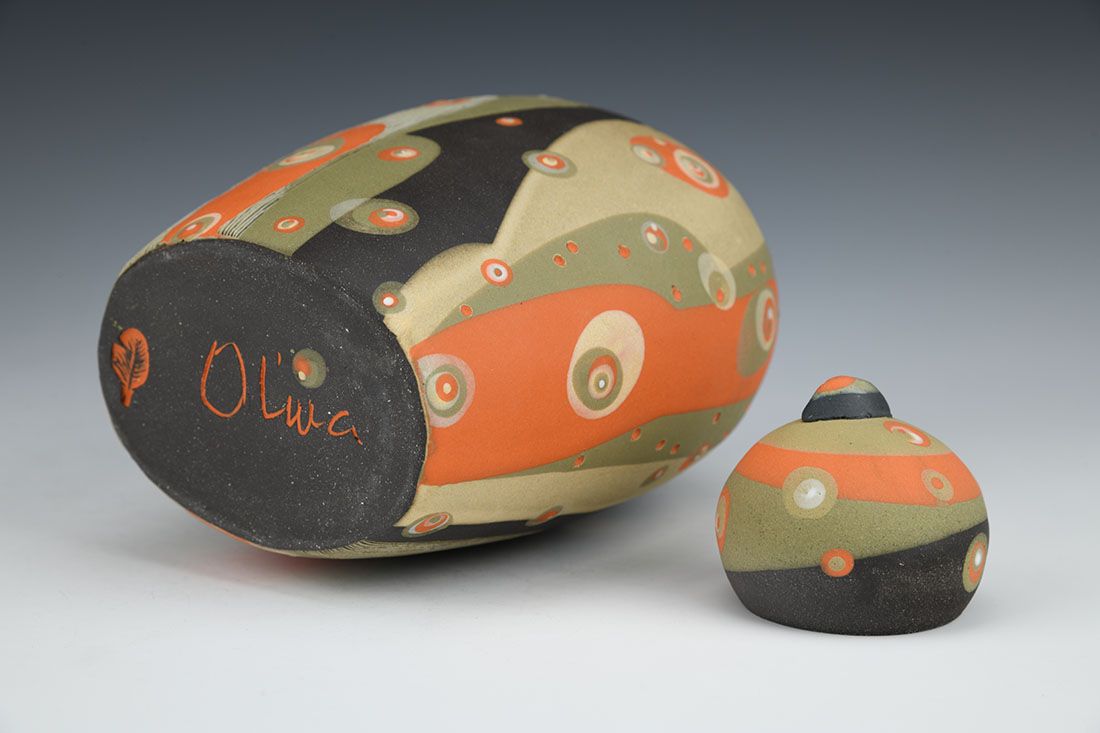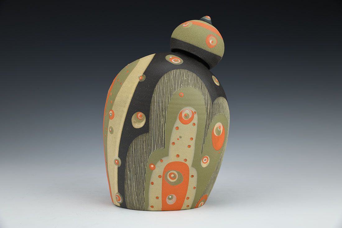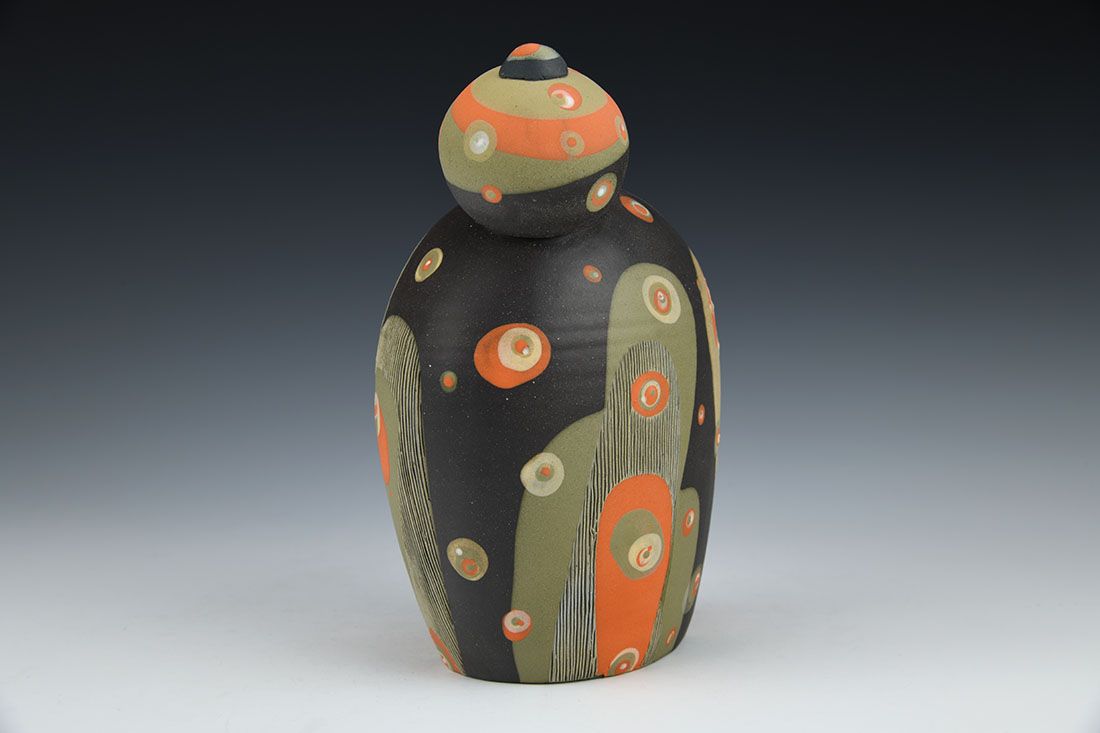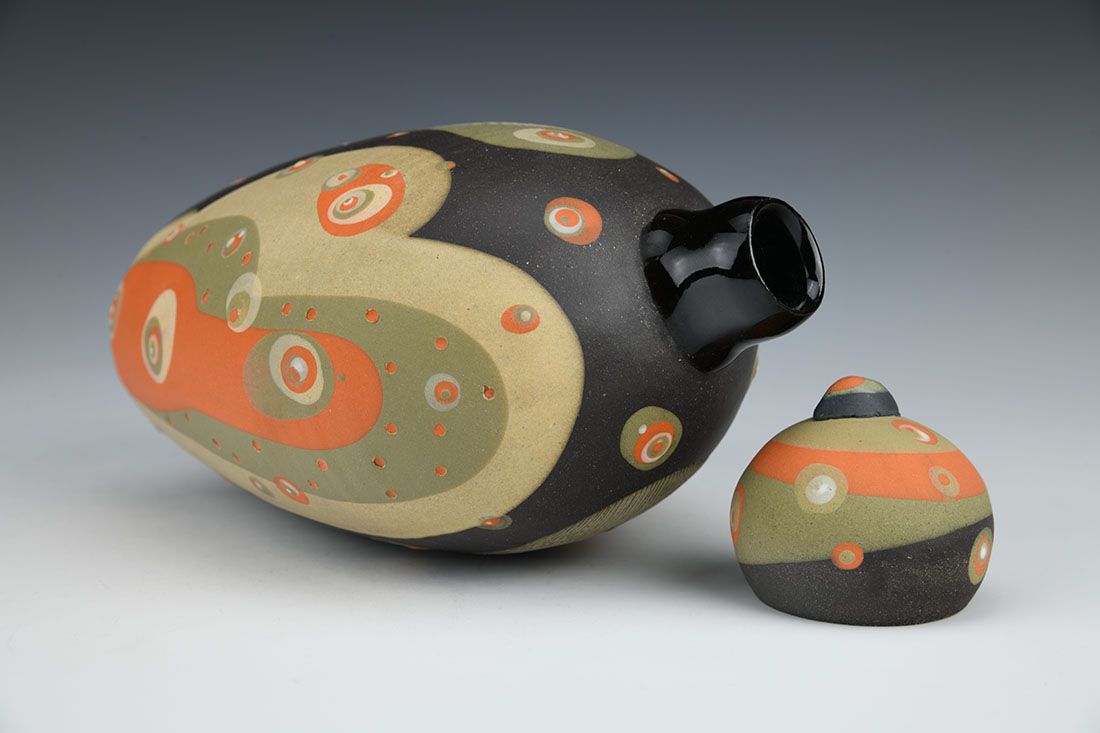 Black stoneware and cork, wheel thrown and altered, terra sigillata, cone 8 electric fired, cured wax exterior, 7.25 x 4.75 x 3.75 inches.