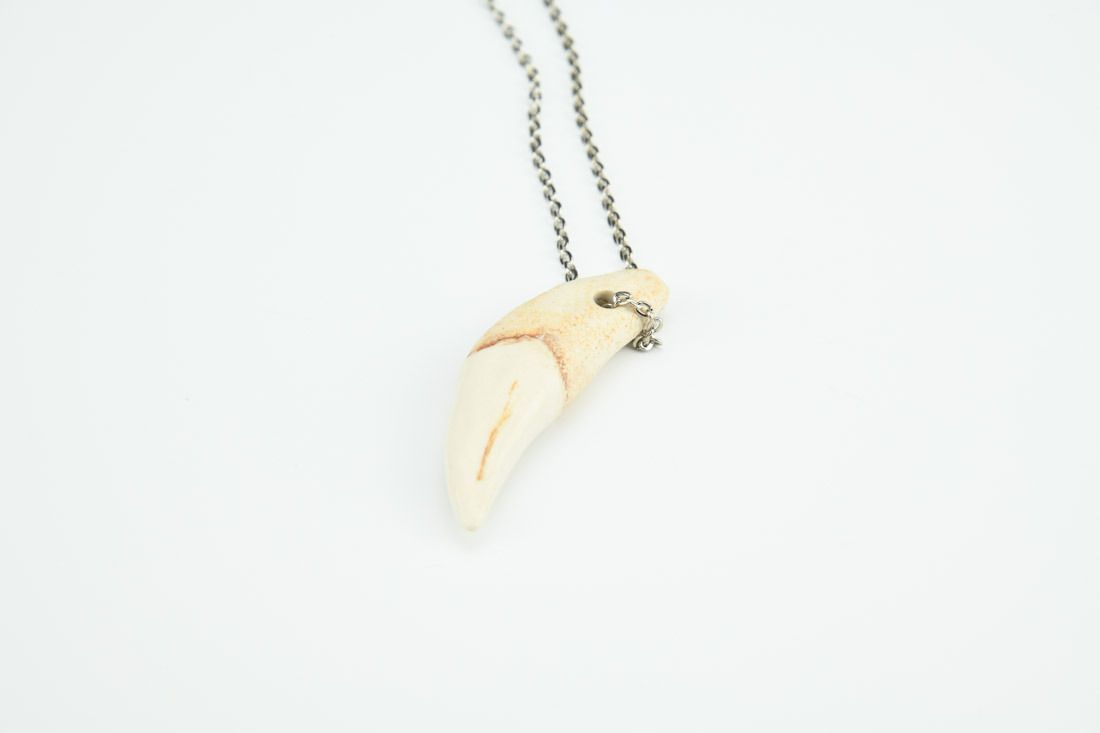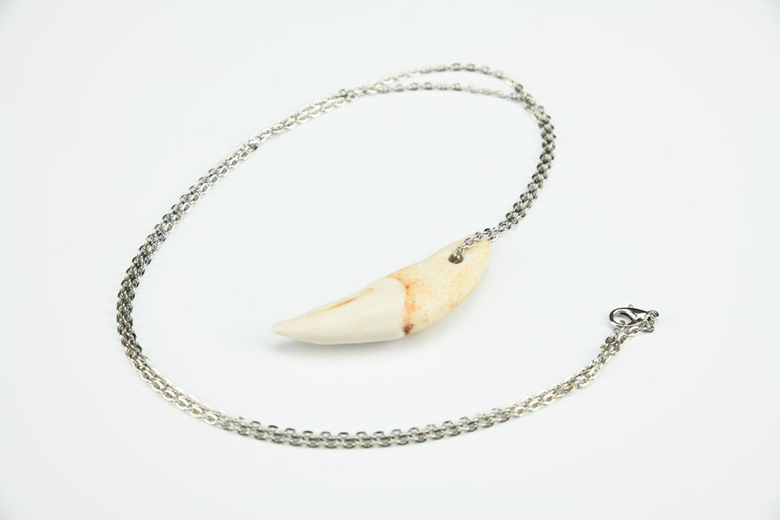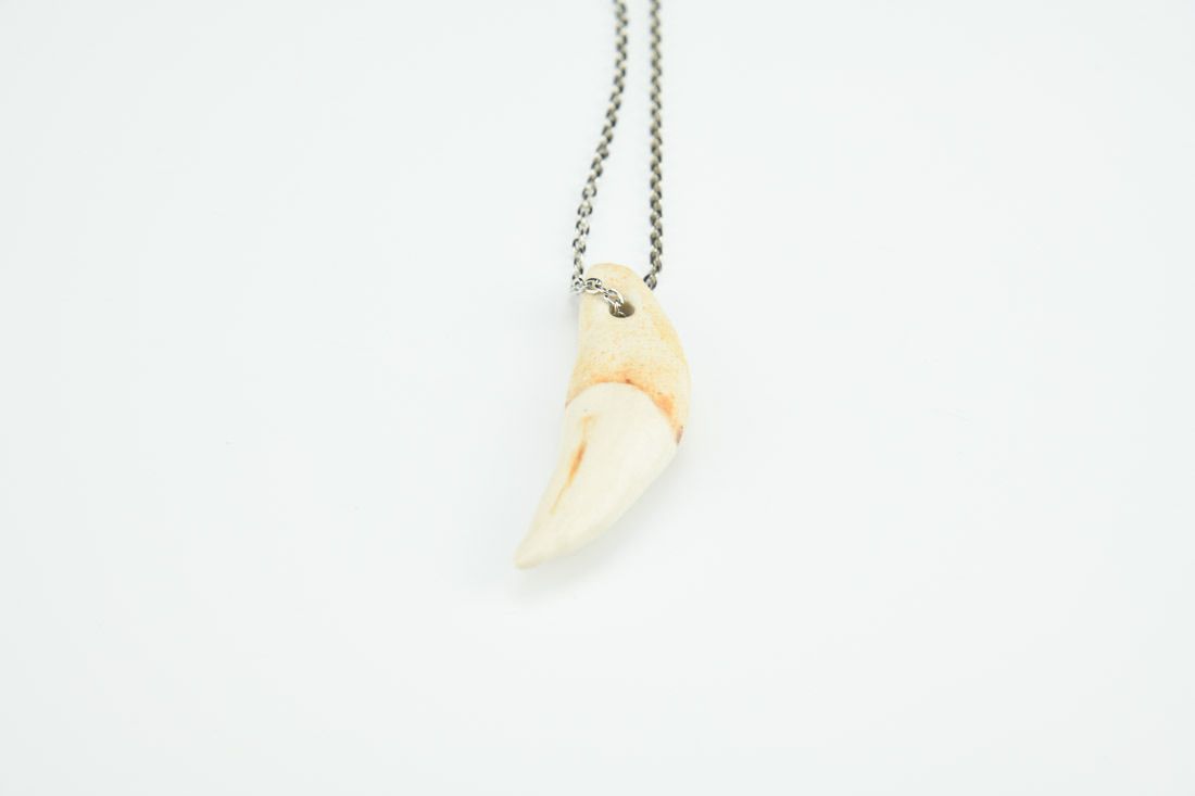 Porcelain with stainless steel chain, hand built, underglaze, cone 7 electric fired, hand polished, pendant: 2.25 x 0.75 x 0.5 inches, chain: 30 inches.