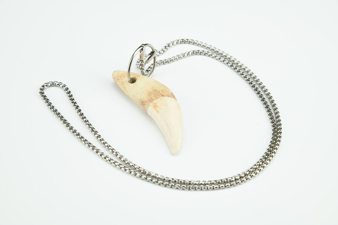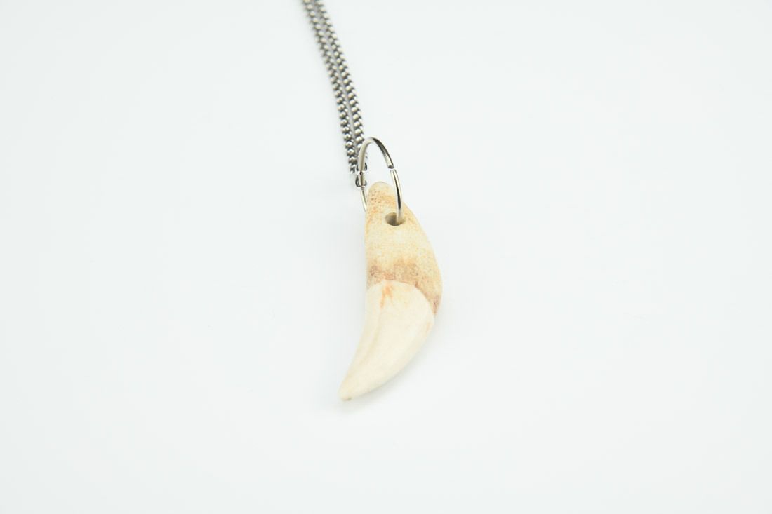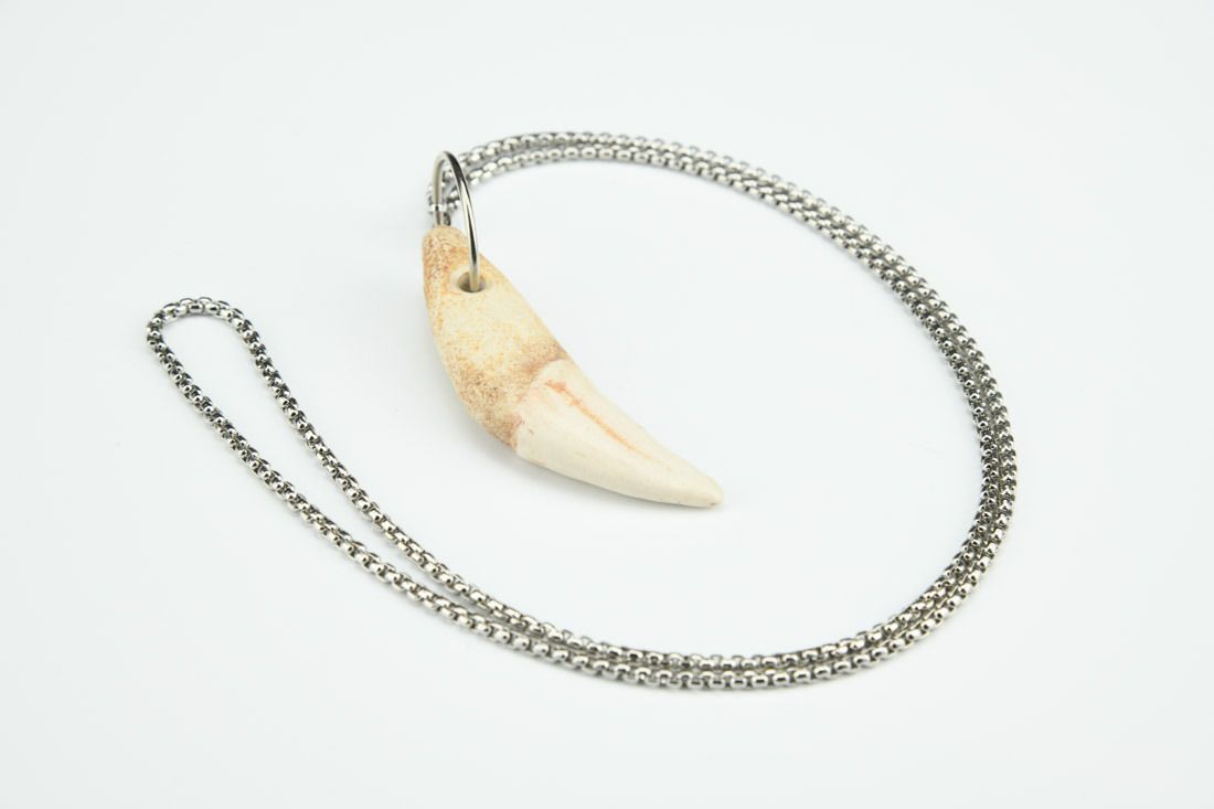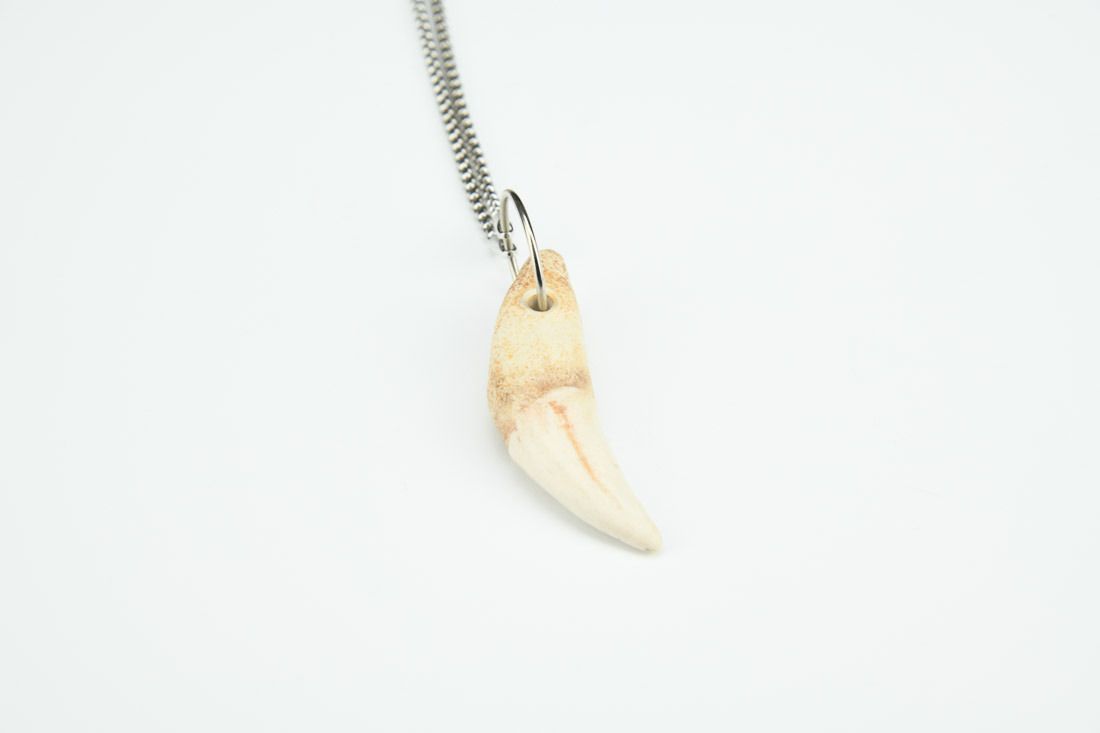 Porcelain with stainless steel square chain and jump ring, hand built, underglaze, cone 7 electric fired, hand polished, pendant: 2.5 x 0.75 x 0.5 inches, chain: 24 inches.
