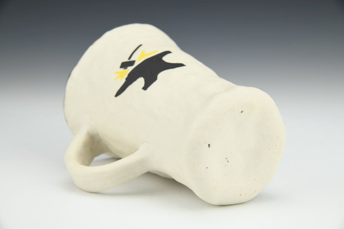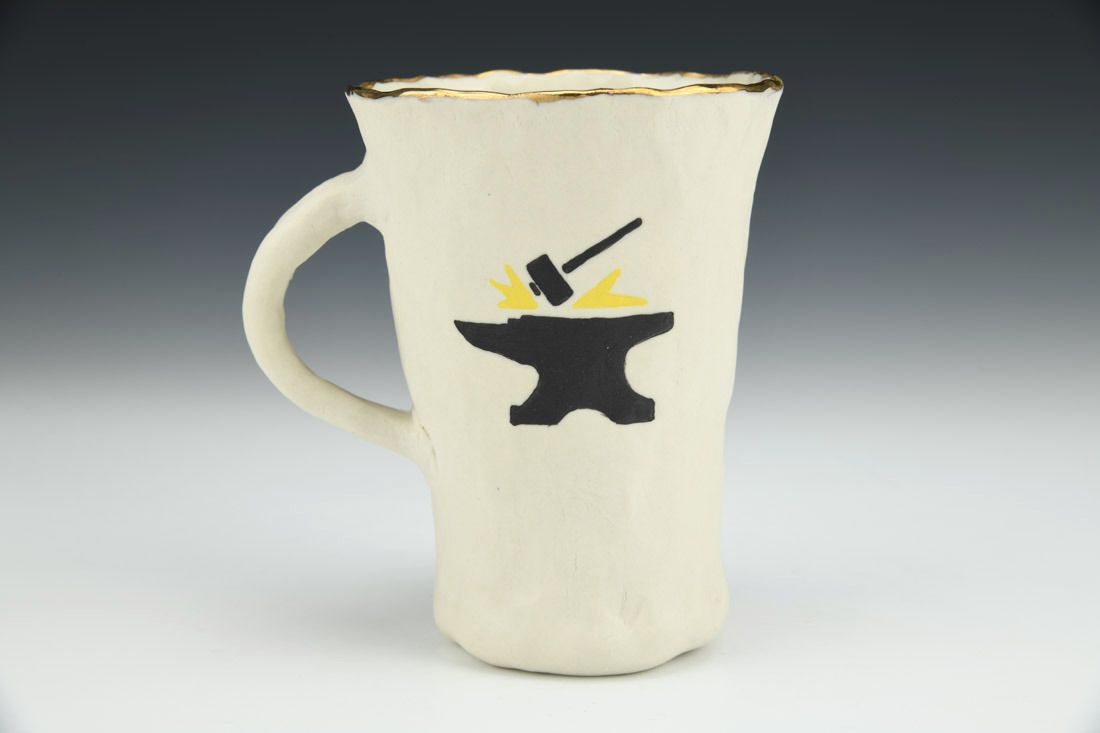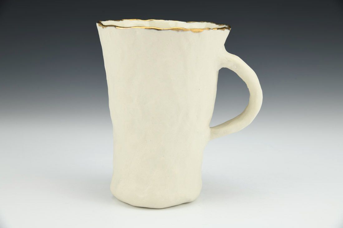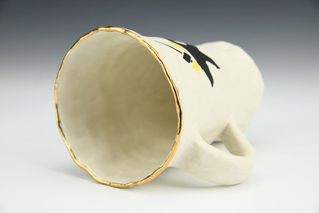 Porcelain, hand built with pinching, underglaze, glaze, gold luster, cone 6 electric fired, 5 x 4.75 x 3.5 inches.