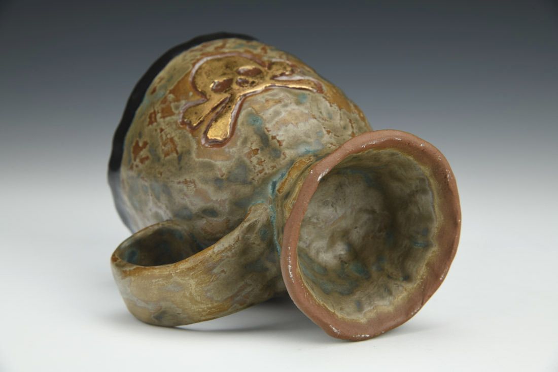 Red stoneware, hand built with pinching, glaze, luster, cone 6 electric fired, 4.5 x 5 x 4 inches.