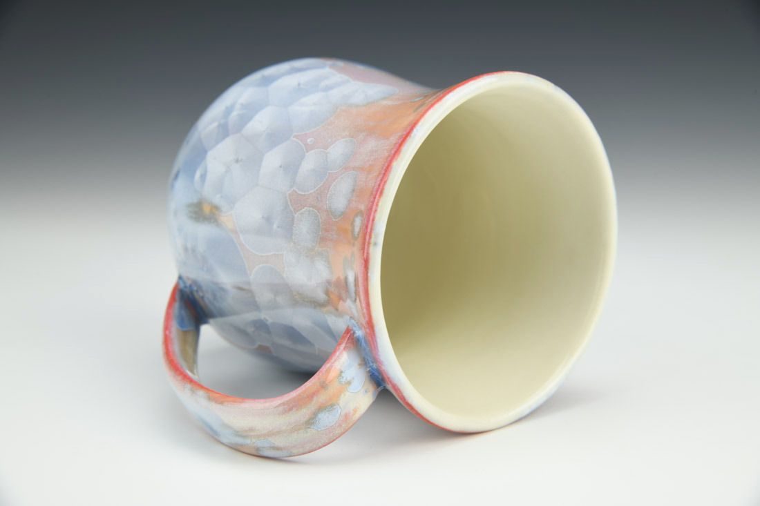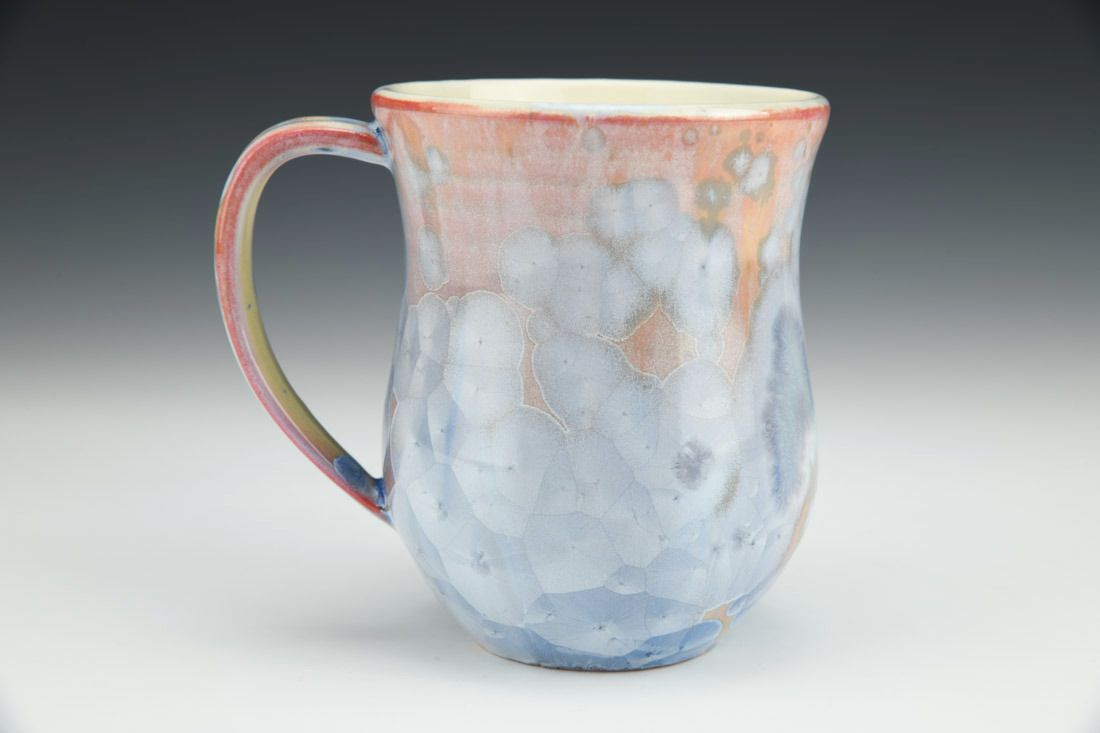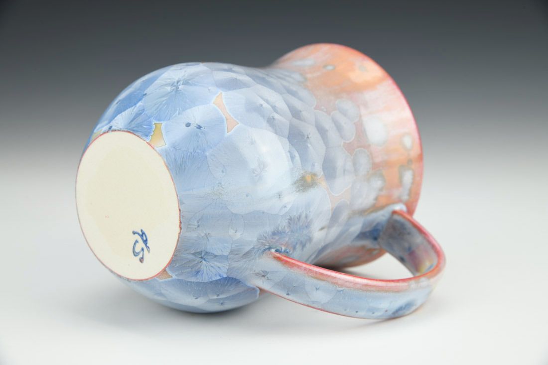 Porcelain, wheel thrown, slip, crystalline glaze, cone 10 electric fired, 4.5 x 5 x 3.5 inches.
