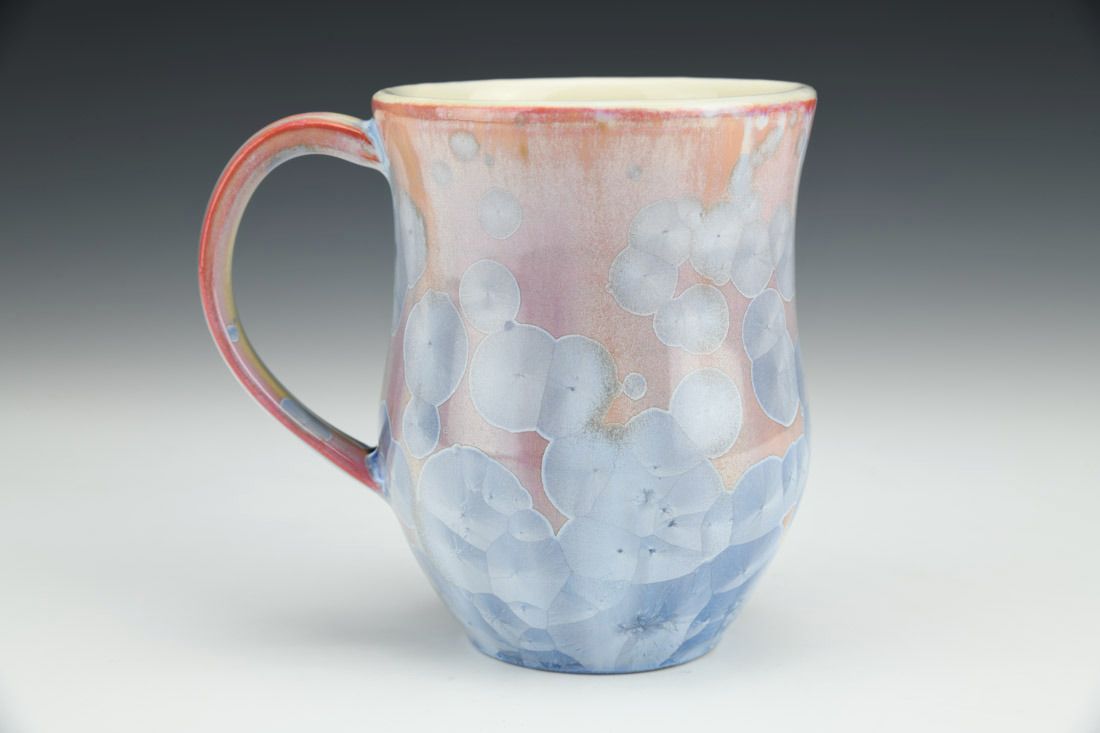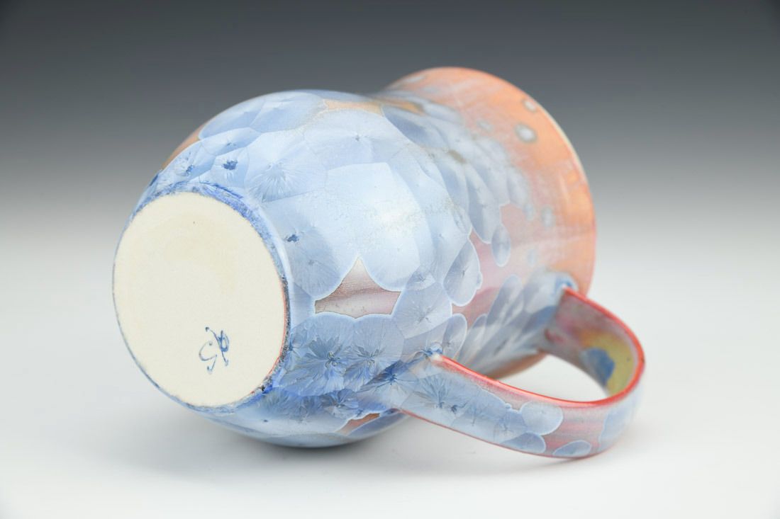 Porcelain, wheel thrown, slip, crystalline glaze, cone 10 electric fired, 4.25 x 5 x 3.25 inches.