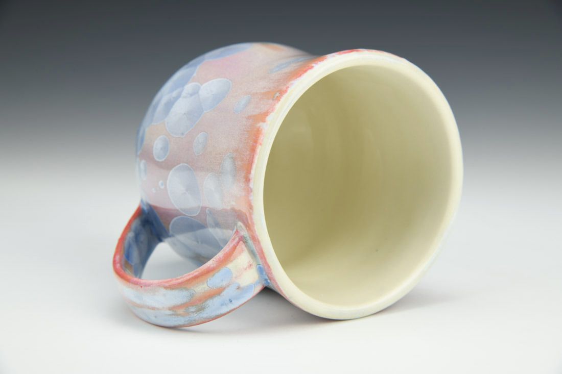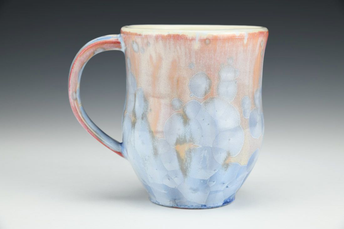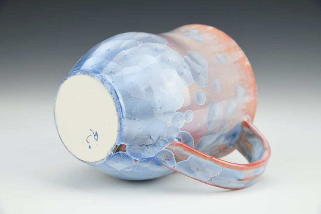 Porcelain, wheel thrown, slip, crystalline glaze, cone 10 electric fired, 4.25 x 4.75 x 3.5 inches.