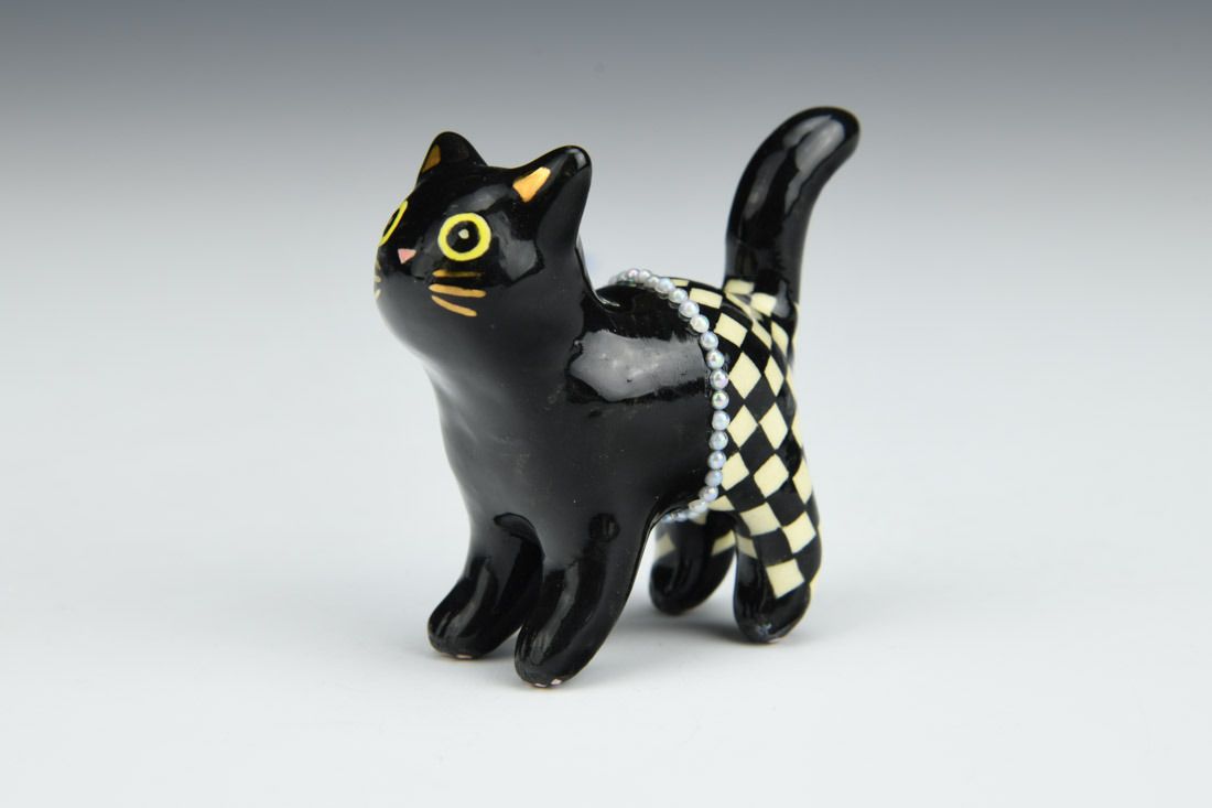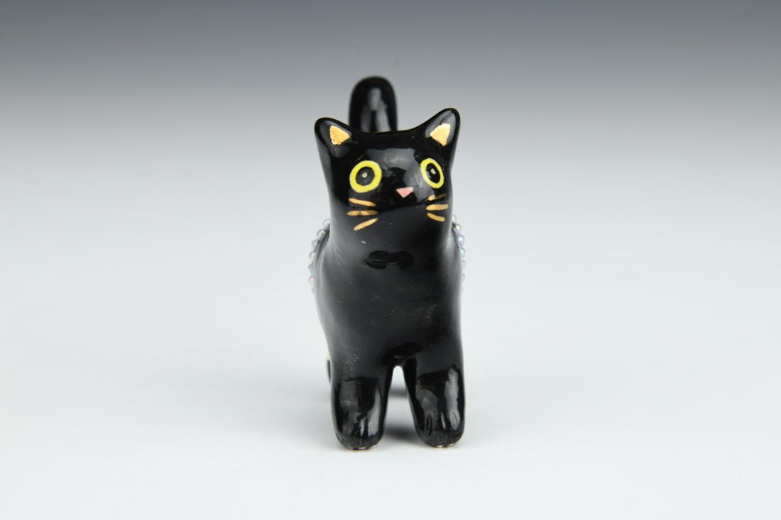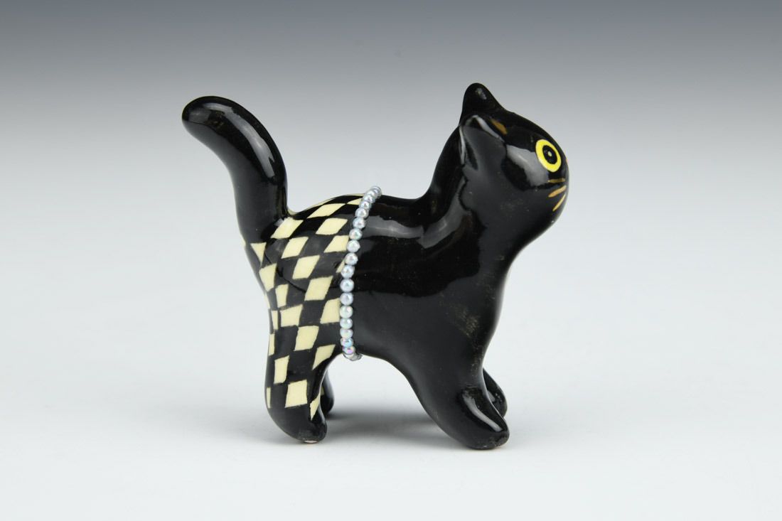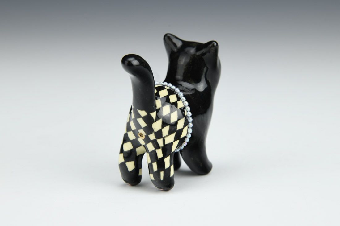 Earthenware with pearl flatbacks and glue, hand built, underglaze, glaze, gold luster, cone 06 electric fired, 2 x 2.25 x 1.25 inches.