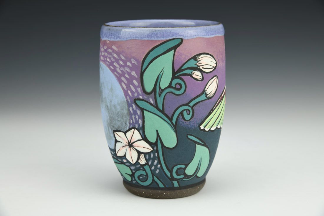 Stoneware, wheel thrown, underglaze, glaze, cone 5 fired, 3.25 x 3.25 x 4.75 inches.