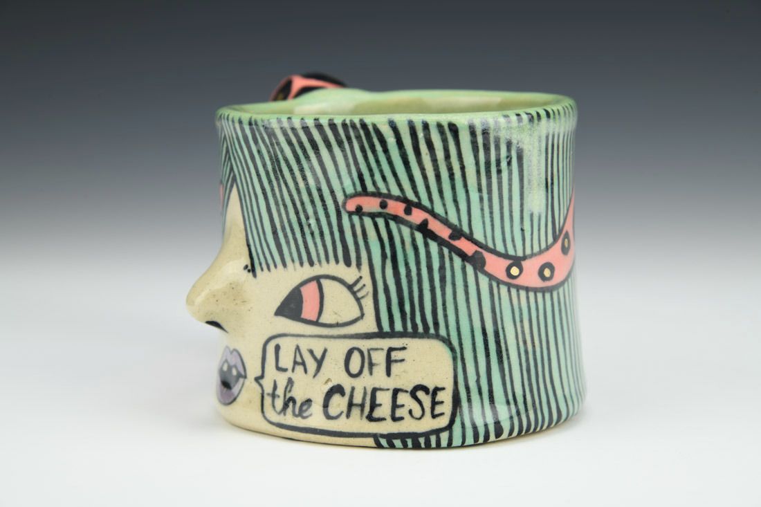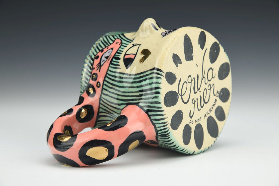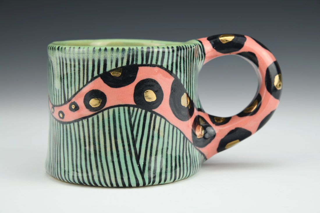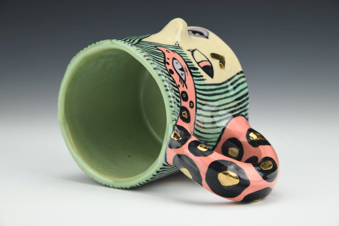 Stoneware, hand built with slabs, underglaze, glaze, gold luster, cone 6 fired, 3 x 5.25 x 3.5 inches.