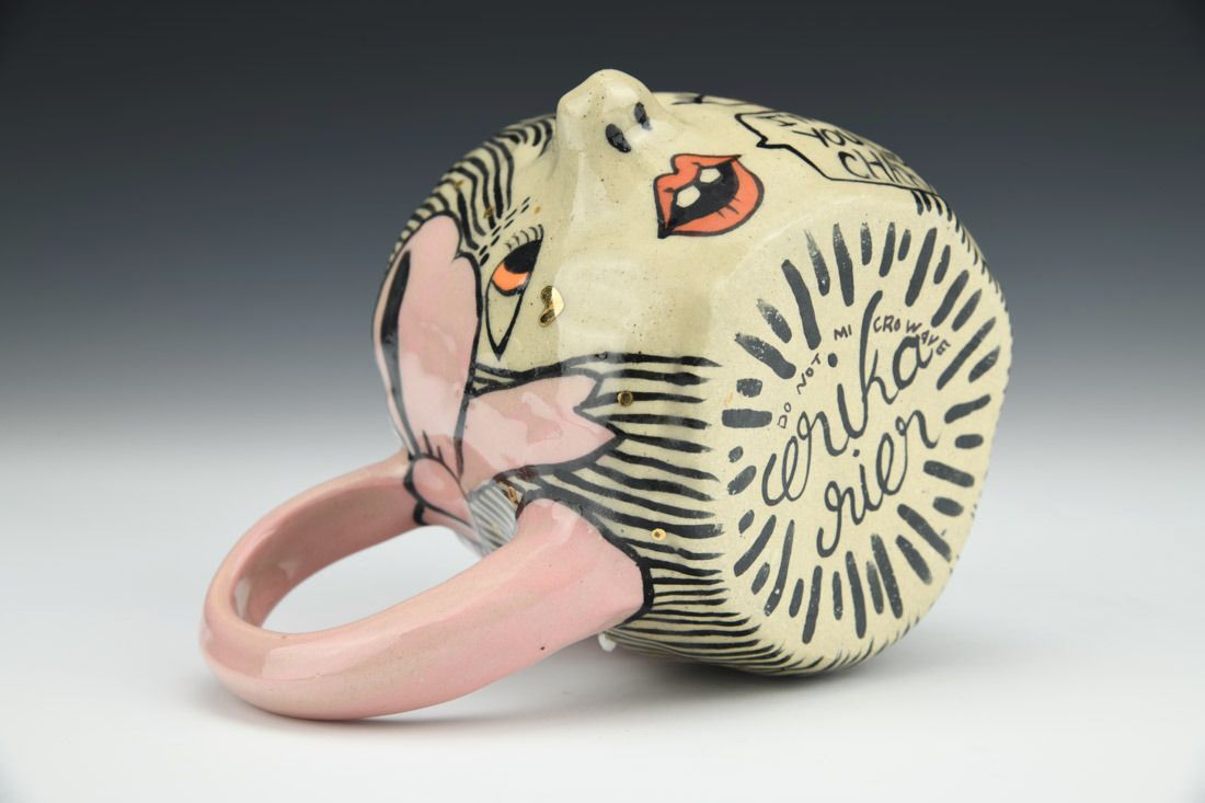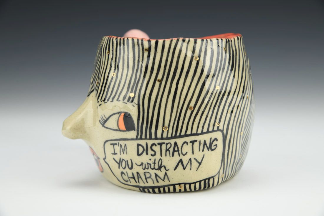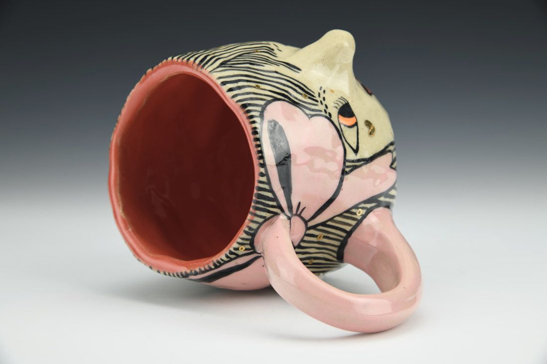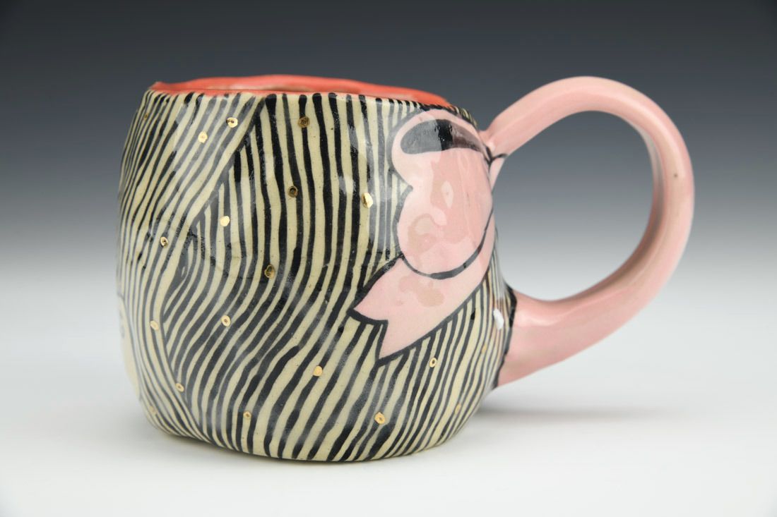 Stoneware, hand built with coils, underglaze, glaze, gold luster, cone 6 fired, 3.5 x 5.5 x 4.25 inches.