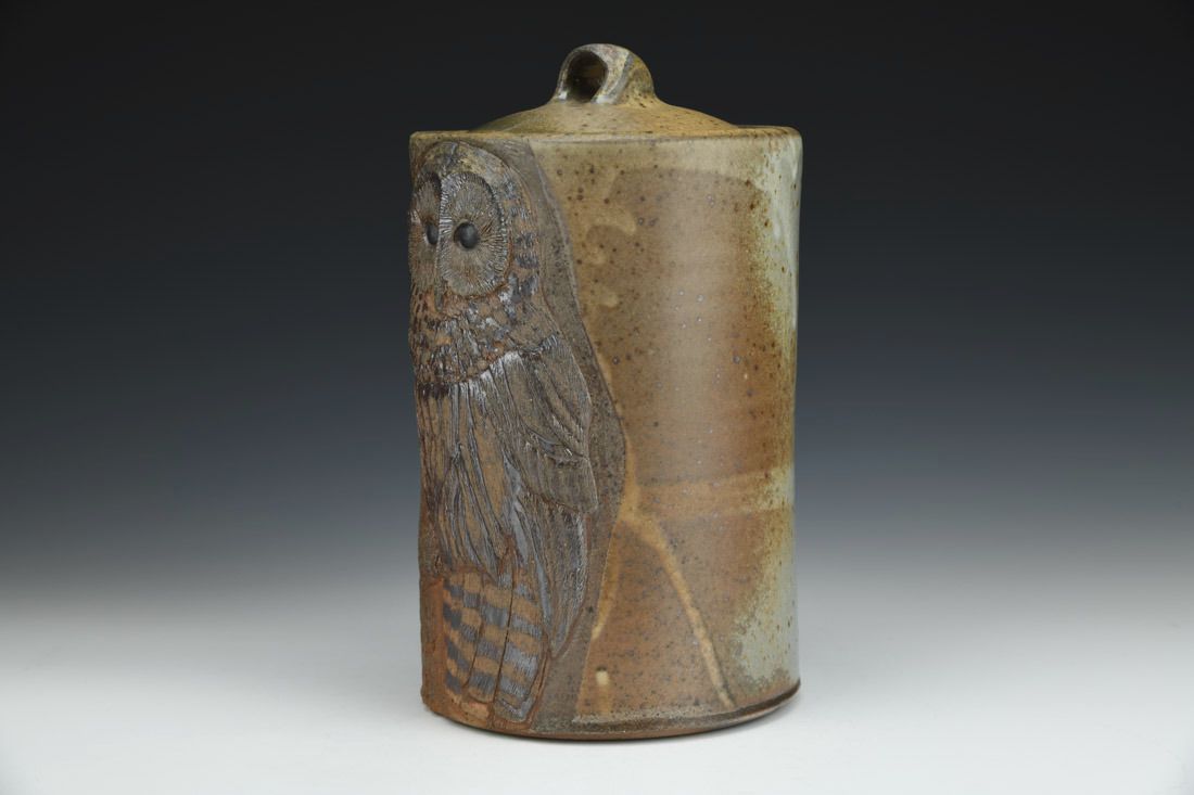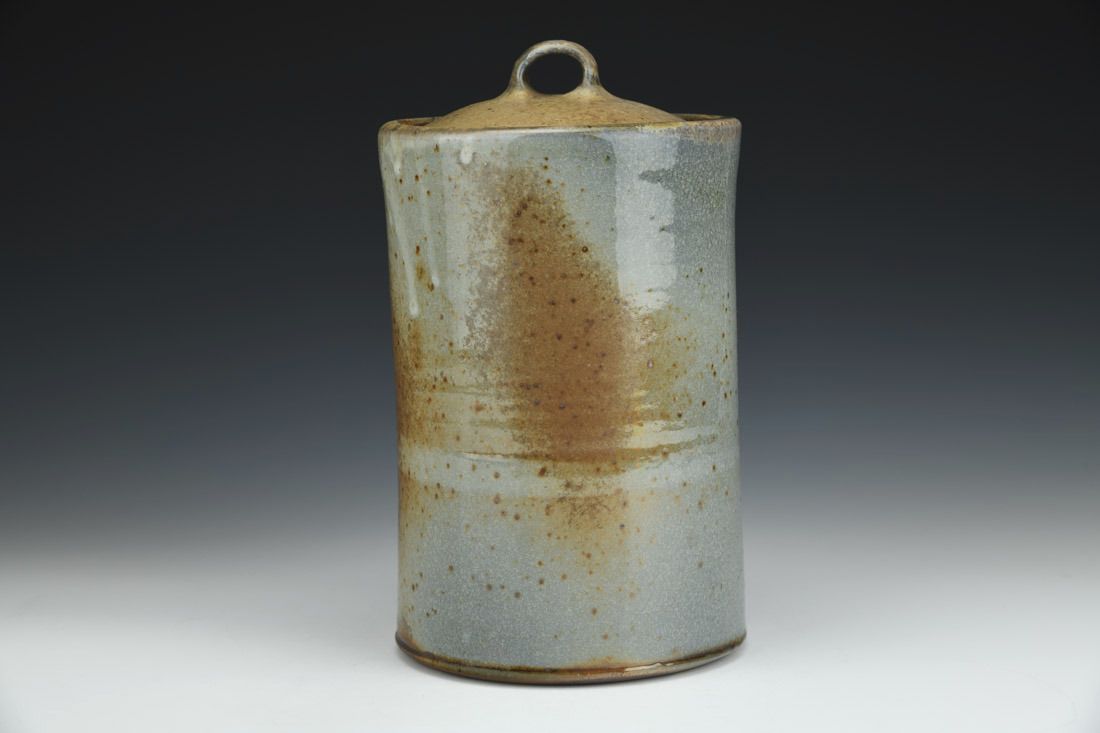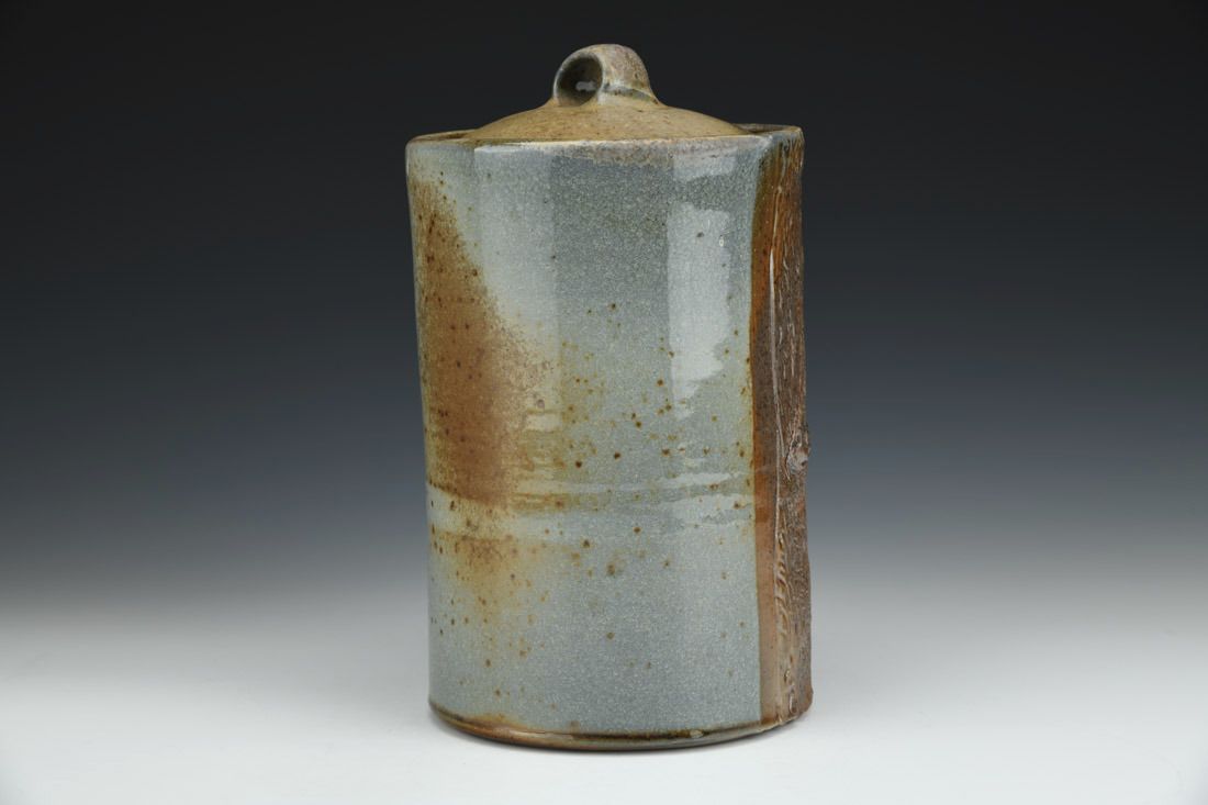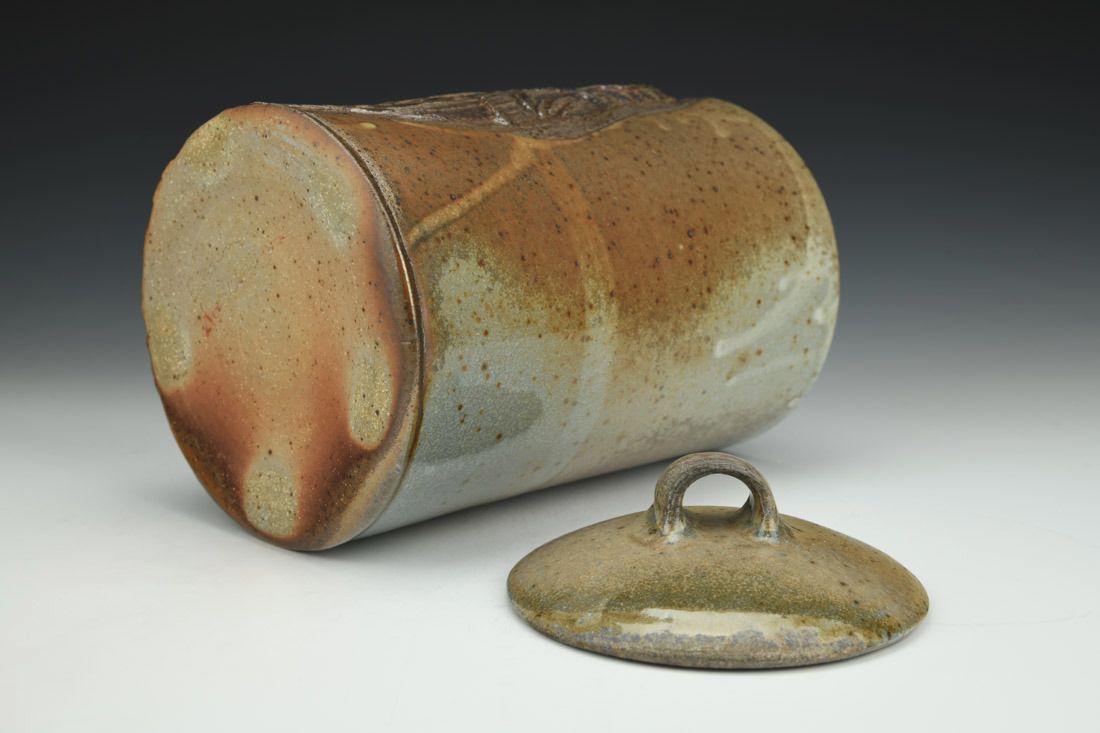 Stoneware, wheel thrown, hand carved, slips, shino glaze, woodfired, 9.5 x 5.5 x 5.75 inches.