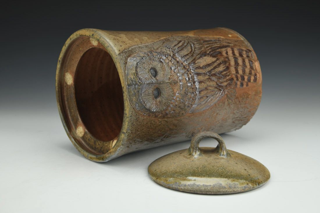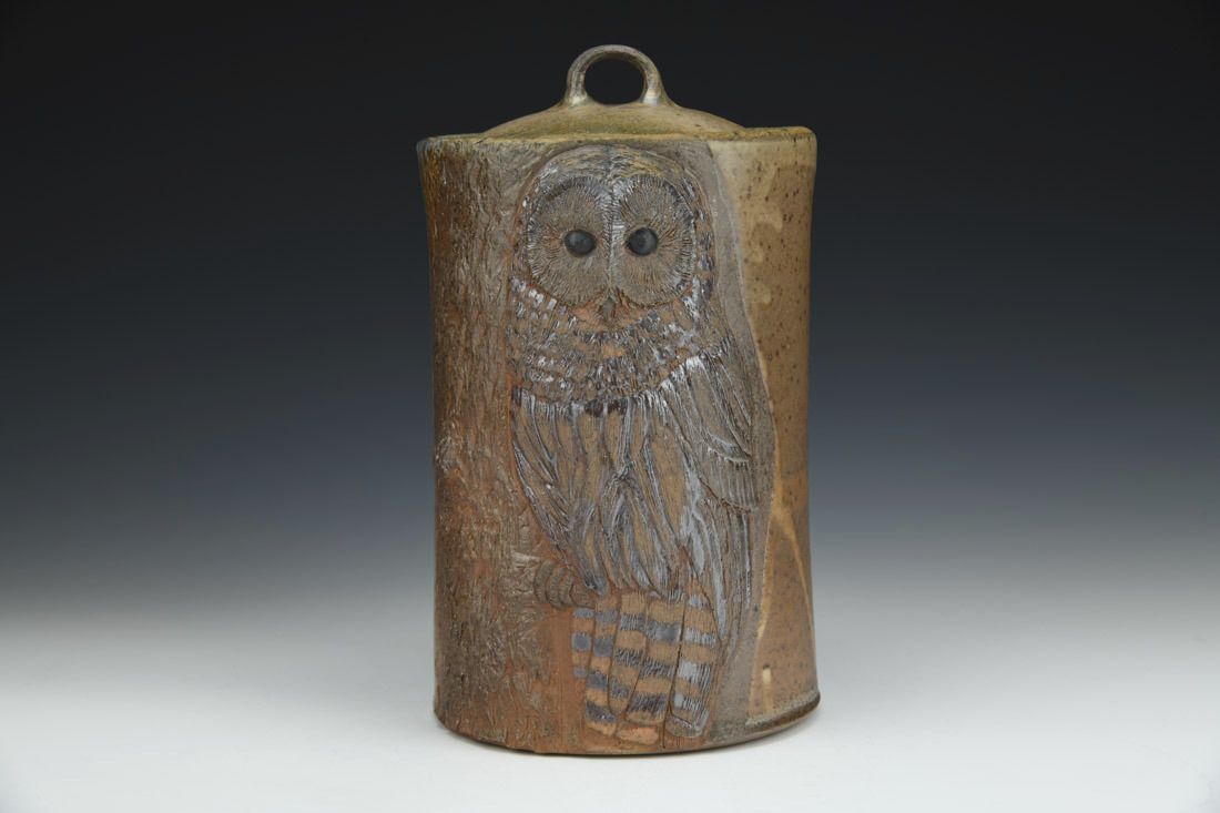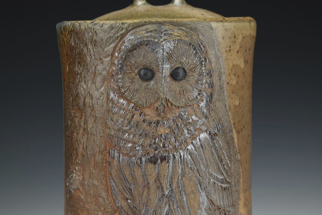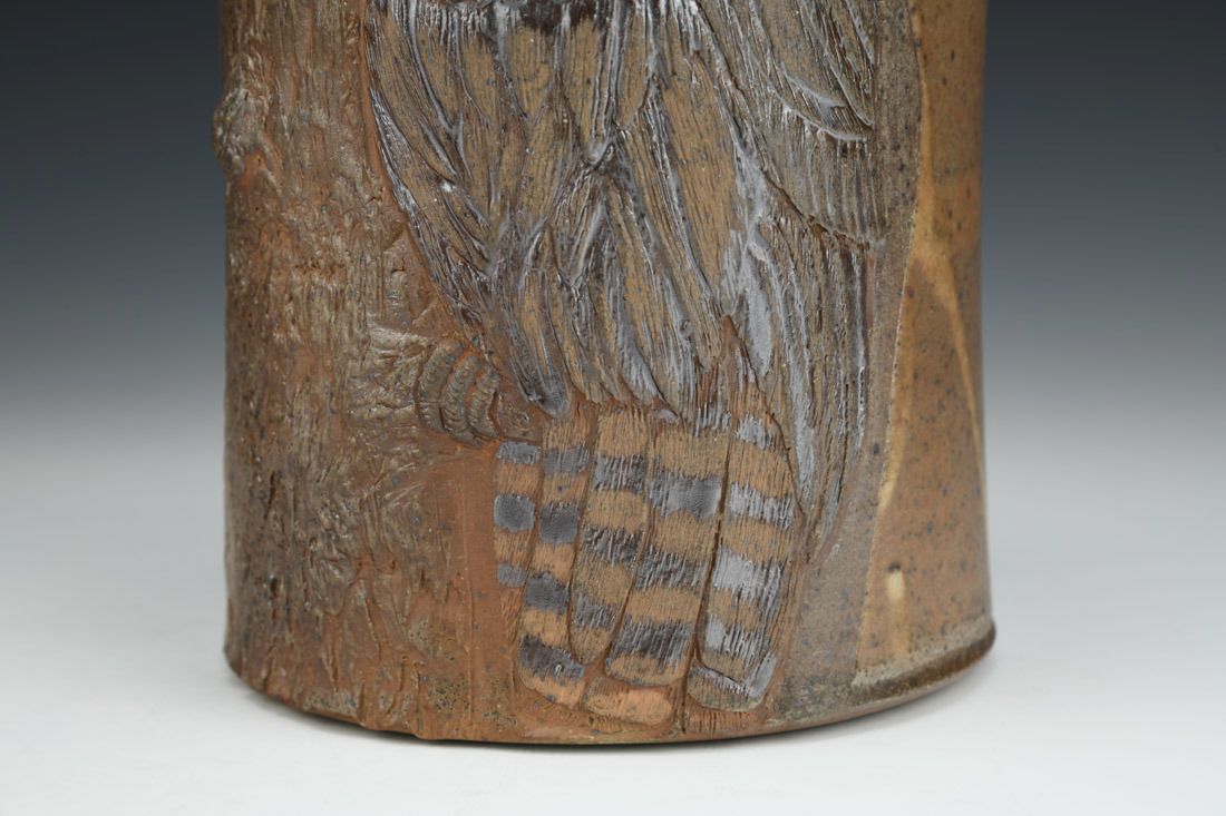 Stoneware, wheel thrown, hand carved, slips, shino glaze, woodfired, 9.5 x 5.5 x 5.75 inches.