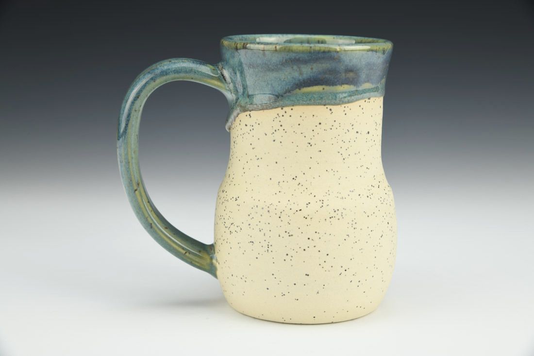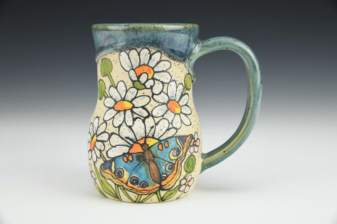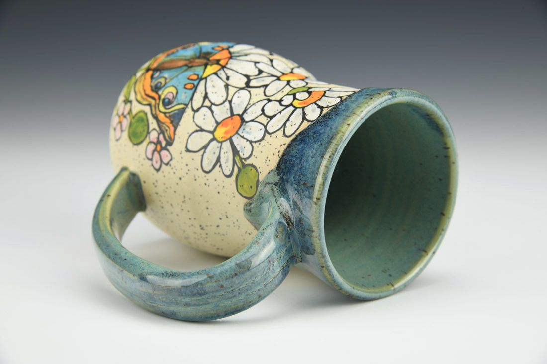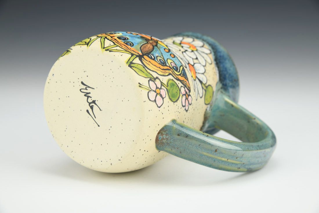 Clay, wheel thrown, hand painted, glazed, 4.5 x 5.25 x 3.75 inches.