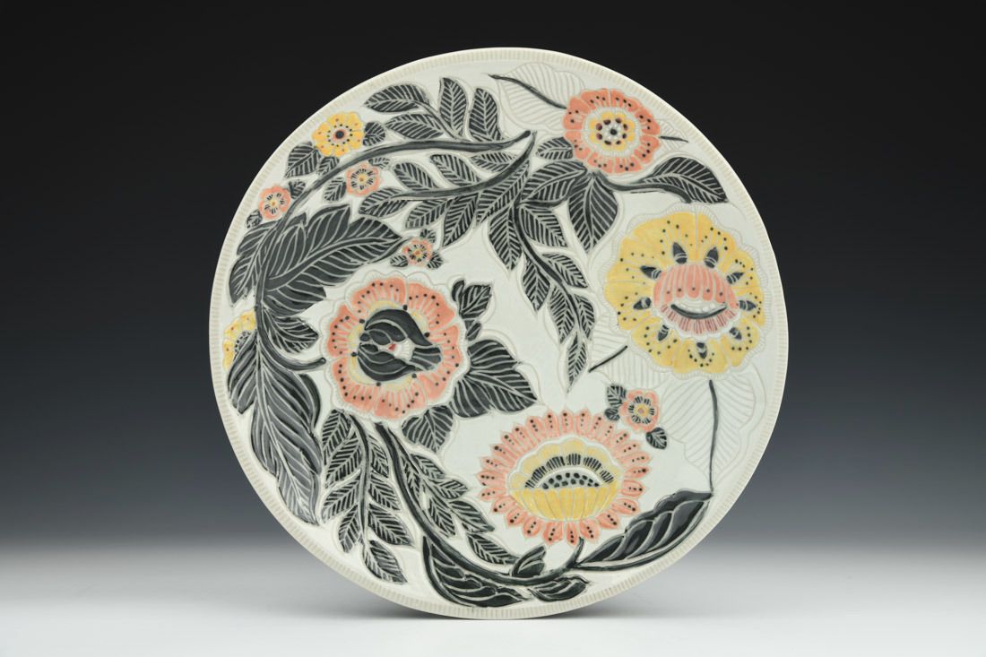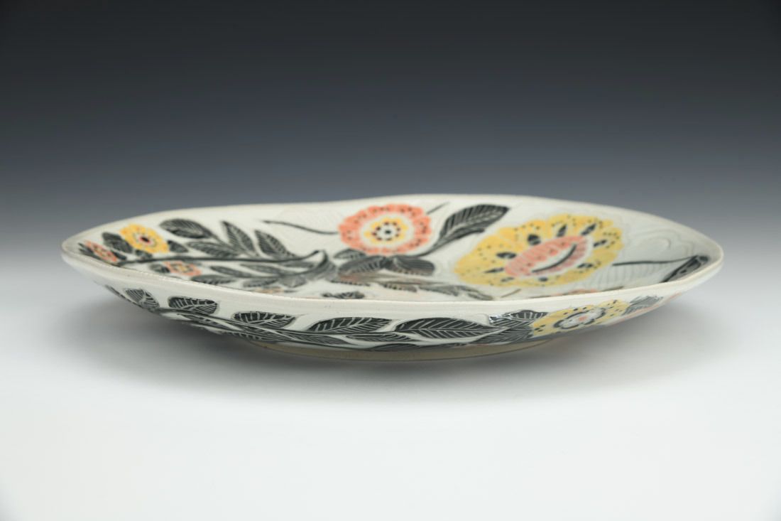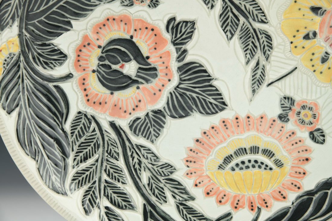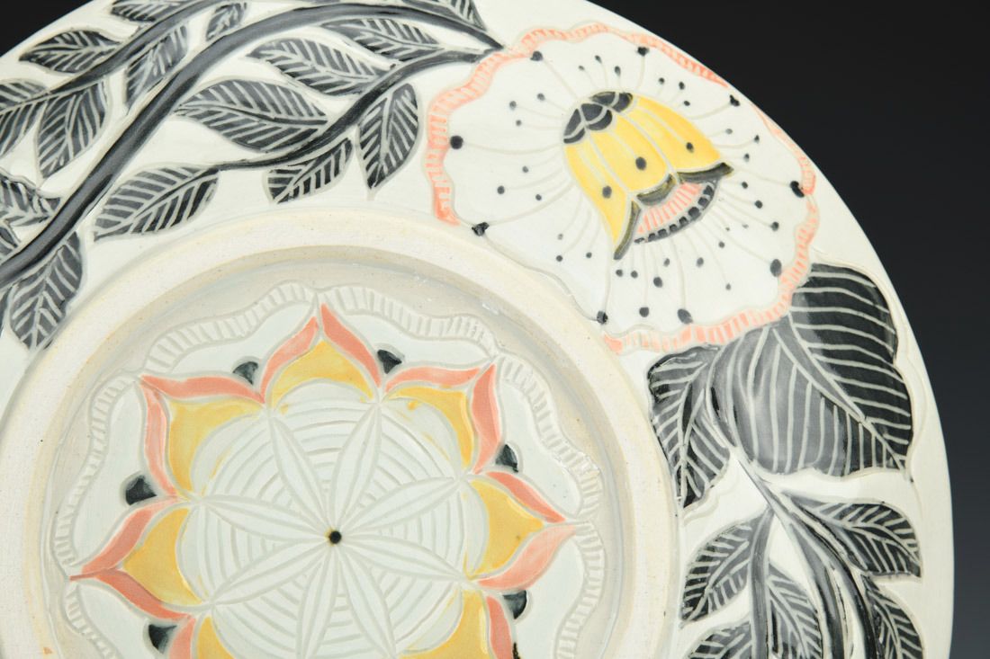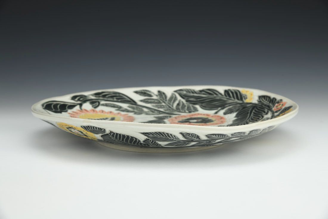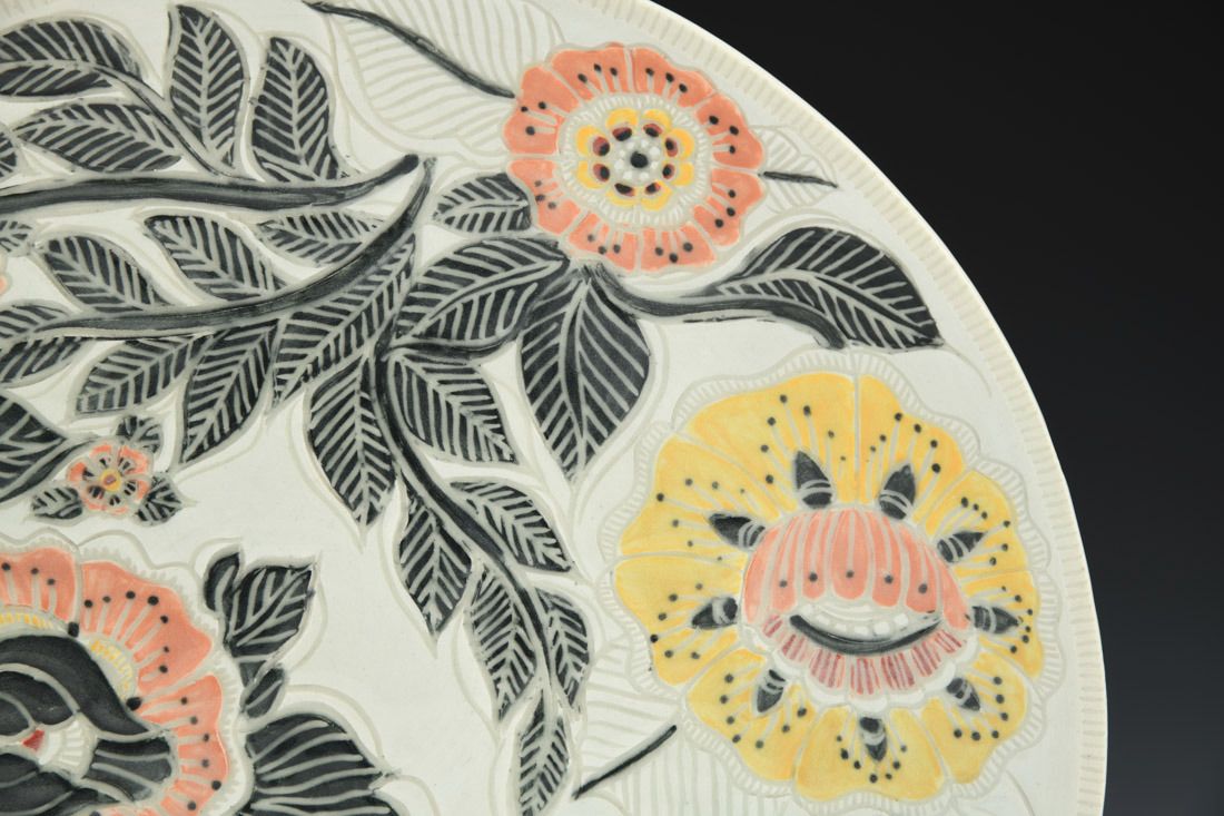 White stoneware, hand built, sgrafitto, cone 10 reduction fired, 1.5 x 12 x 12 inches.