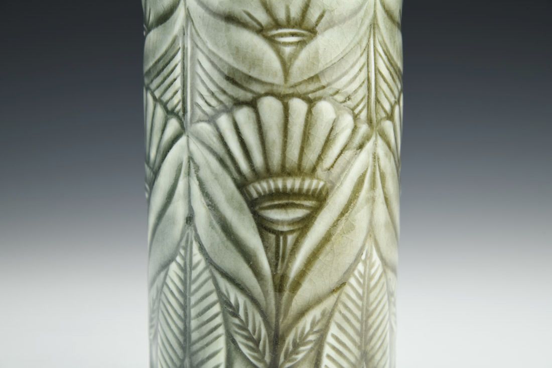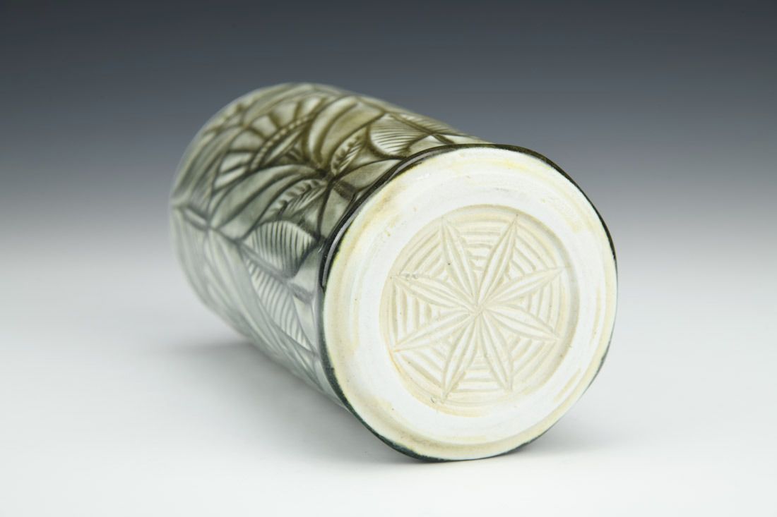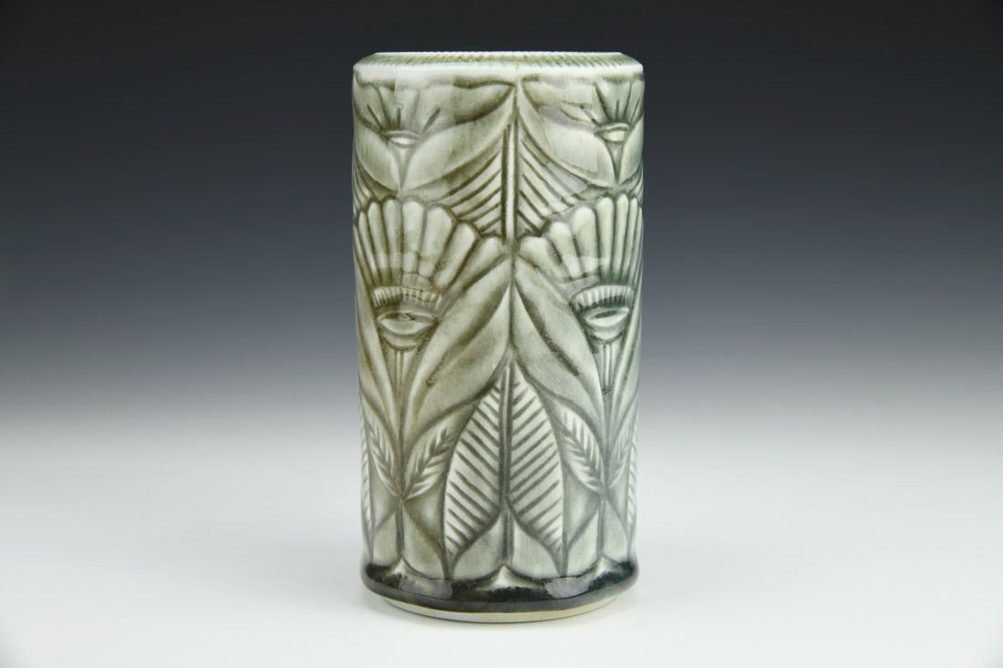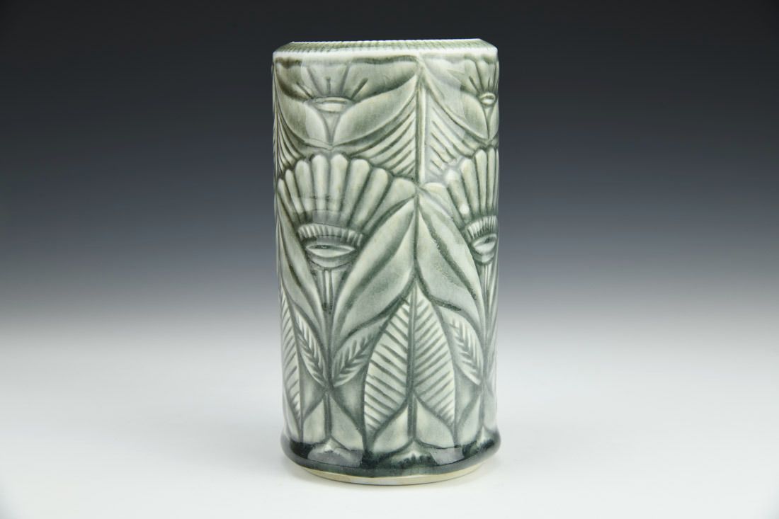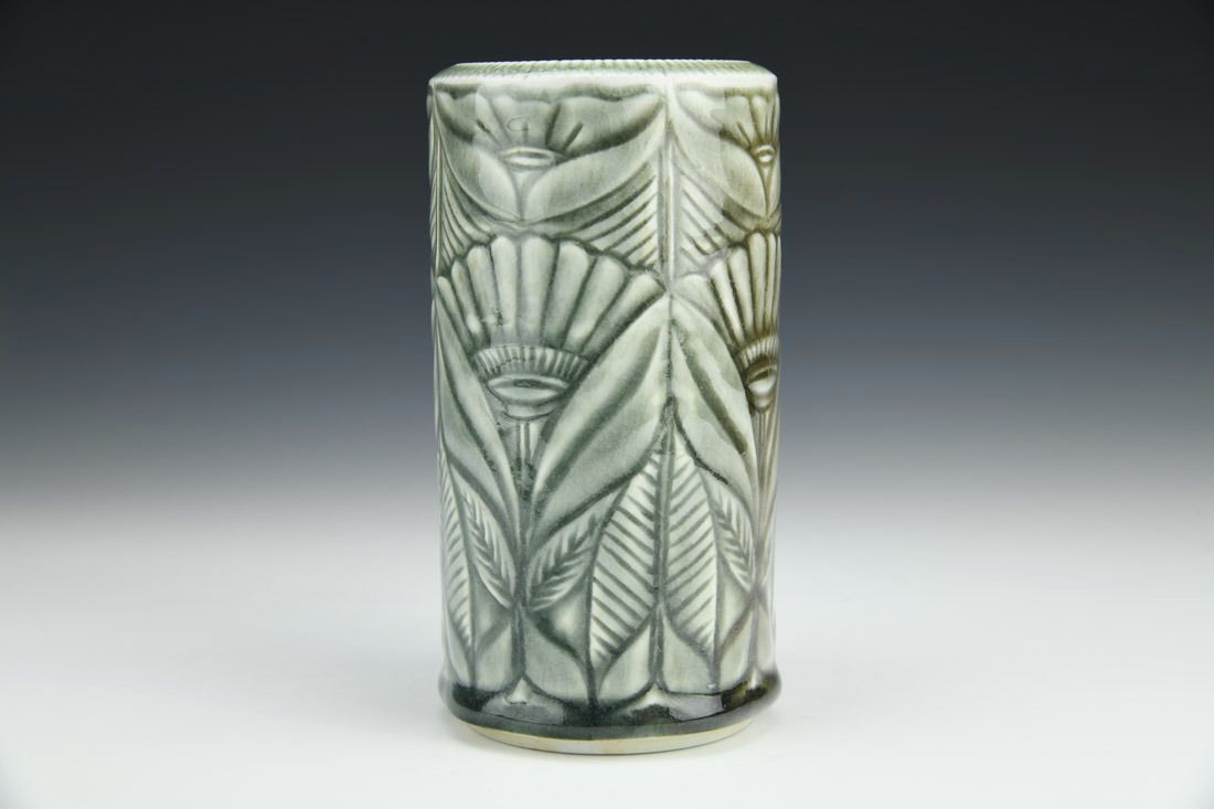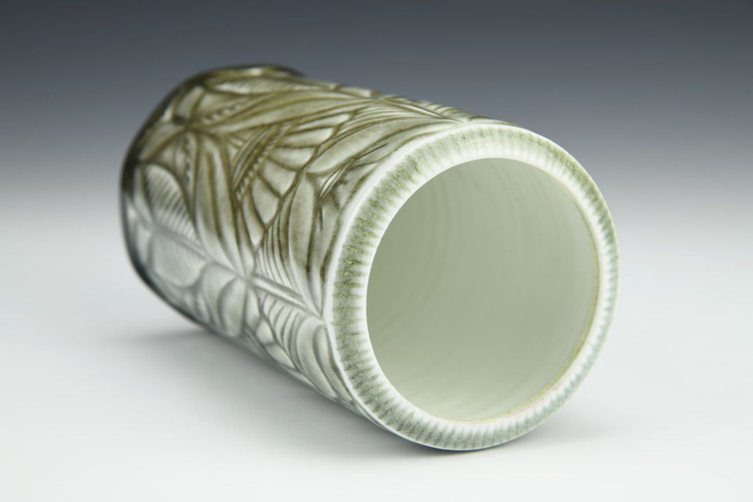 Porcelain, wheel thrown, carved, celadon glaze, cone 10 soda fired, 6 x 3.25 x 3.25 inches.
