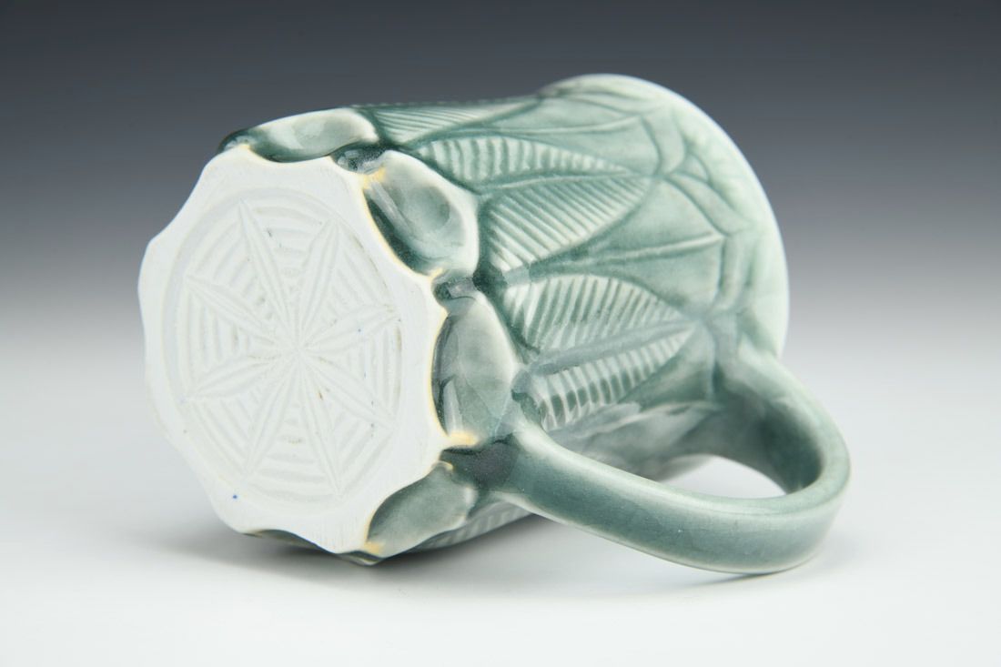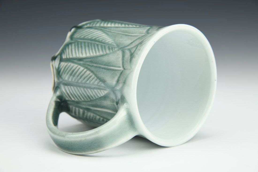 Porcelain, wheel thrown, carved, celadon glaze, cone 10 reduction fired, 4 x 5 x 3.5 inches.