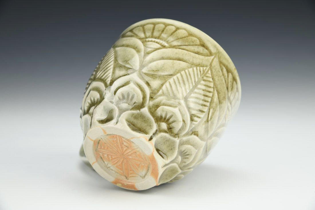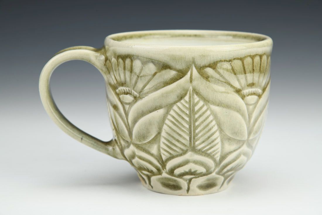 White stoneware, wheel thrown, carved, celadon glaze, cone 10 soda fired, 3.5 x 5.25 x 4 inches.