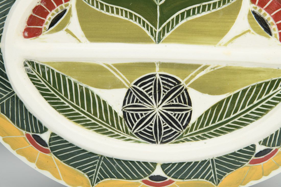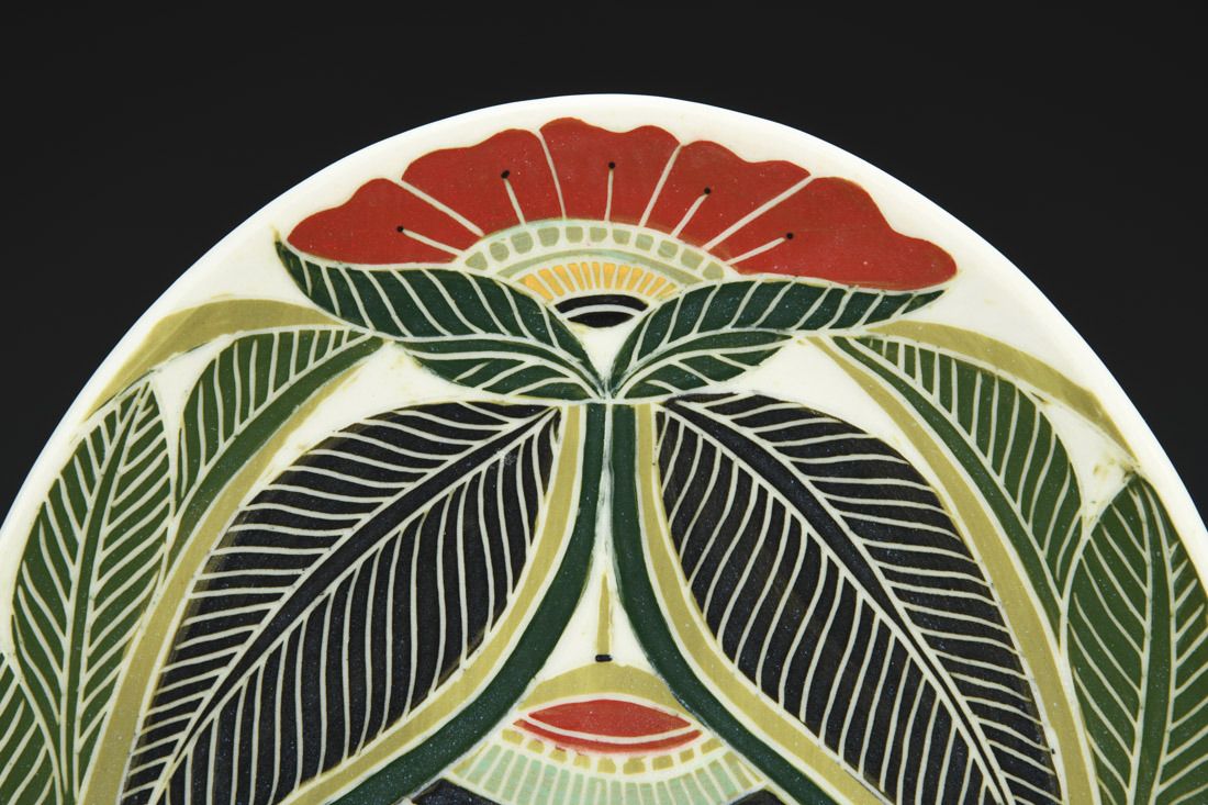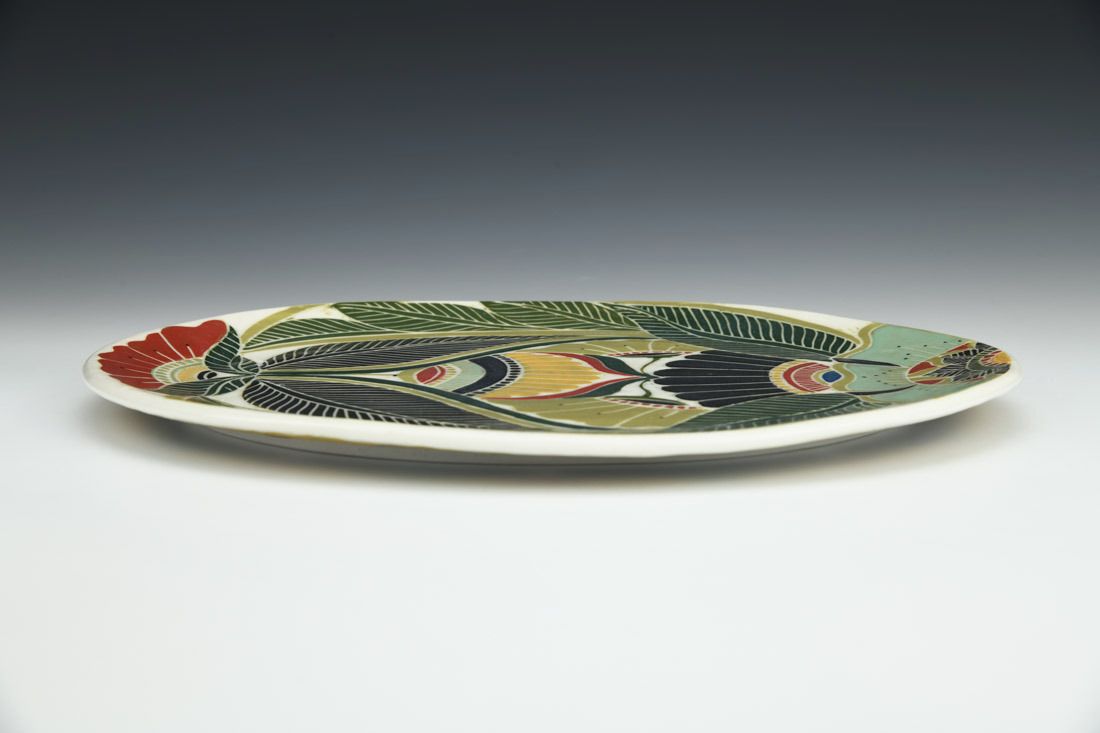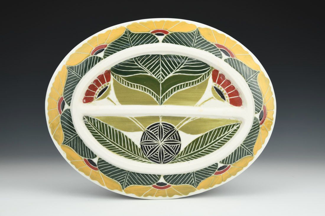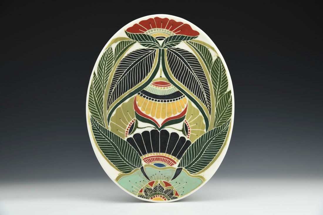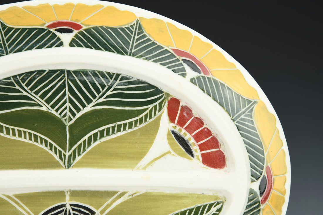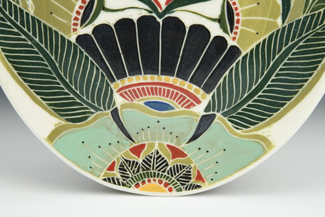 Porcelain, Hand built, sgraffito, cone 6 oxidation fired, 0.75 x 12.25 x 9.5 inches.