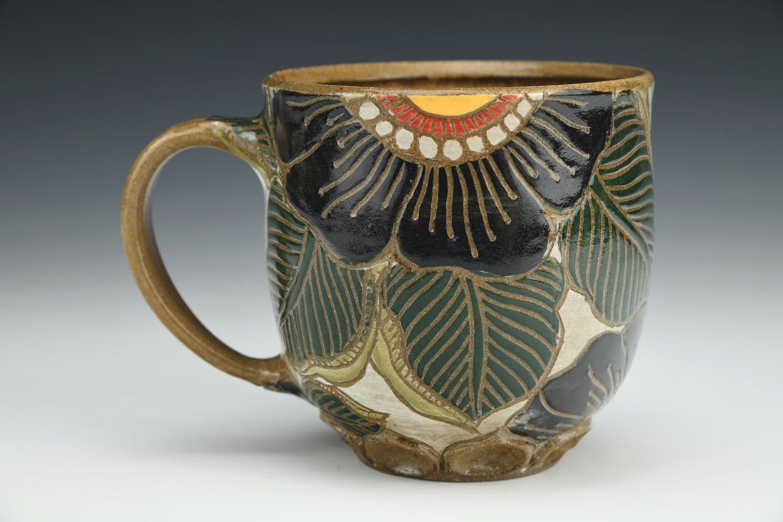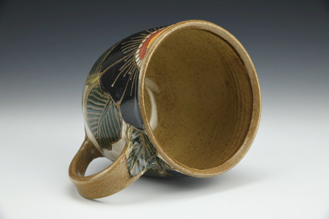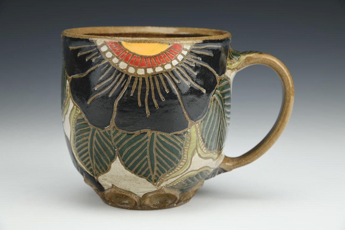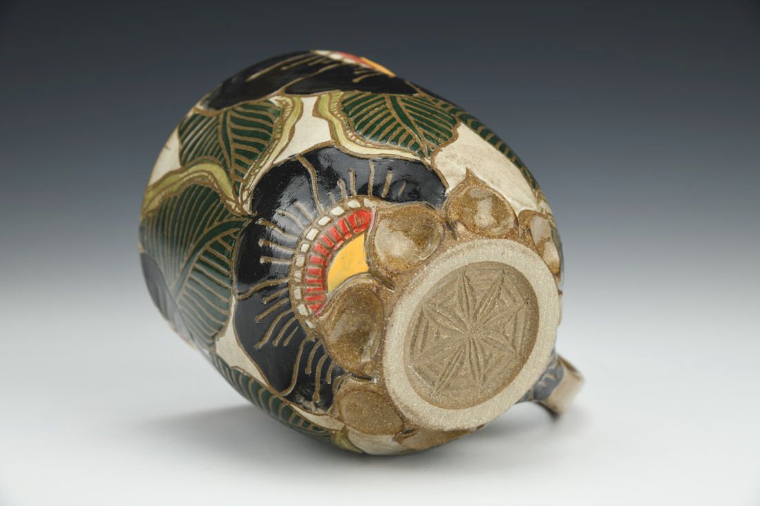 Stoneware, wheel thrown, sgraffito, cone 6 oxidation fired, 4 x 5.5 x 4 inches.