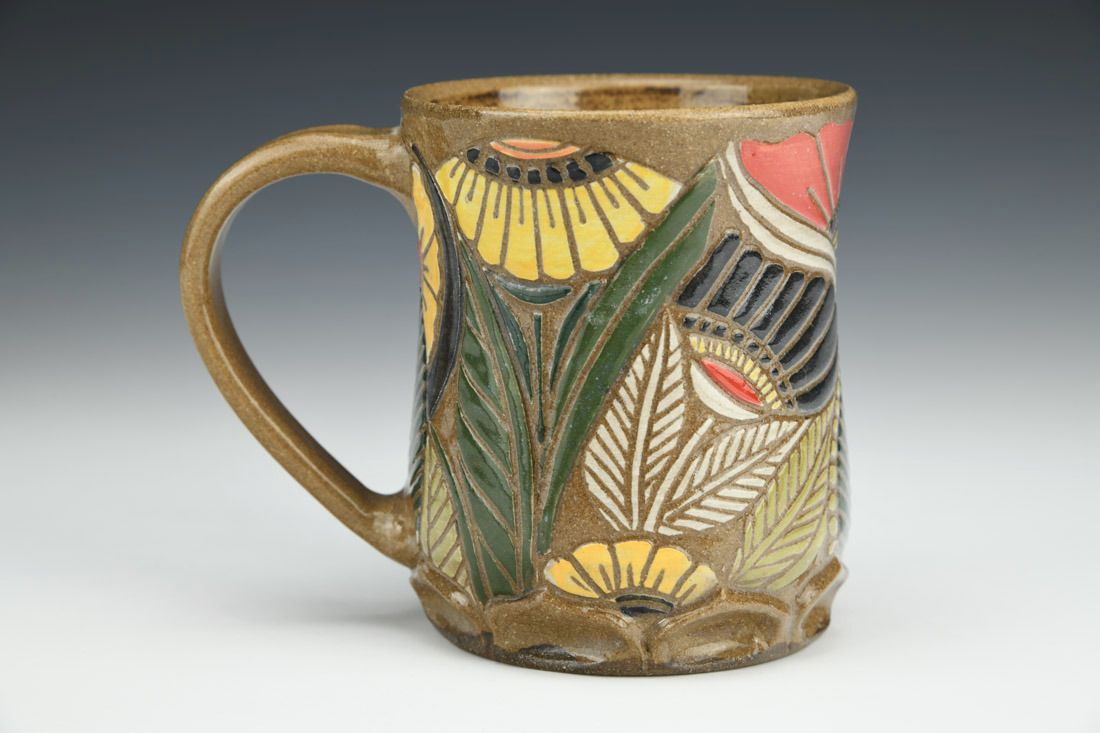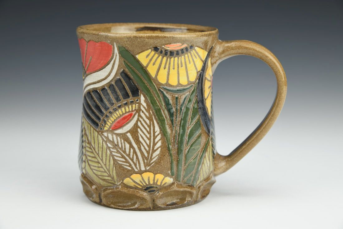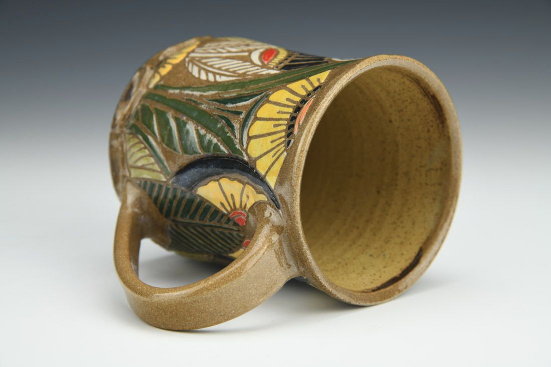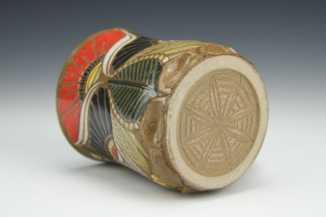 Stoneware, wheel thrown, sgraffito, cone 6 oxidation fired, 4 x 5 x 3.25 inches.