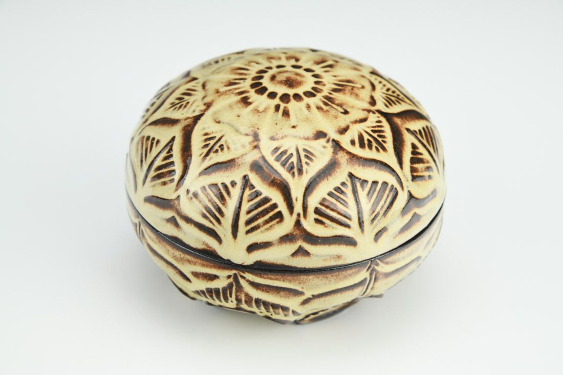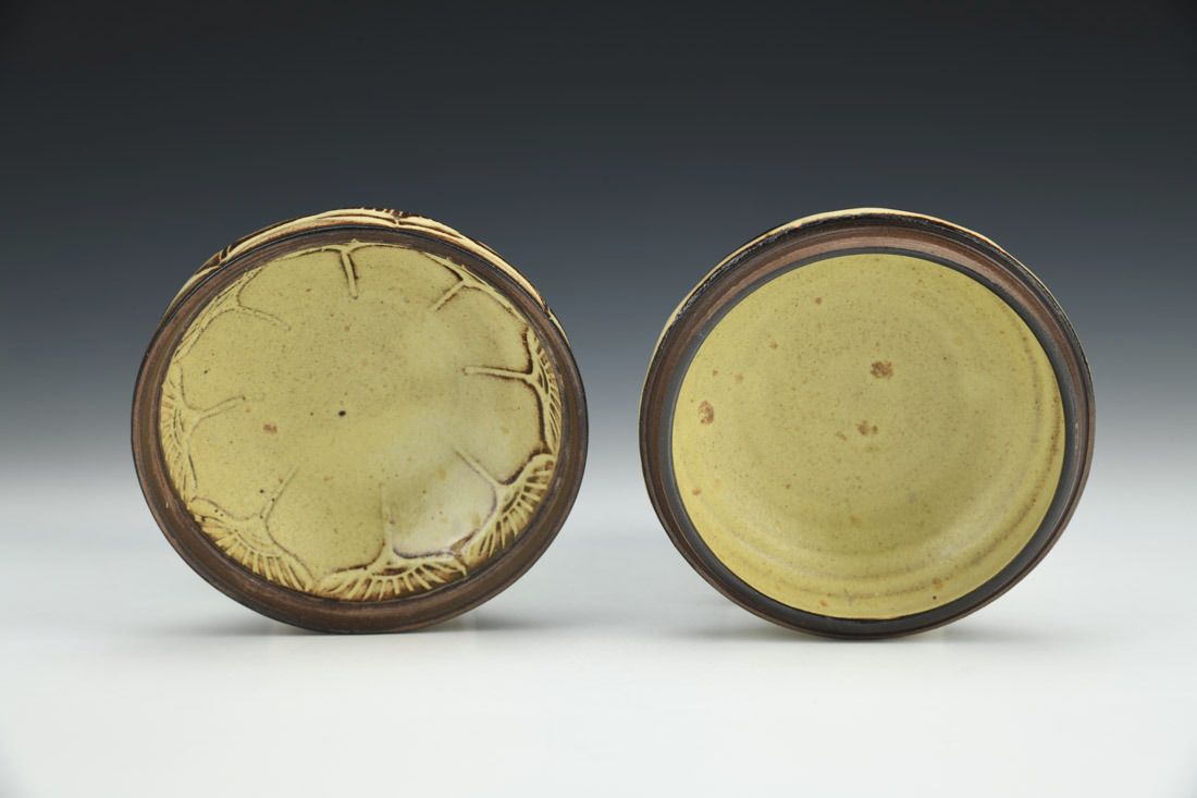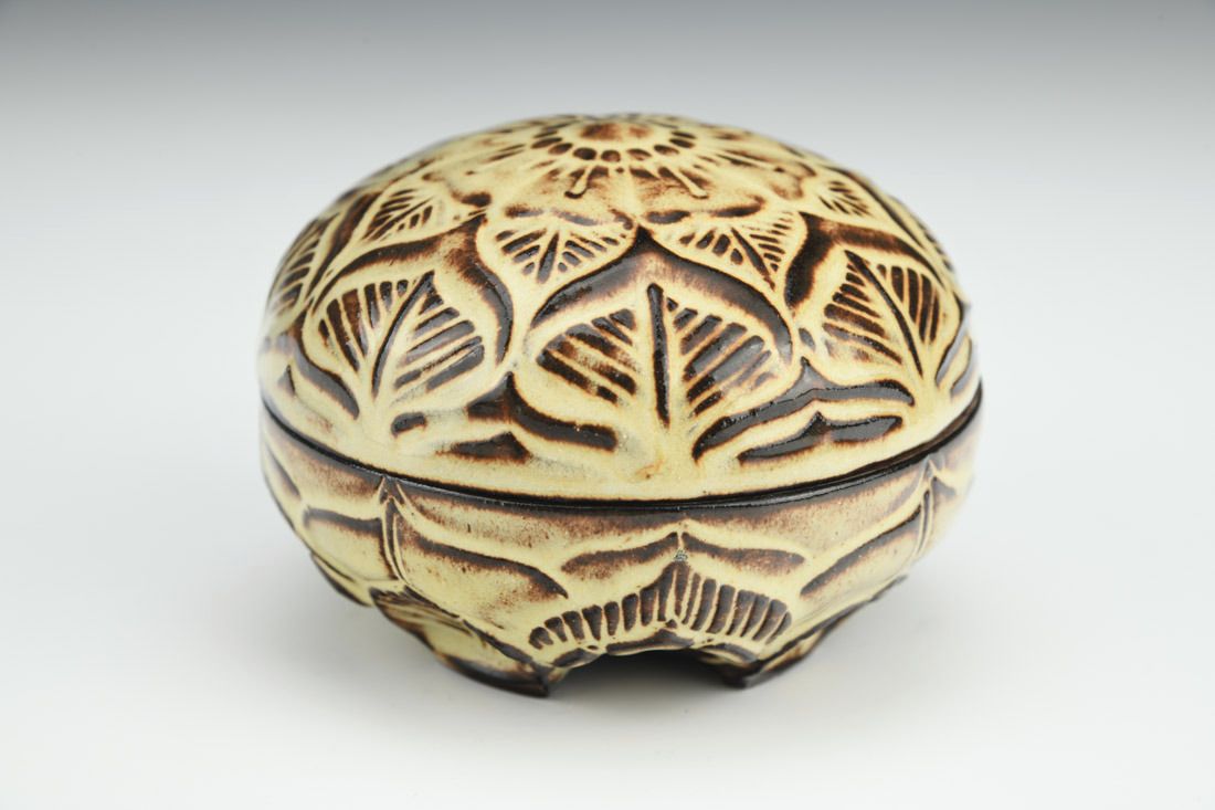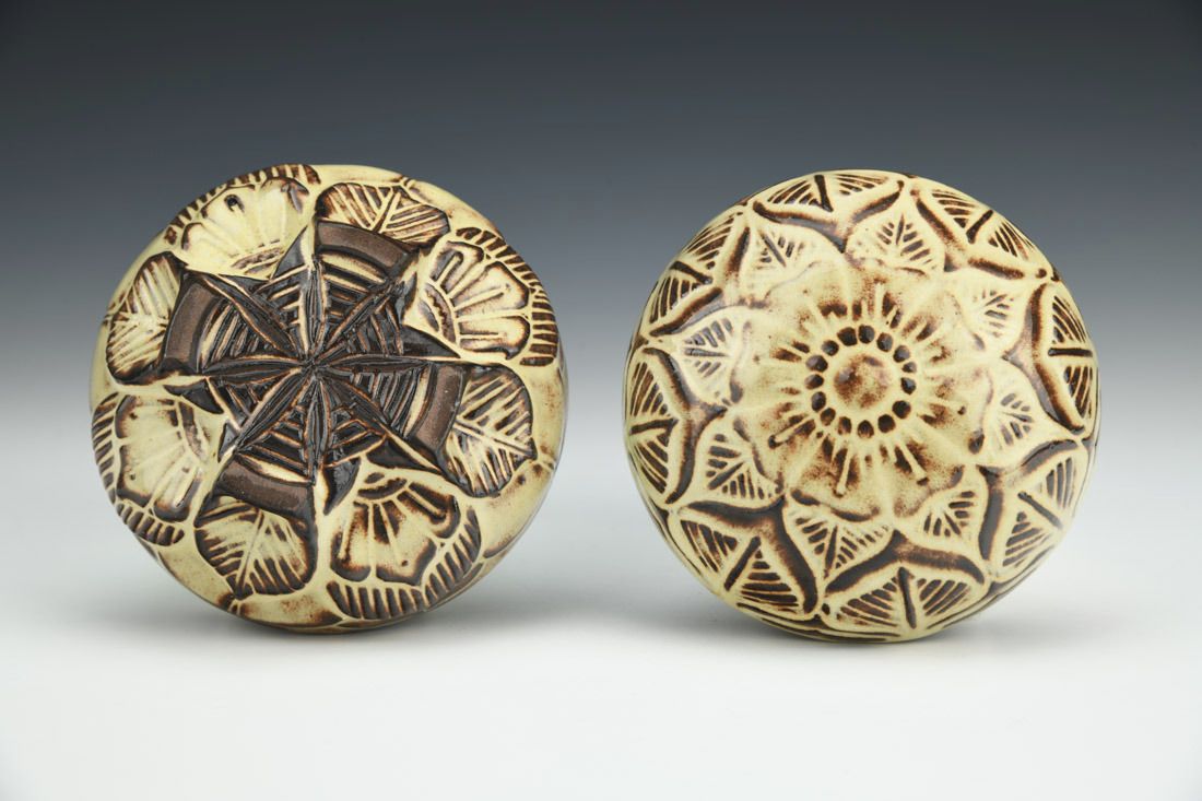 Chocolate clay, wheel thrown, carved, cone 5 oxidation fired, 3 x 3.5 x 3.5 inches.