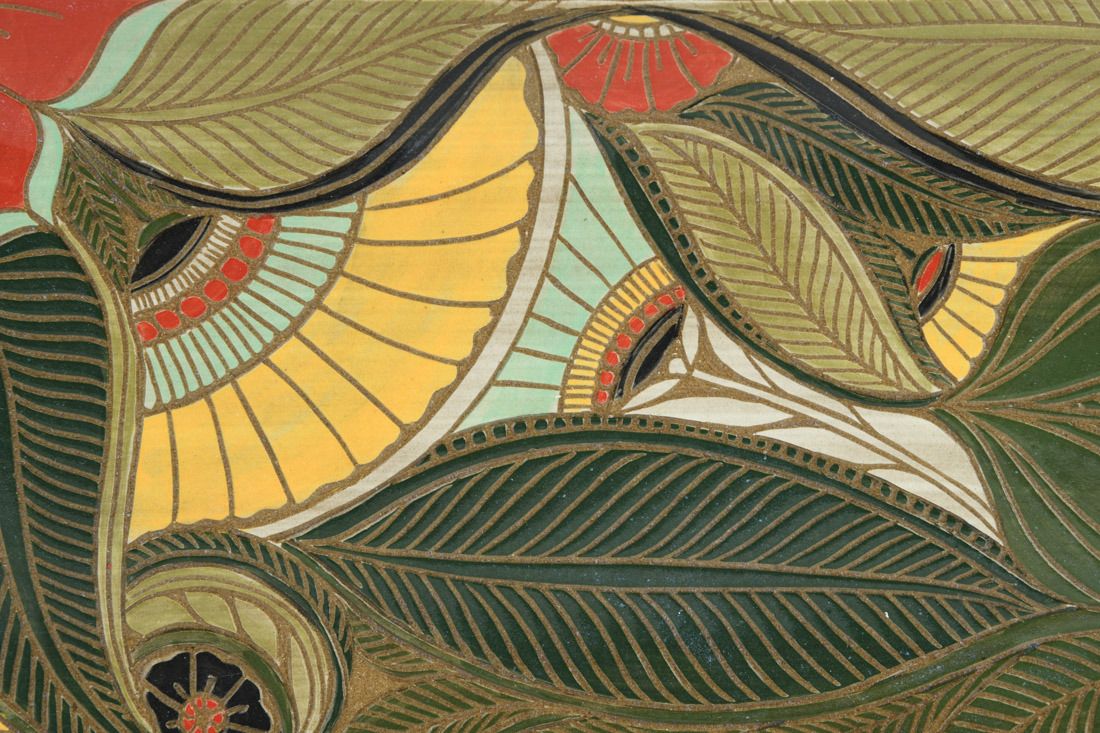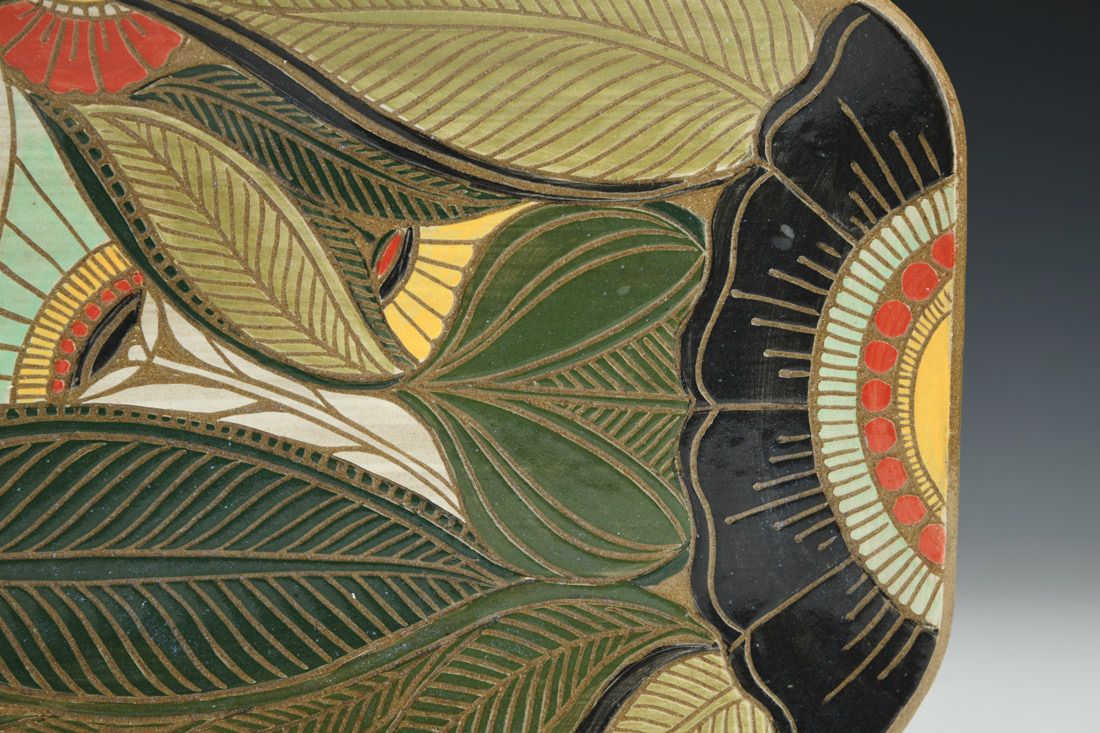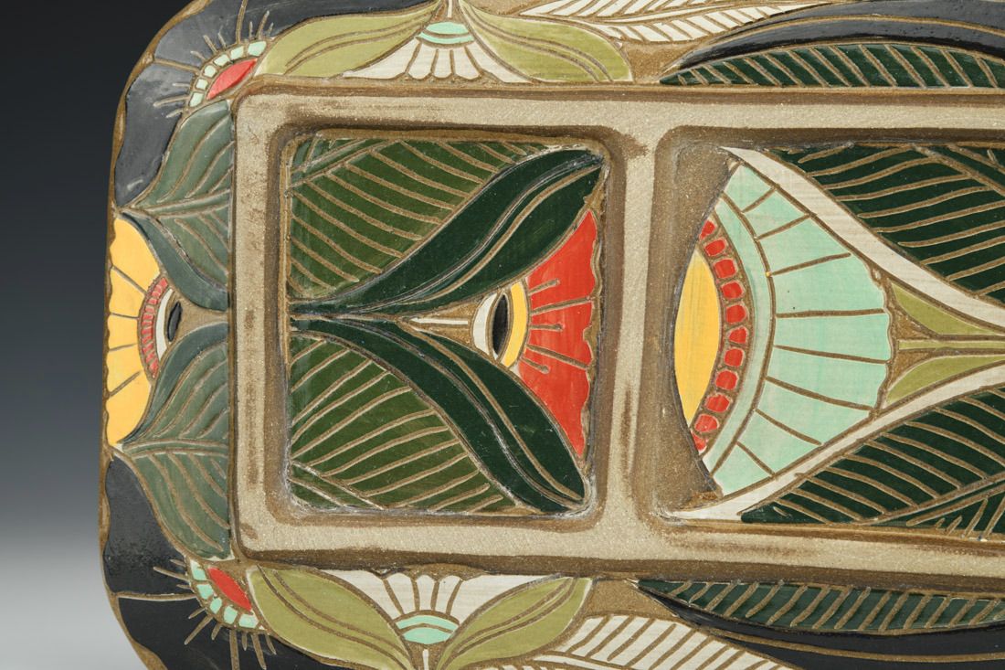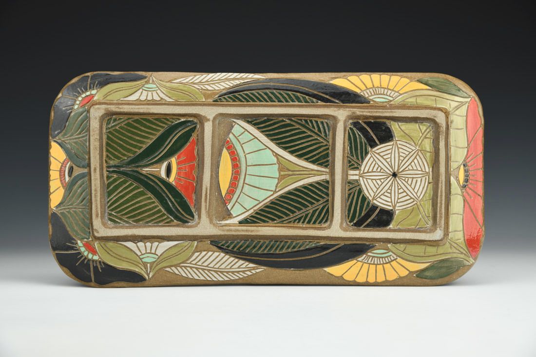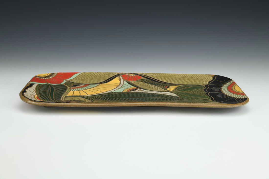 Stoneware, hand built, sgraffito, cone 6 oxidation fired, 1 x 7 x 14.5 inches.