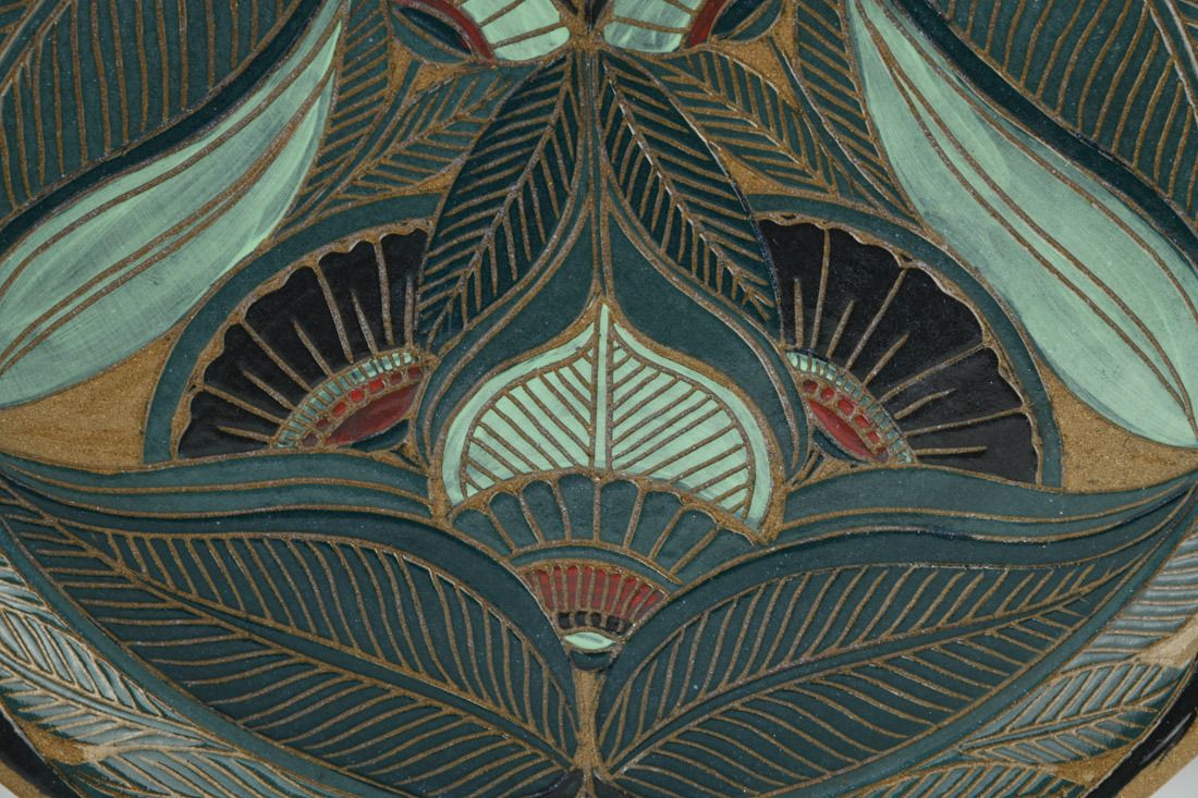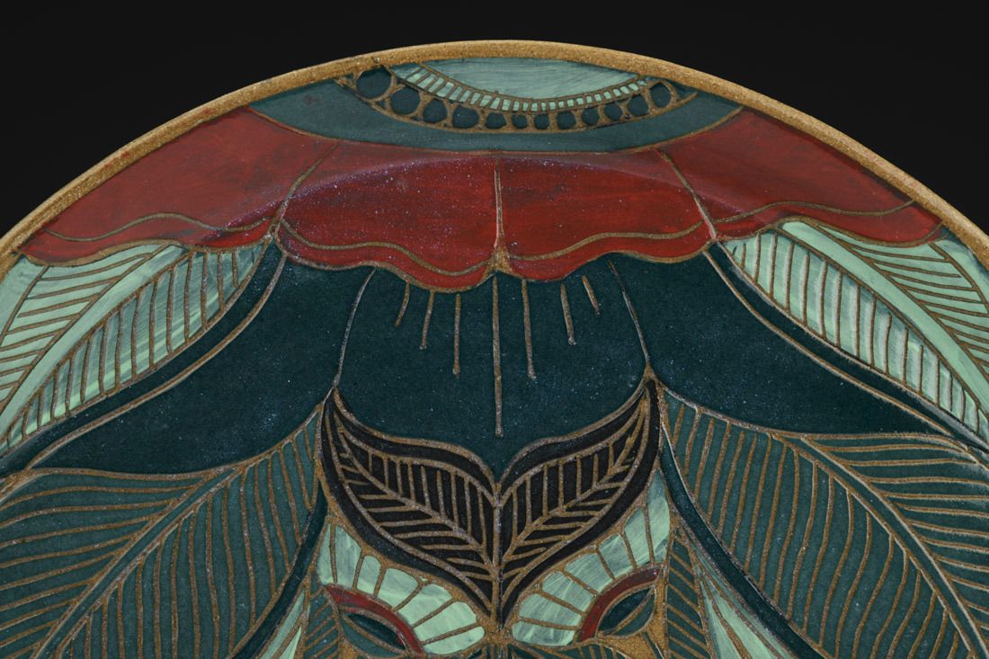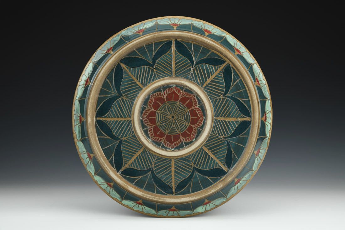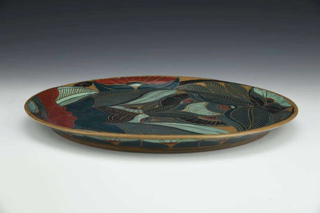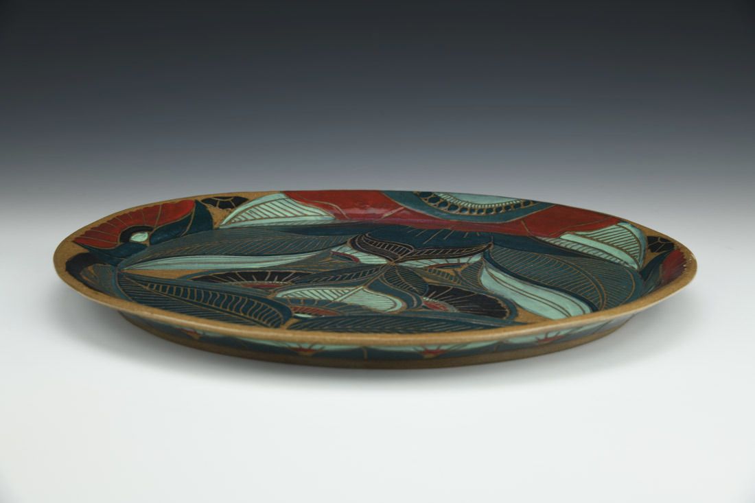Stoneware, hand built, sgraffito, cone 6 oxidation fired, 1 x 13.25 x 13.25 inches.