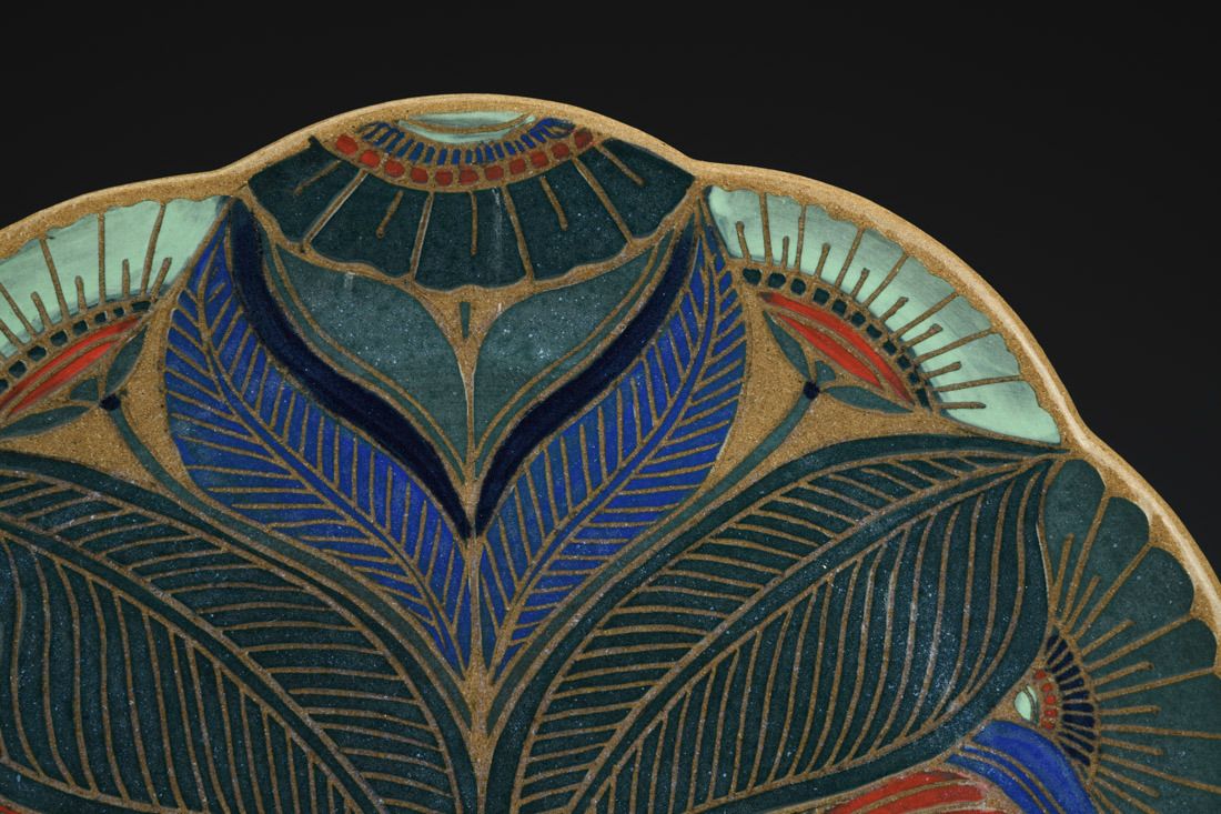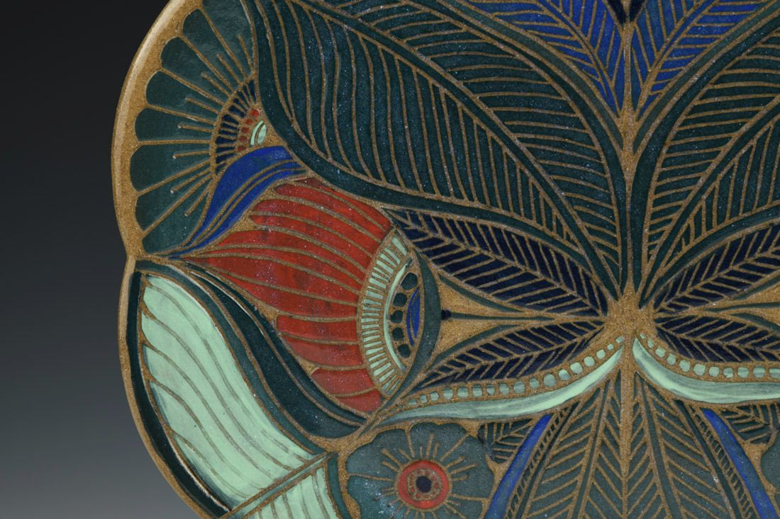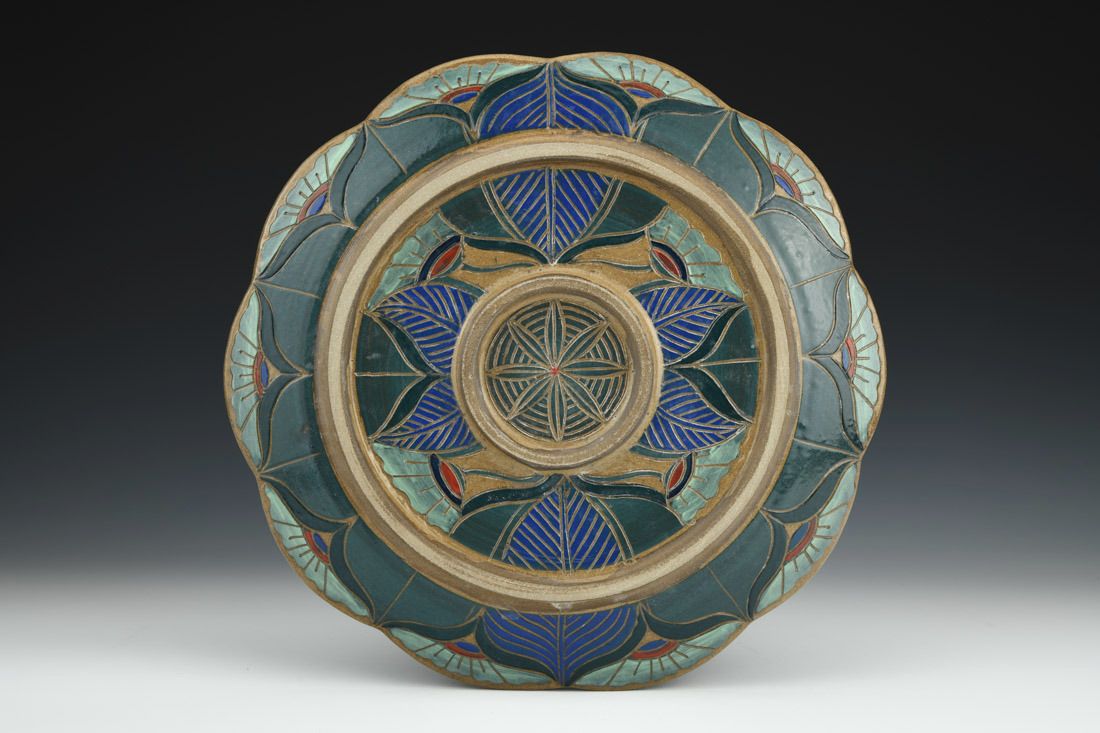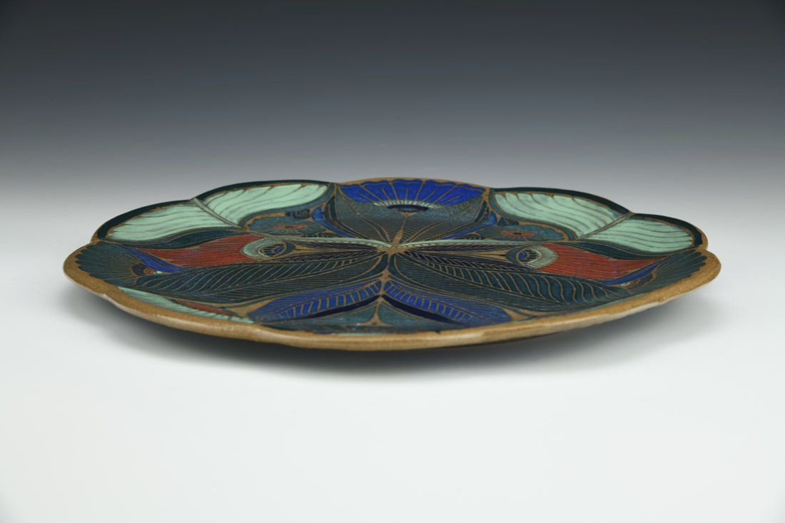 Stoneware, hand built, sgraffito, cone 6 oxidation fired, 0.75 x 12 x 12 inches.