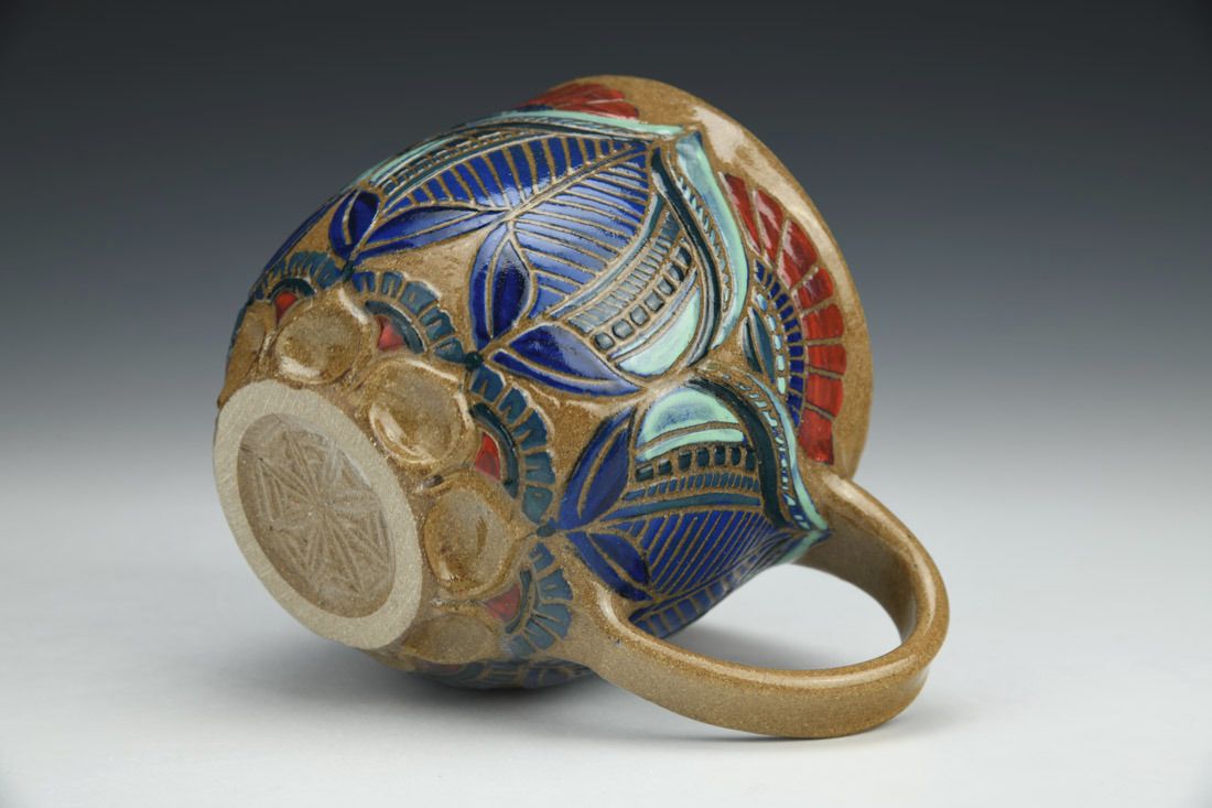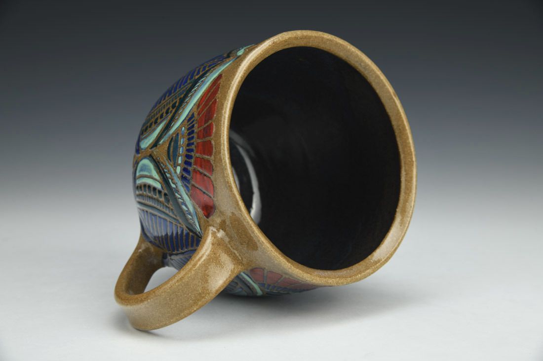 Stoneware, wheel thrown, sgraffito, cone 6 oxidation fired, 3.75 x 5.5 x 4 inches.