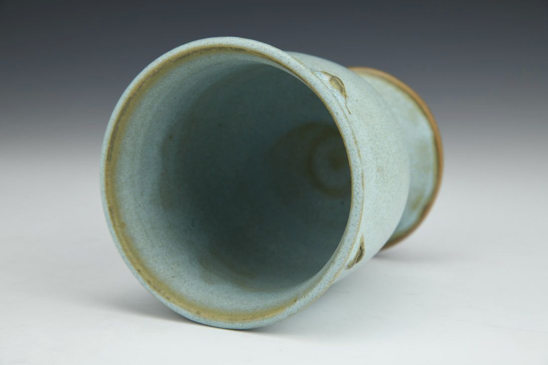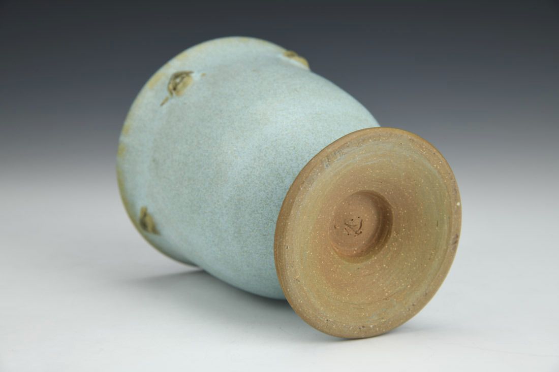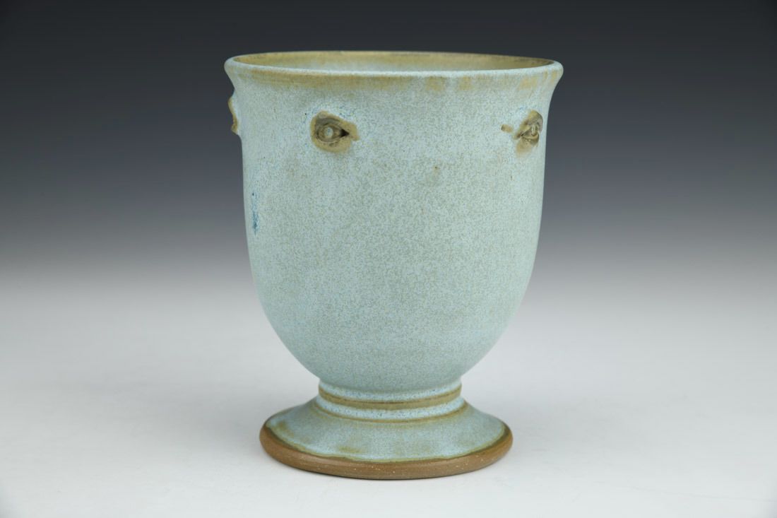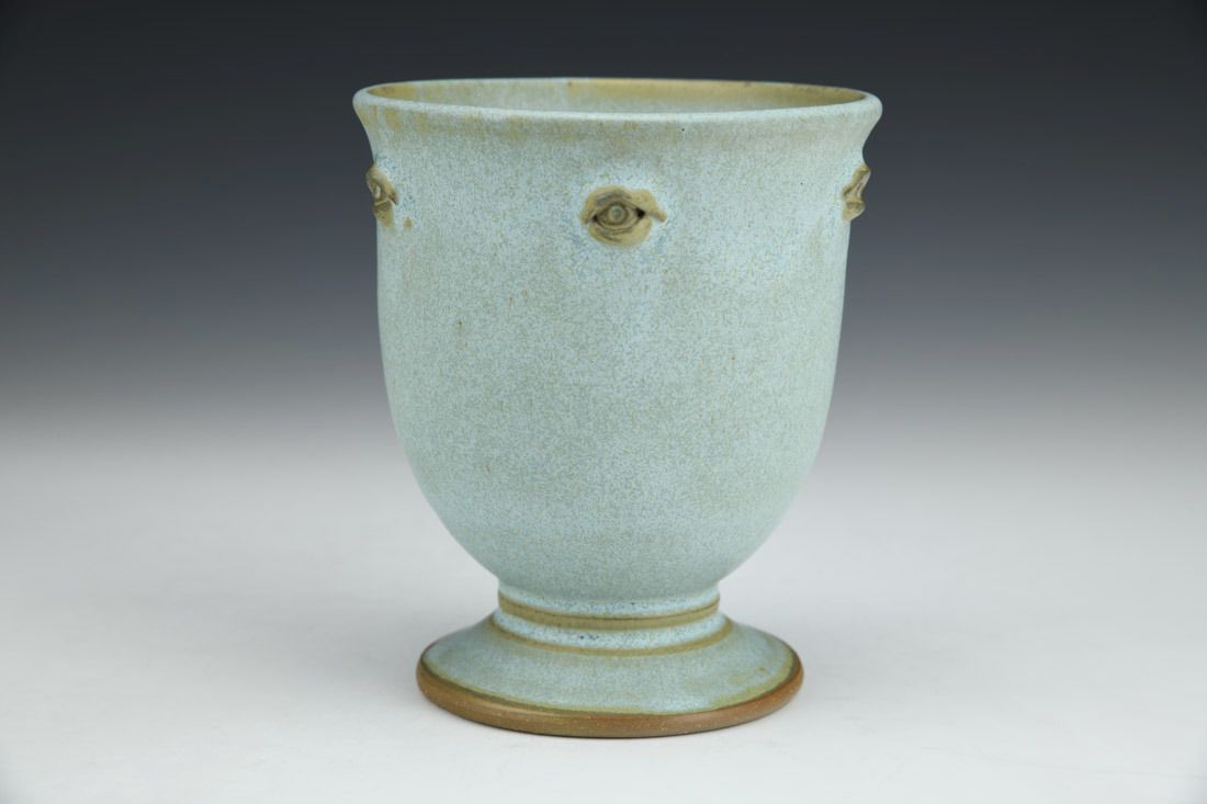 White stoneware, wheel thrown with sculpted elements, glazes, cone 7 oxidation fired, 4.75 x 4 x 4 inches.