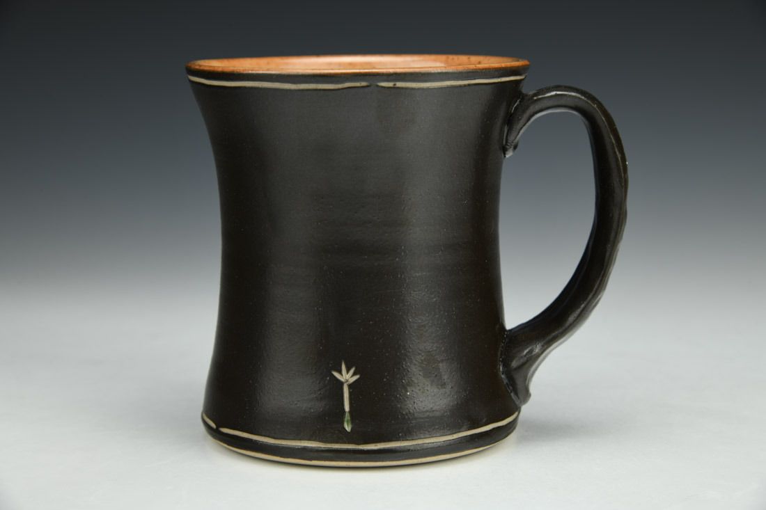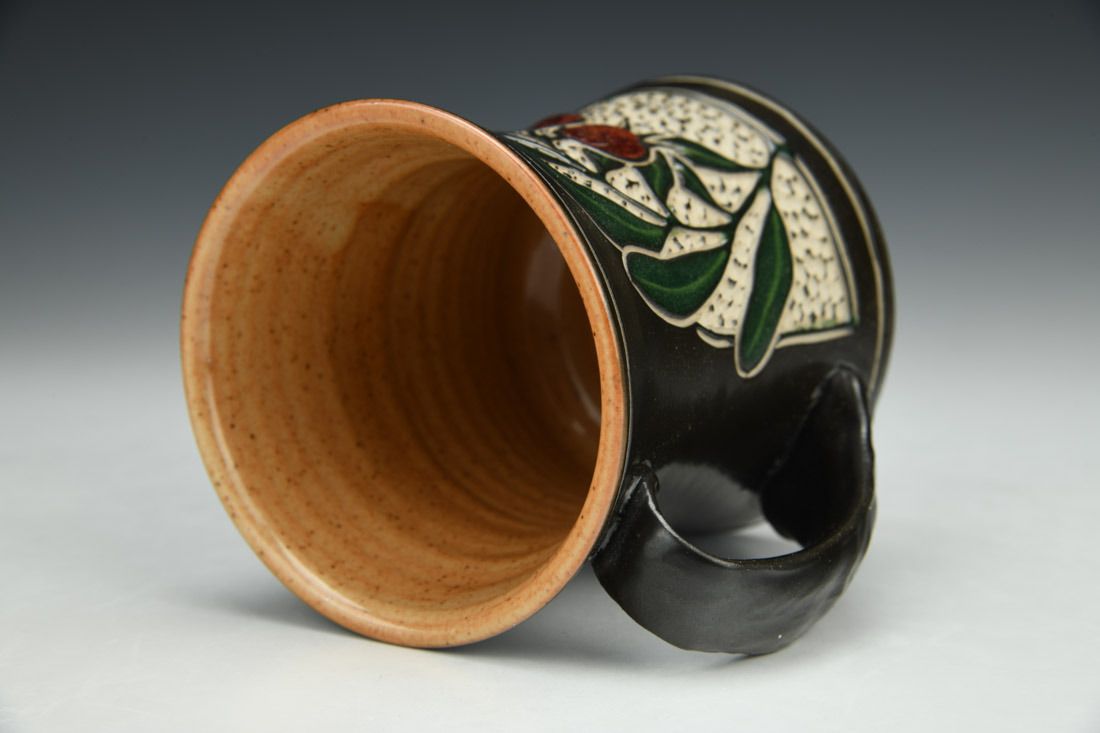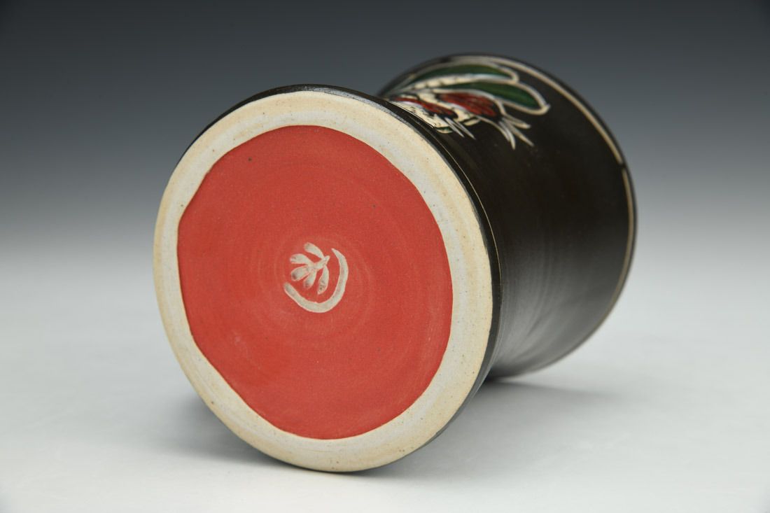 Stoneware, wheel thrown, slip, sgraffito, glaze inlay, cone 10 gas reduction fired, 4 x 4.5 x 3.5 inches.