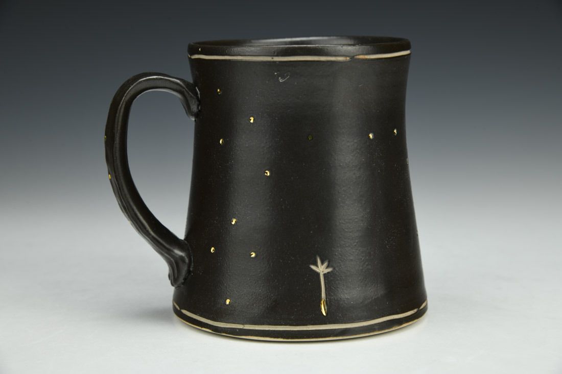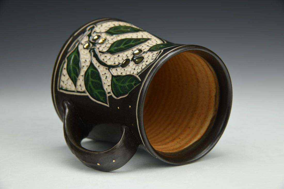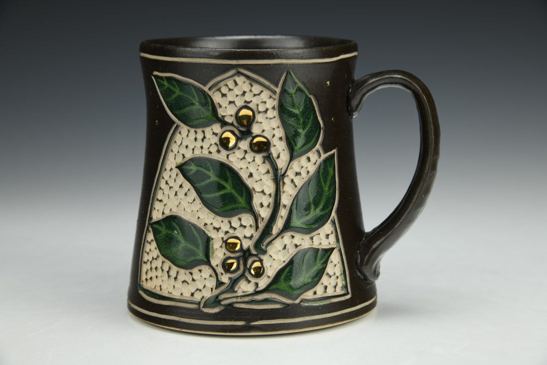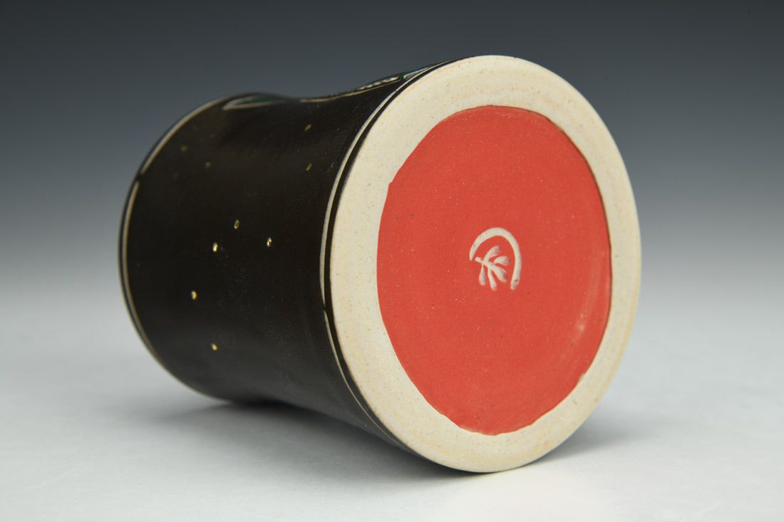 Stoneware, wheel thrown, slip, sgraffito, glaze inlay, gold luster, cone 10 gas reduction fired, 4 x 4.5 x 3.5 inches.
